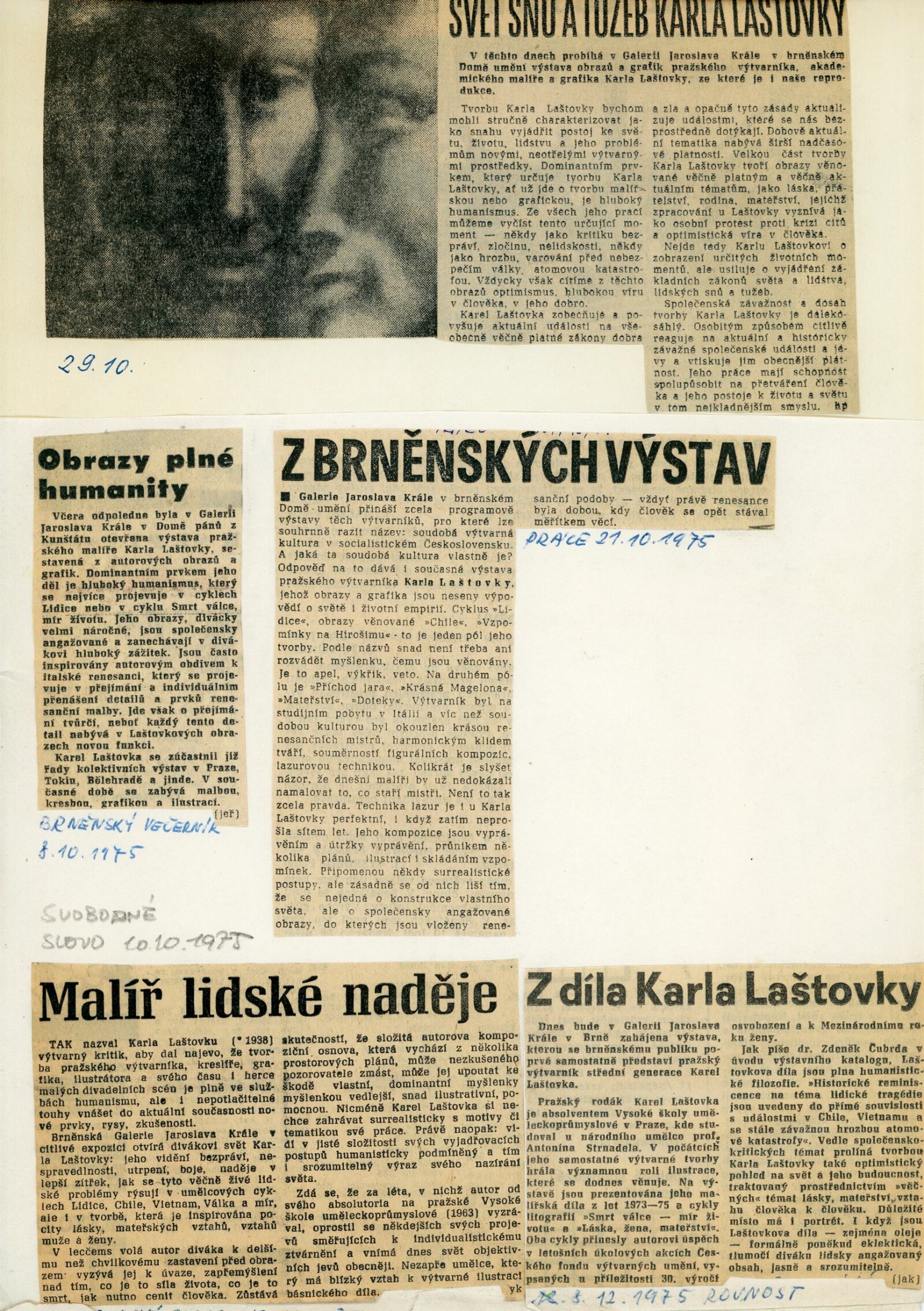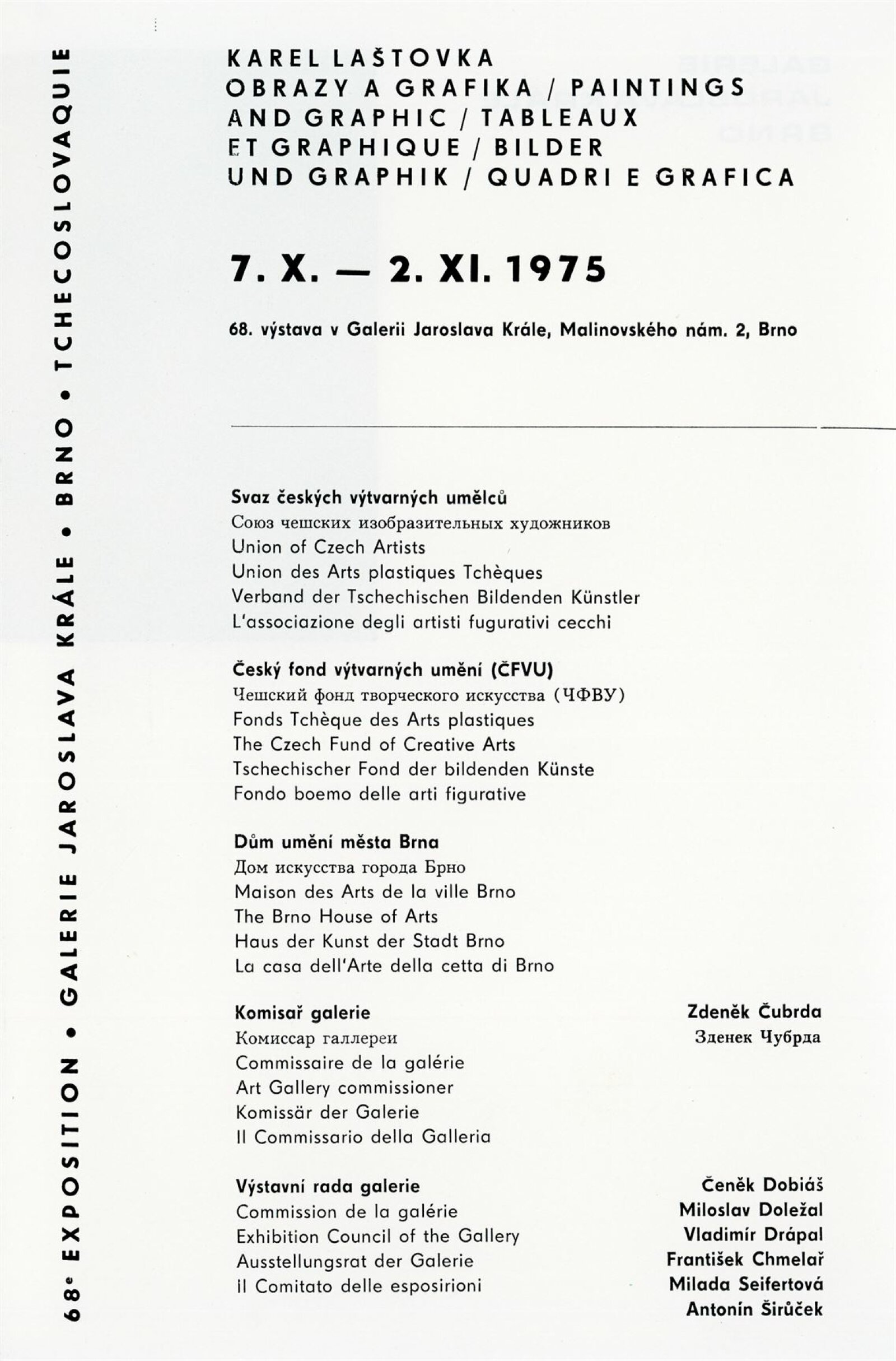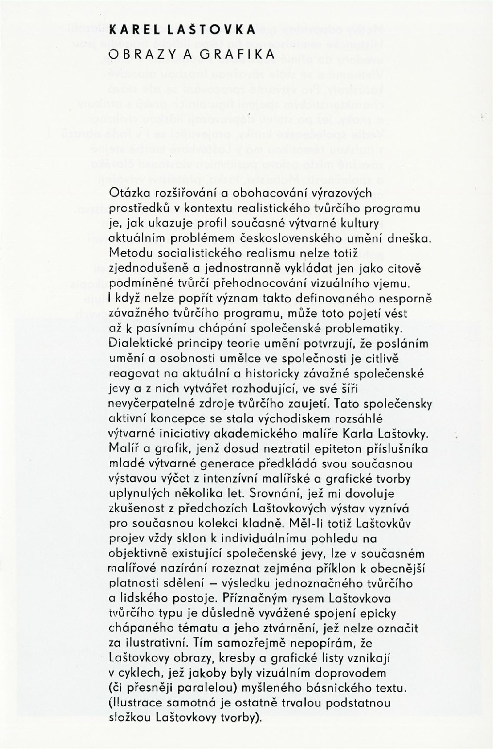 Karel Laštovka. Obrazy a grafika: Dům umění, 68. výstava v Galerii Jaroslava Krále, 7. 10. – 2. 11. 1975 / Text: Zdeněk Čubrda. – Brno: ČFVU, 1975. – 10 s., obr., seznam vystavených prací 2 s., portrét, životopis, DU 627. – MZK; MG; MMB