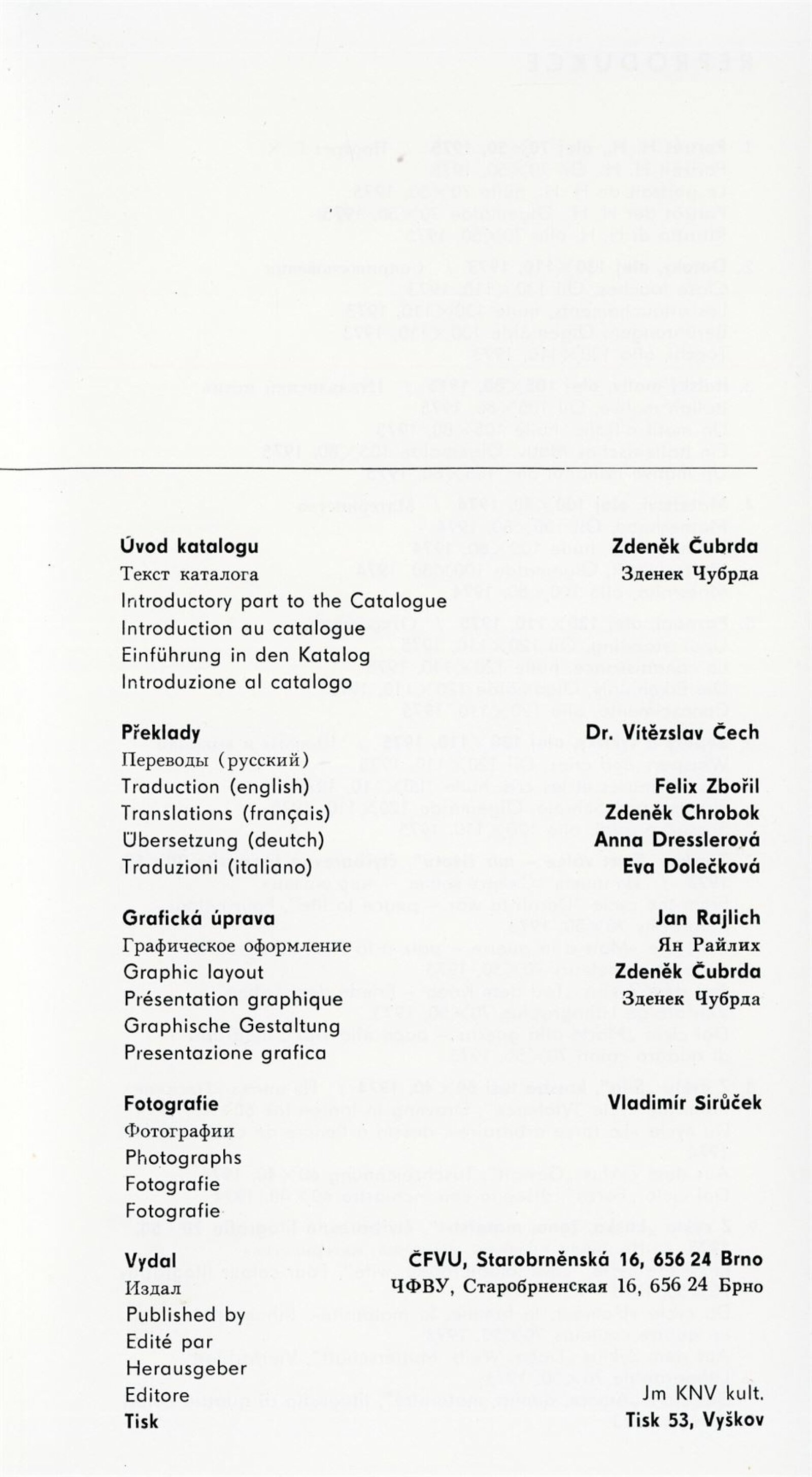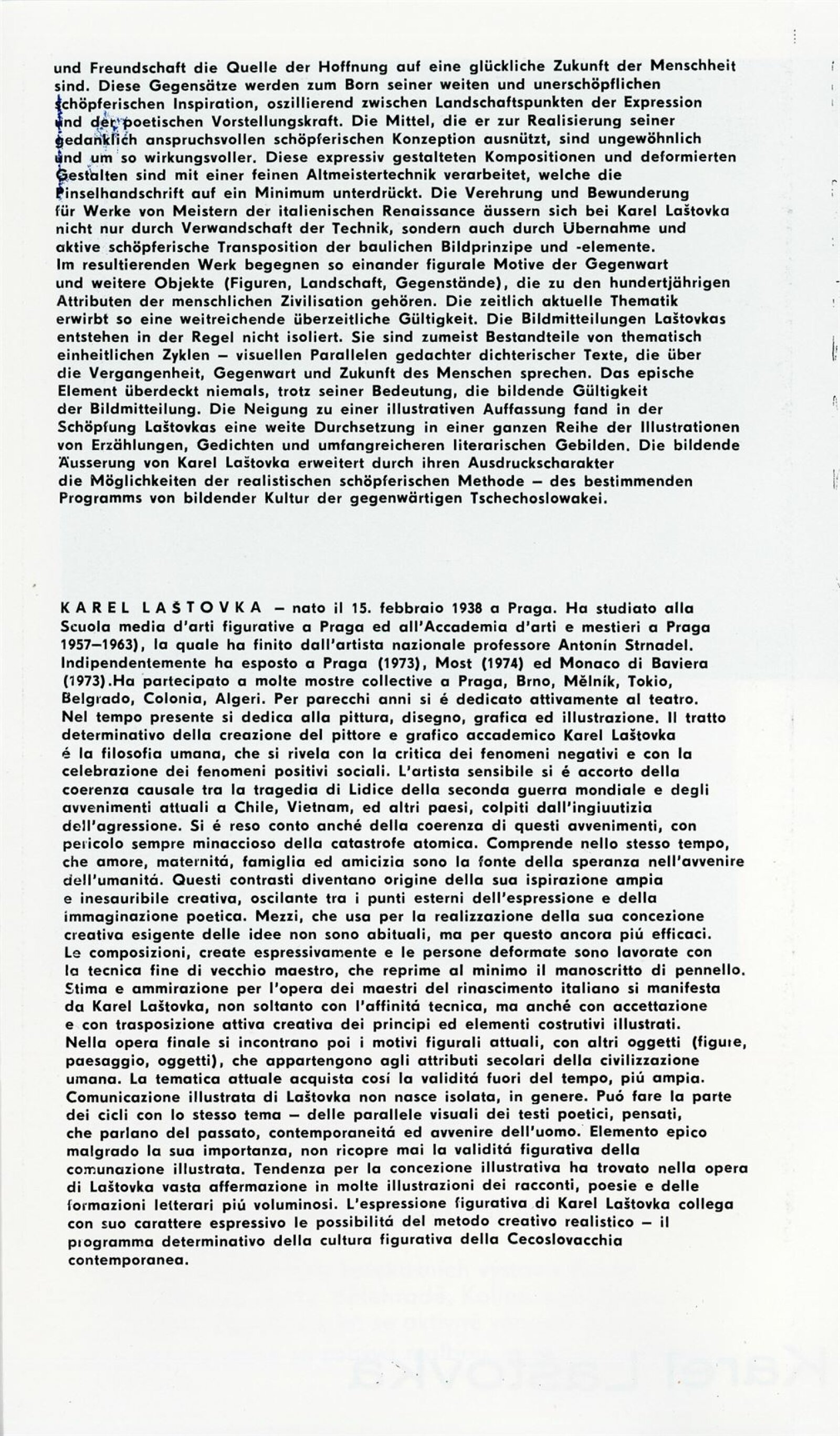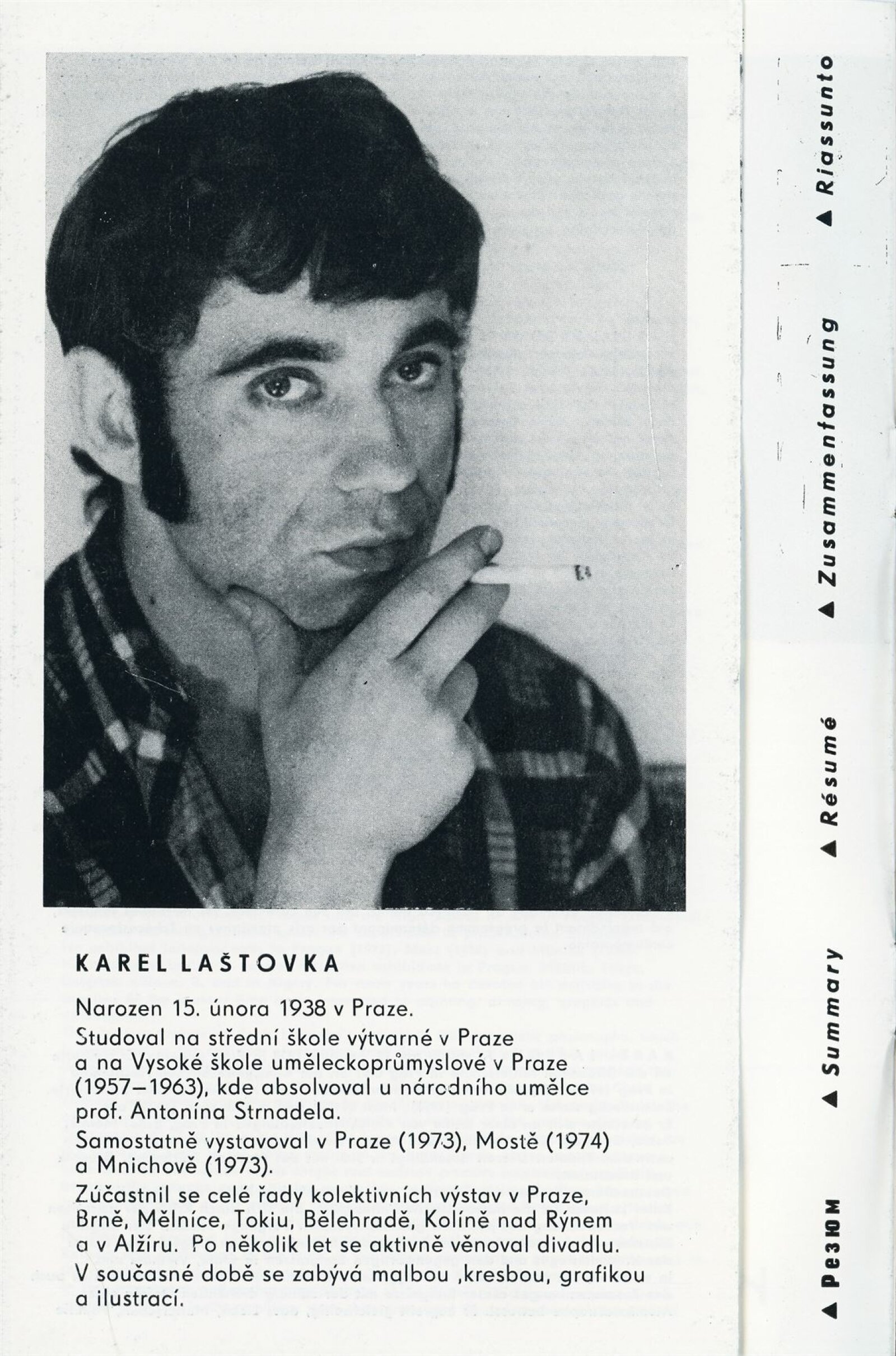 Karel Laštovka. Obrazy a grafika: Dům umění, 68. výstava v Galerii Jaroslava Krále, 7. 10. – 2. 11. 1975 / Text: Zdeněk Čubrda. – Brno: ČFVU, 1975. – 10 s., obr., seznam vystavených prací 2 s., portrét, životopis, DU 627. – MZK; MG; MMB