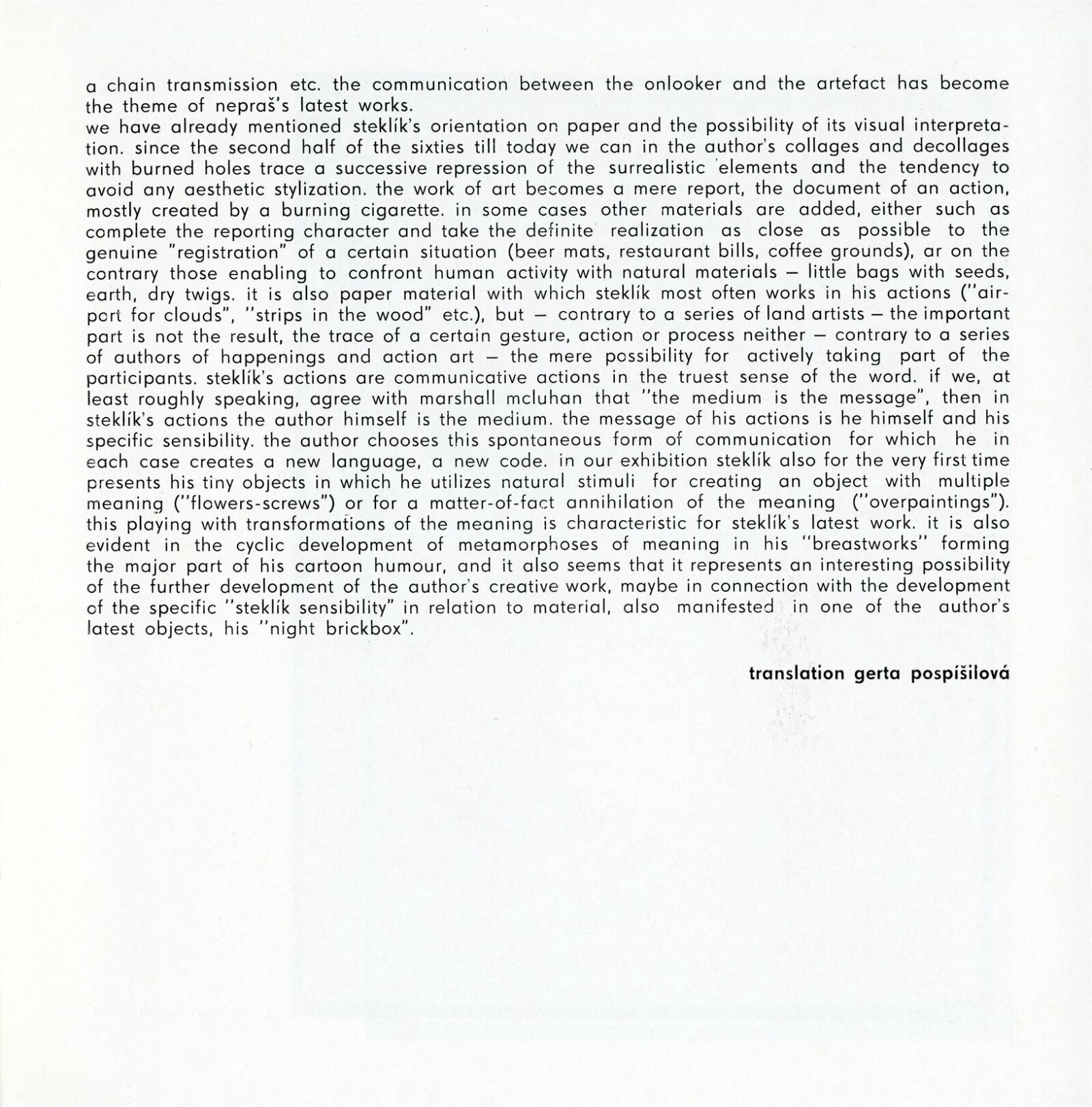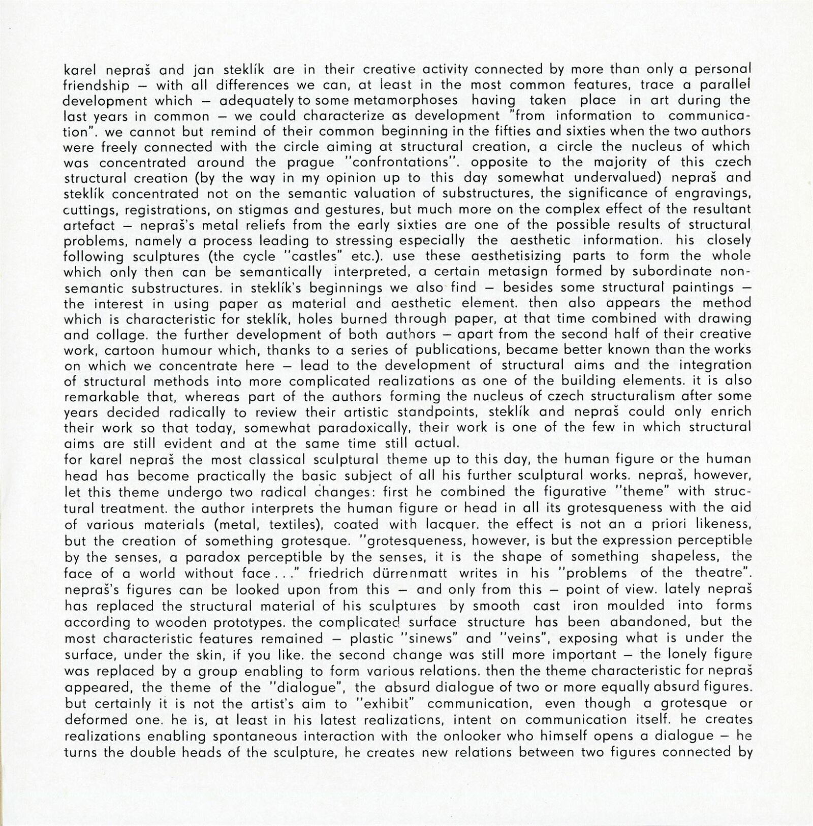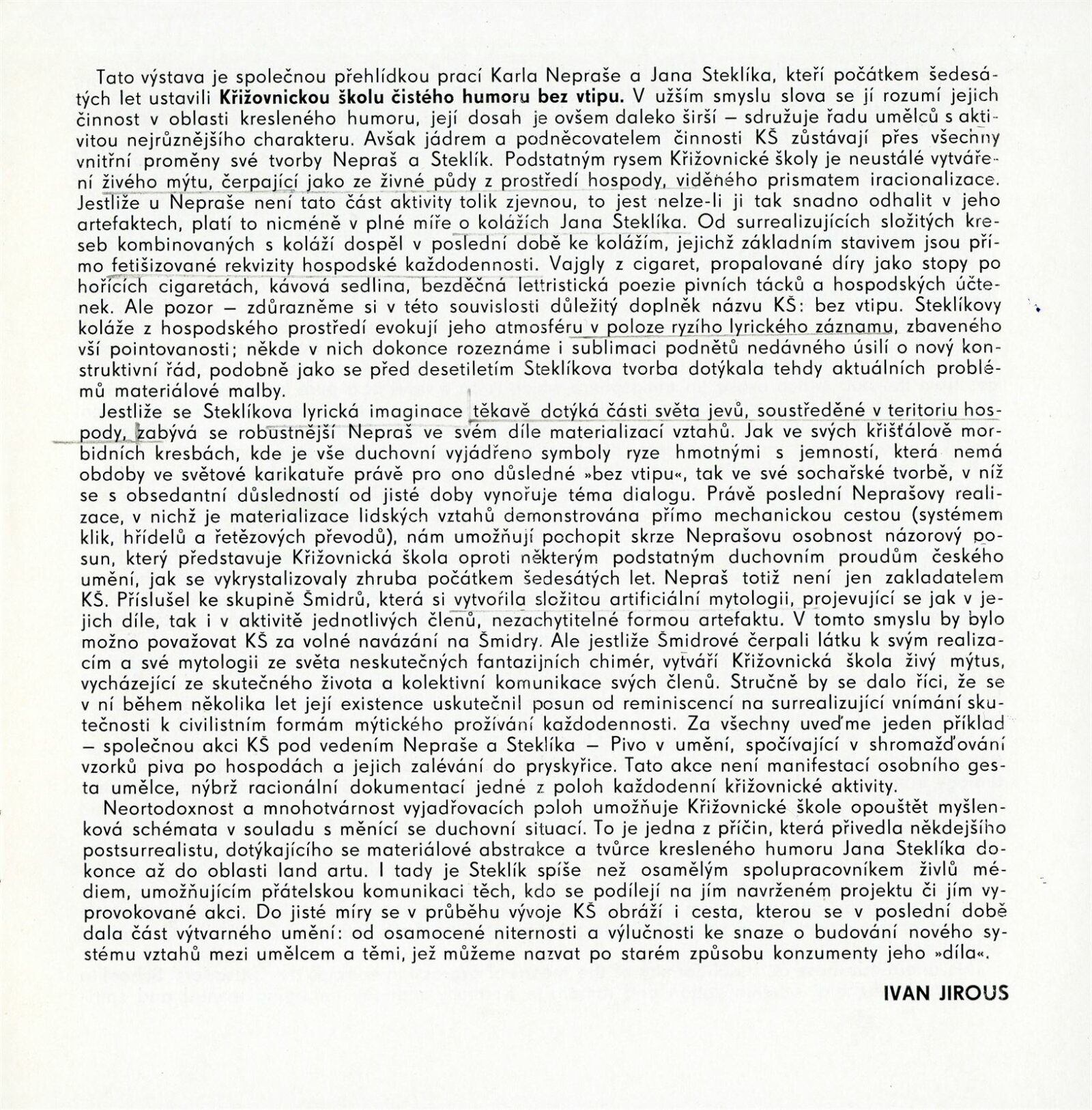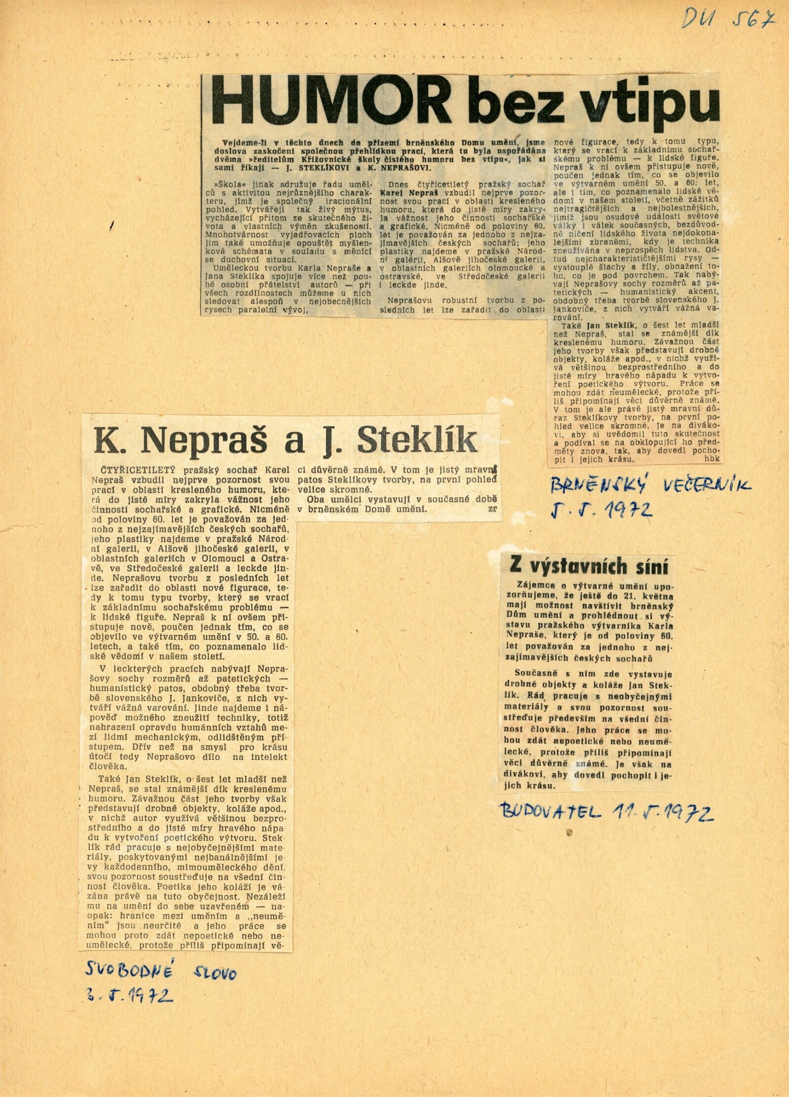 Karel Nepraš, KŠ, Jan Steklík, KŠ: Dům umění města Brna, hala, 15. 4. – 21. 5. 1972 / Texty: Ivan Jirous, Jiří Valoch. – Brno: DUmB, 1972. – 16 s., obr., DU 567. – MZK; MG