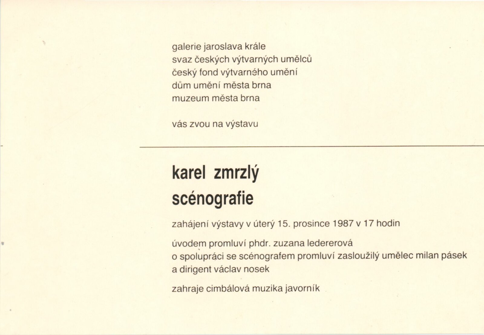 Karel Zmrzlý. Scénografie: Dům umění, 134. výstava Galerie Jaroslava Krále, 15. 12. 1987 – 3. 1. 1988 / Text: Zuzana Ledererová. – Brno: SČVU, 1987. – [12] s., obr., 1 l. seznamu vystavených inscenací, portrét, životopis, DU 846. – MZK