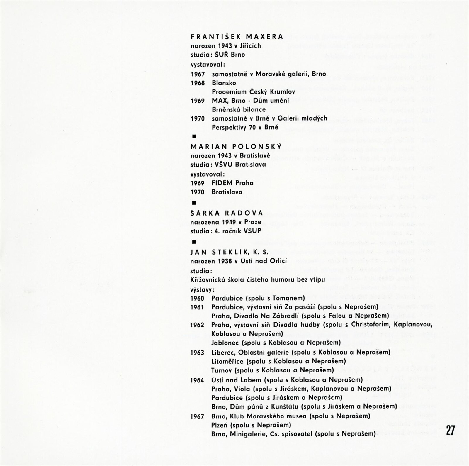 pozvánka, katalog, seznam vystavených děl, fotografie z instalace, korespondence členů MPVU (návrh koncepce – František Maxera, Dušan Klimeš, Jiří Valoch a DU), provozní korespondence, anotace výstavy, žádost o povolení výstavy, recenze v tisku
