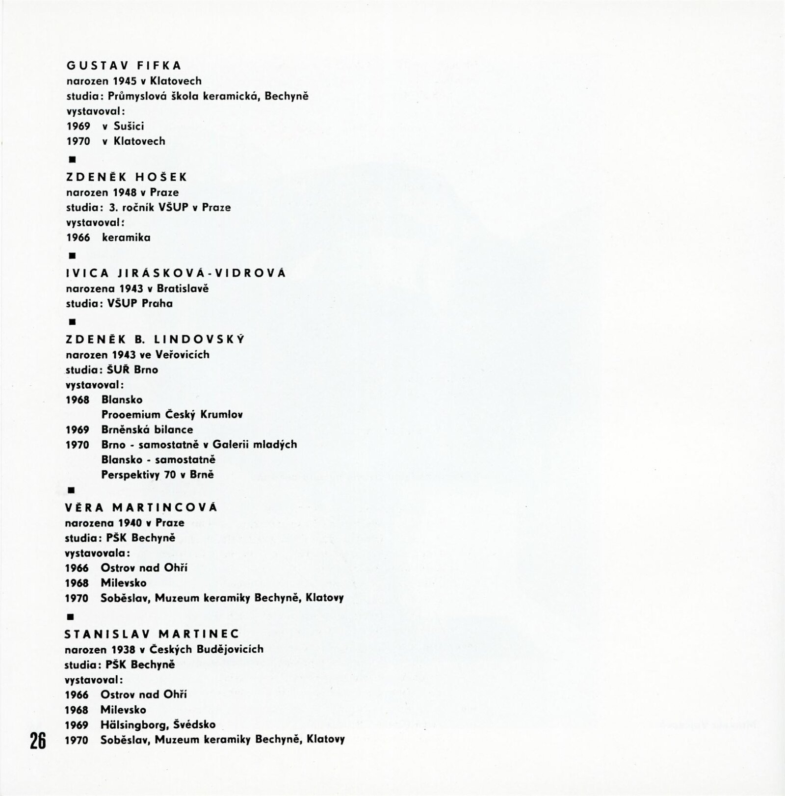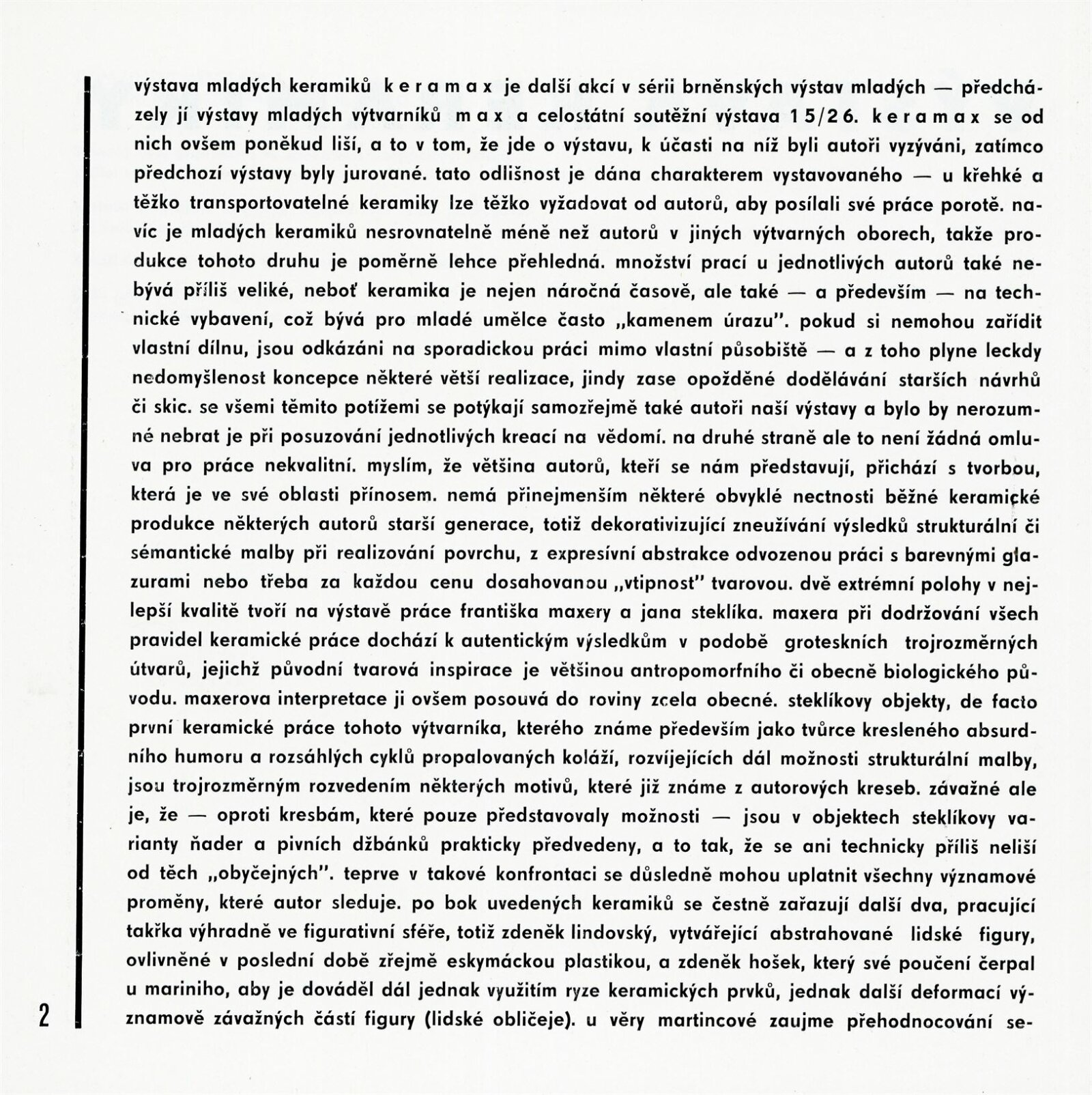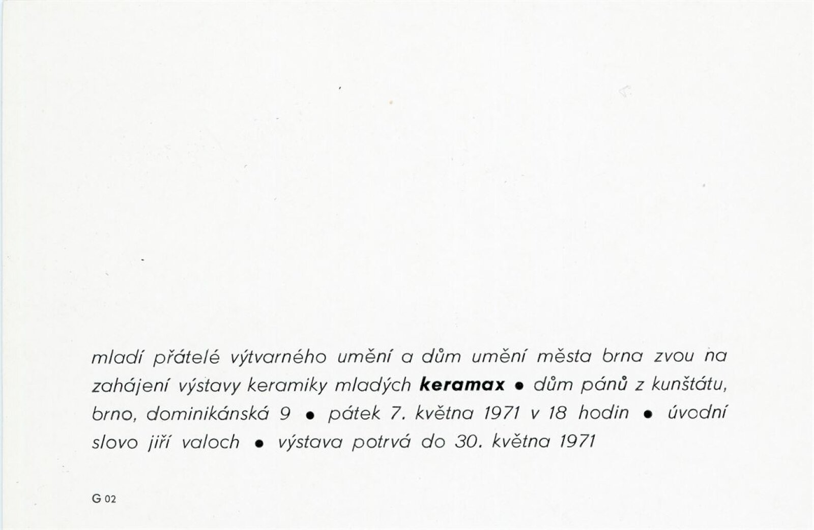 Keramax. Výstava keramiky: Dům umění města Brna / Dům pánů z Kunštátu, 7. 5. – 30. 5. 1971 / Text: vch. – Brno: DUmB, 1971. – 28 s., obr., DPK 470. – MZK; MG