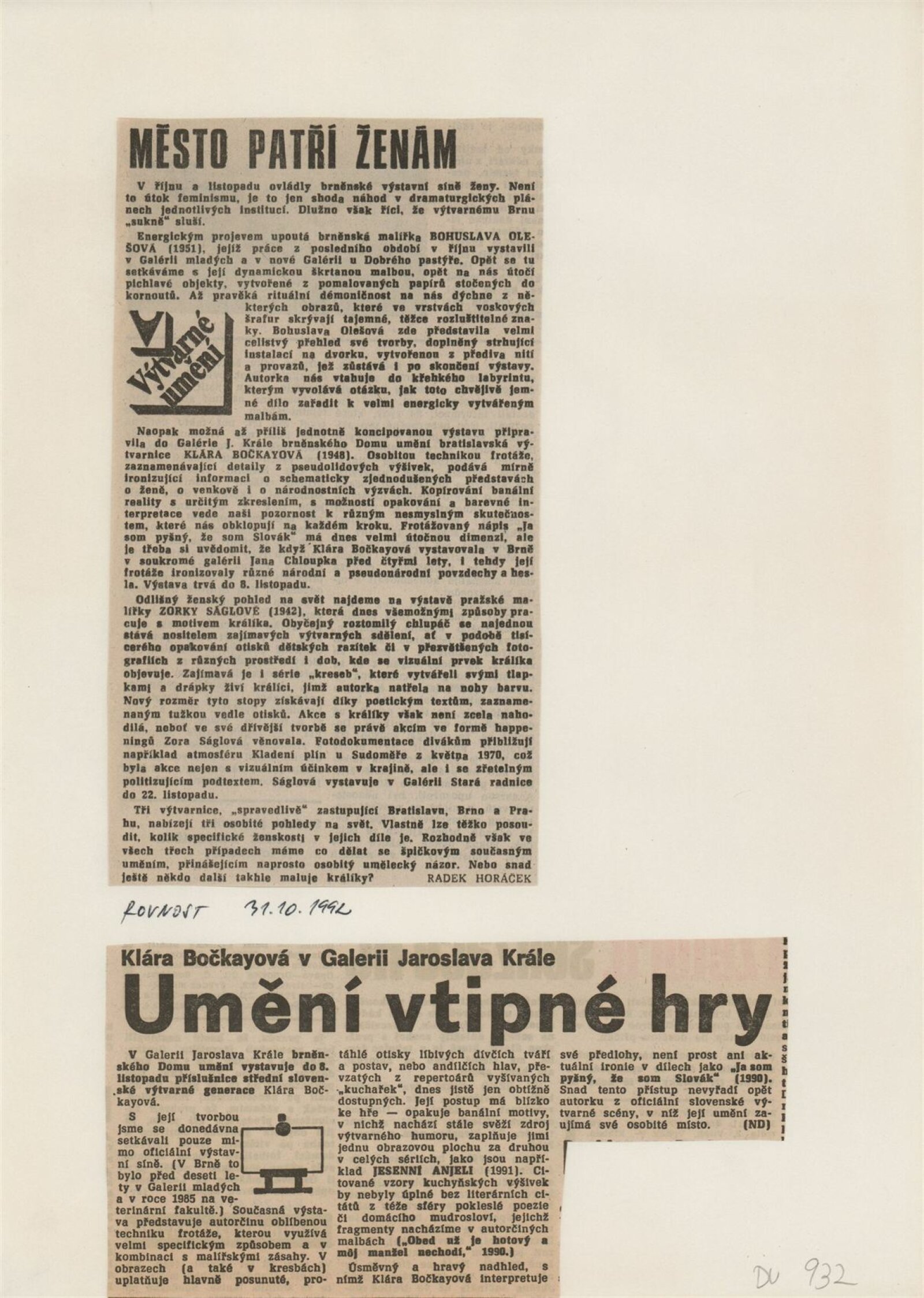 katalog, recenze v tisku, pozvánka na výstavu Kláry a Milana Bočkayových v Bruntálu (1992)