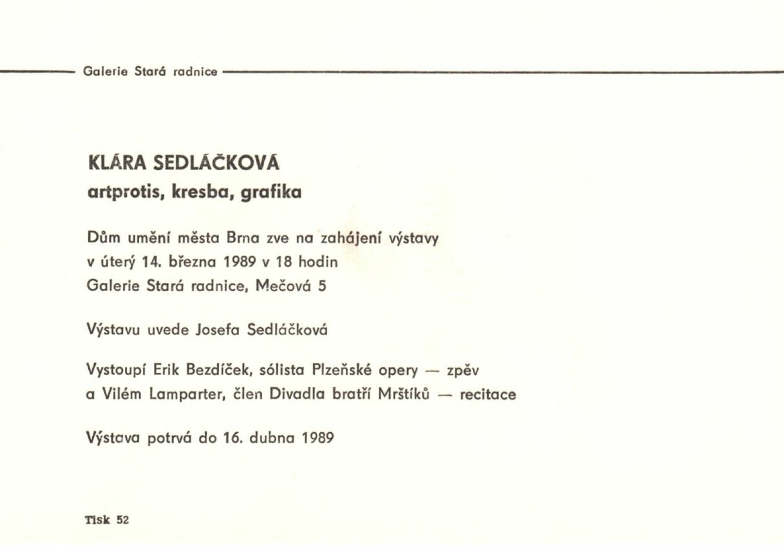 Klára Sedláčková. Artprotis, kresba, grafika: Galerie Stará radnice, 3. patro, 14. 3. – 16. 4. 1989 / Text: Josefa Sedláčková. – Brno: DUmB, 1989. – [13] s., obr., životní data, výstavy, ceny, realizace, GSR 44. – MZK; MG; MMB