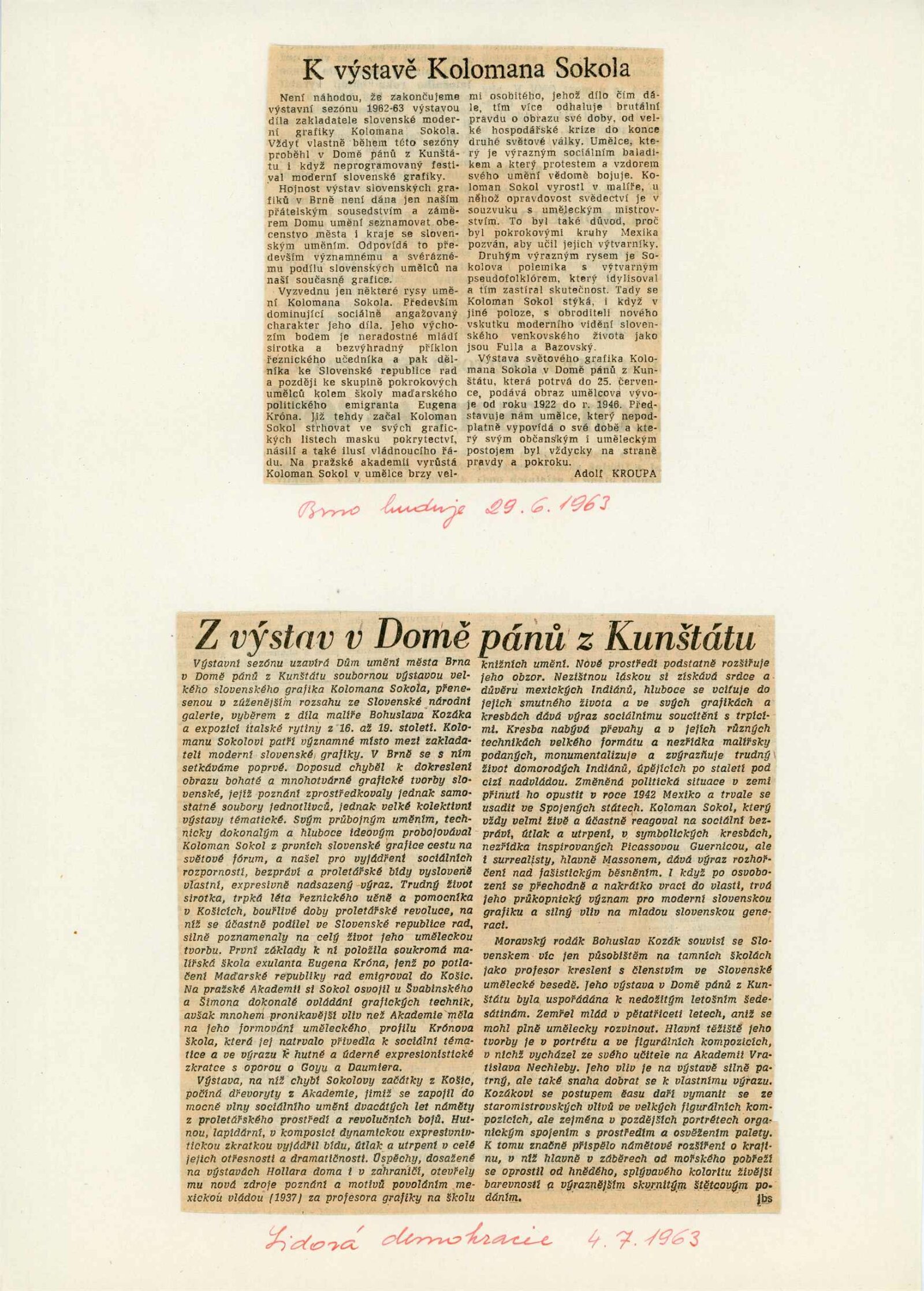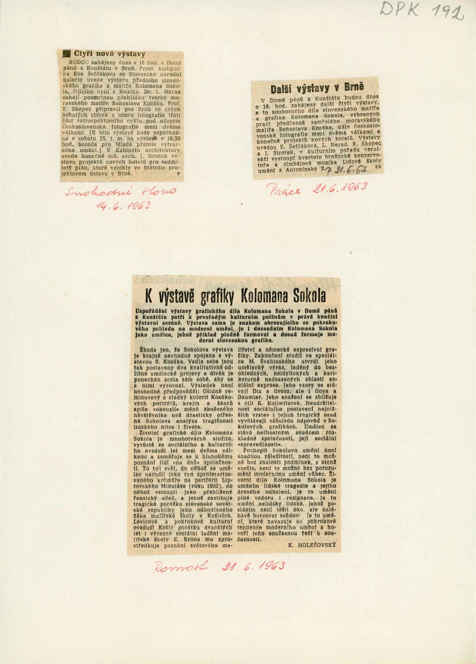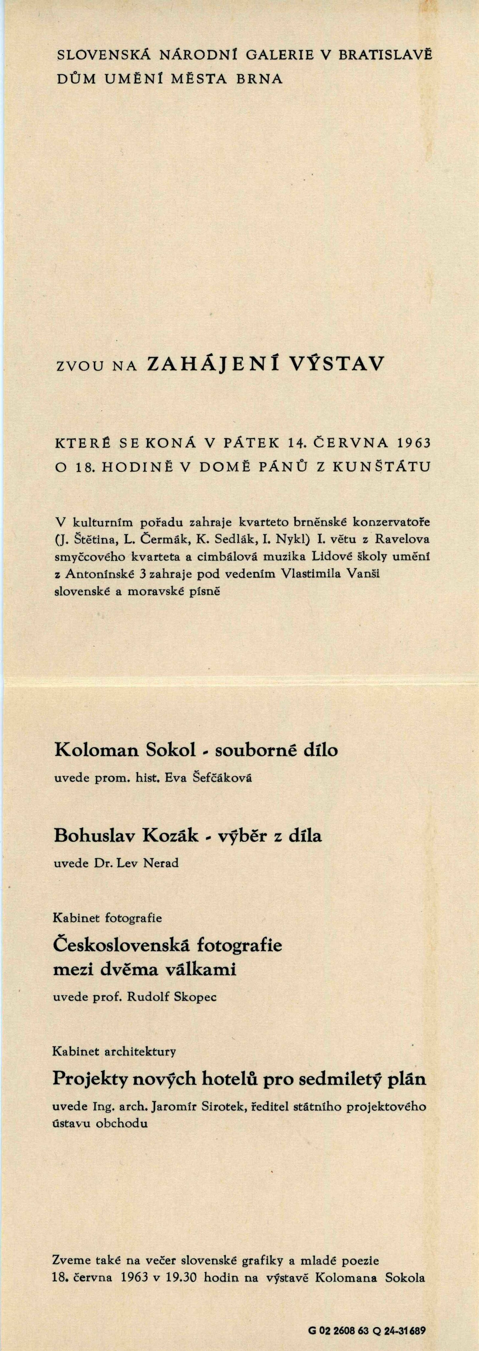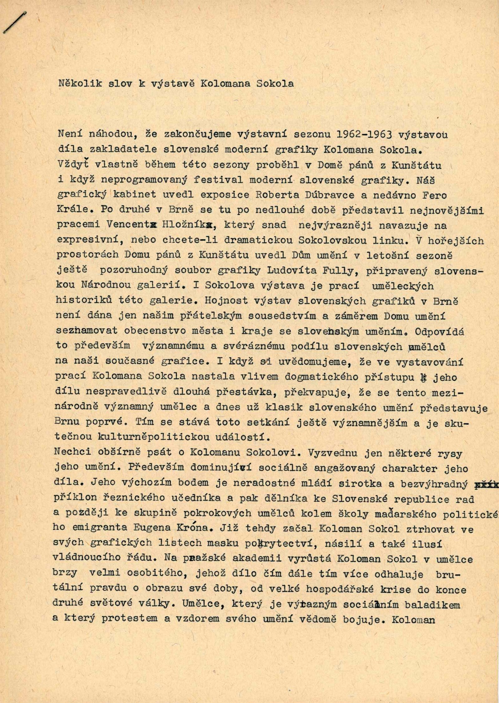 Koloman Sokol. Souborné dílo: Dům umění města Brna / Dům pánů z Kunštátu, 1. patro, 14. 6. – 25. 7. 1963 / Převzatý katalog. Koloman Sokol. Súbornú výstavu diela pripravila k príležitosti umelcových 60. narodenin Slovenská národná galéria: Bratislava, prosinec 1962 – březen 1963 / Texty: Eva Šefčáková, Koloman Sokol. – Bratislava: Slovenská národná galéria, 1962. – 102 s., obr., životní data, výstavy, ilustrační a knižní tvorba, bibliografie, DPK 192. – MZK