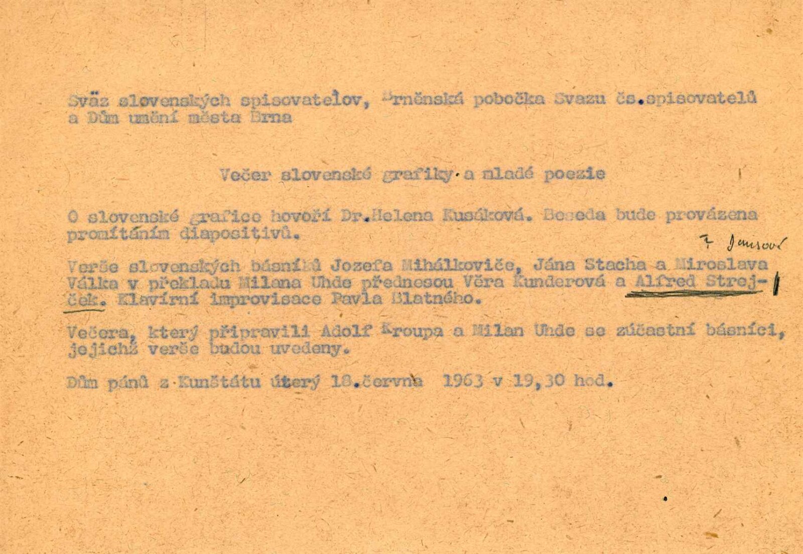 pozvánka, strojopis pozvánky na besedu o slovenské grafice a poezii, úvodní slovo k výstavě, korespondence (beseda, výstava), reversy, recenze v tisku