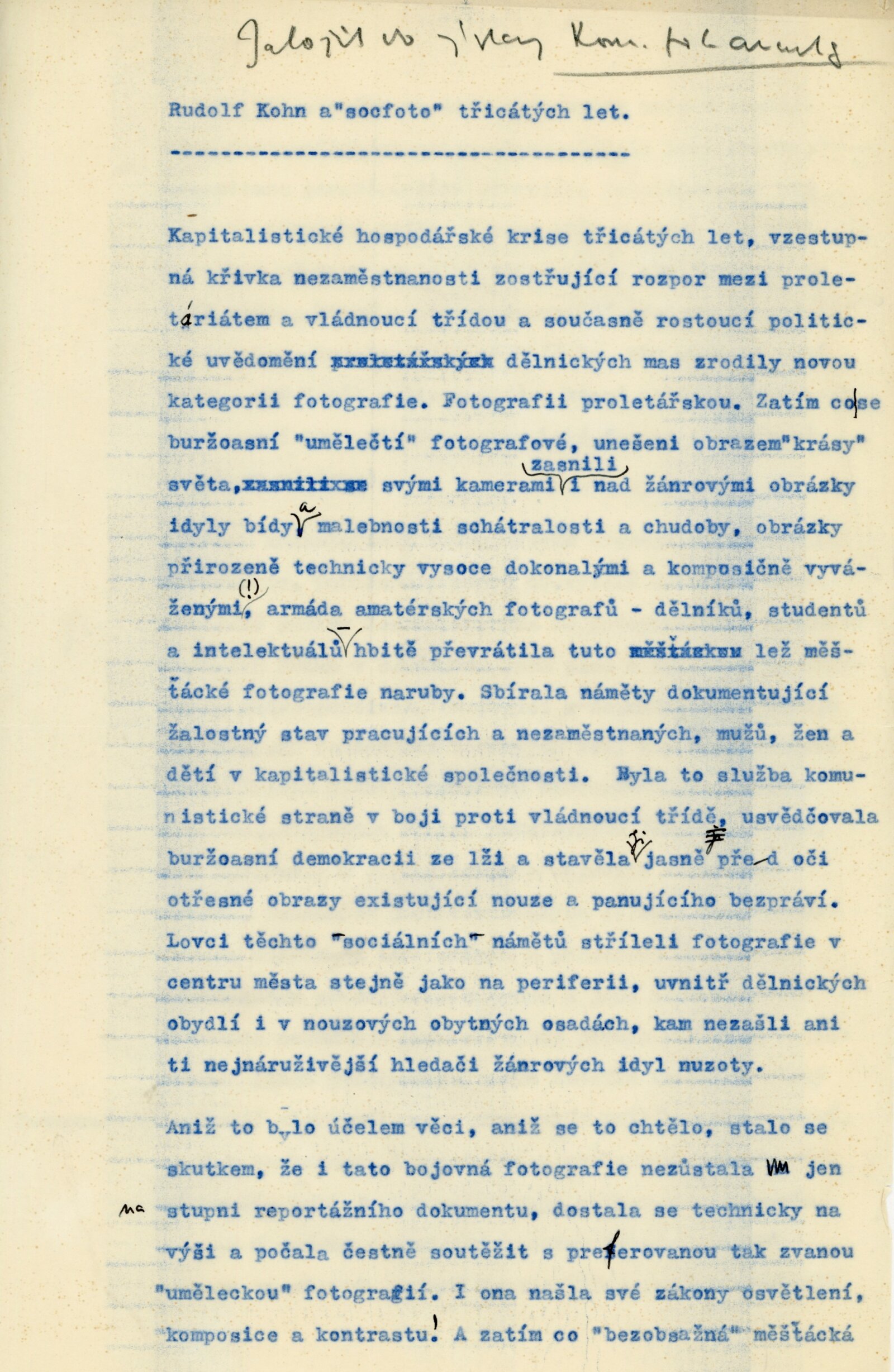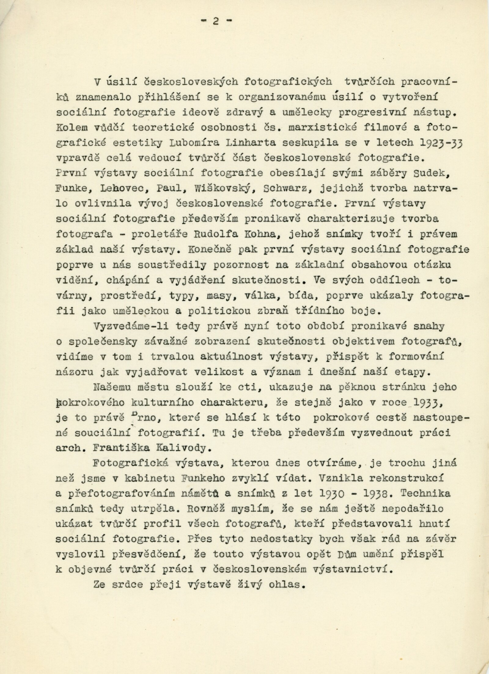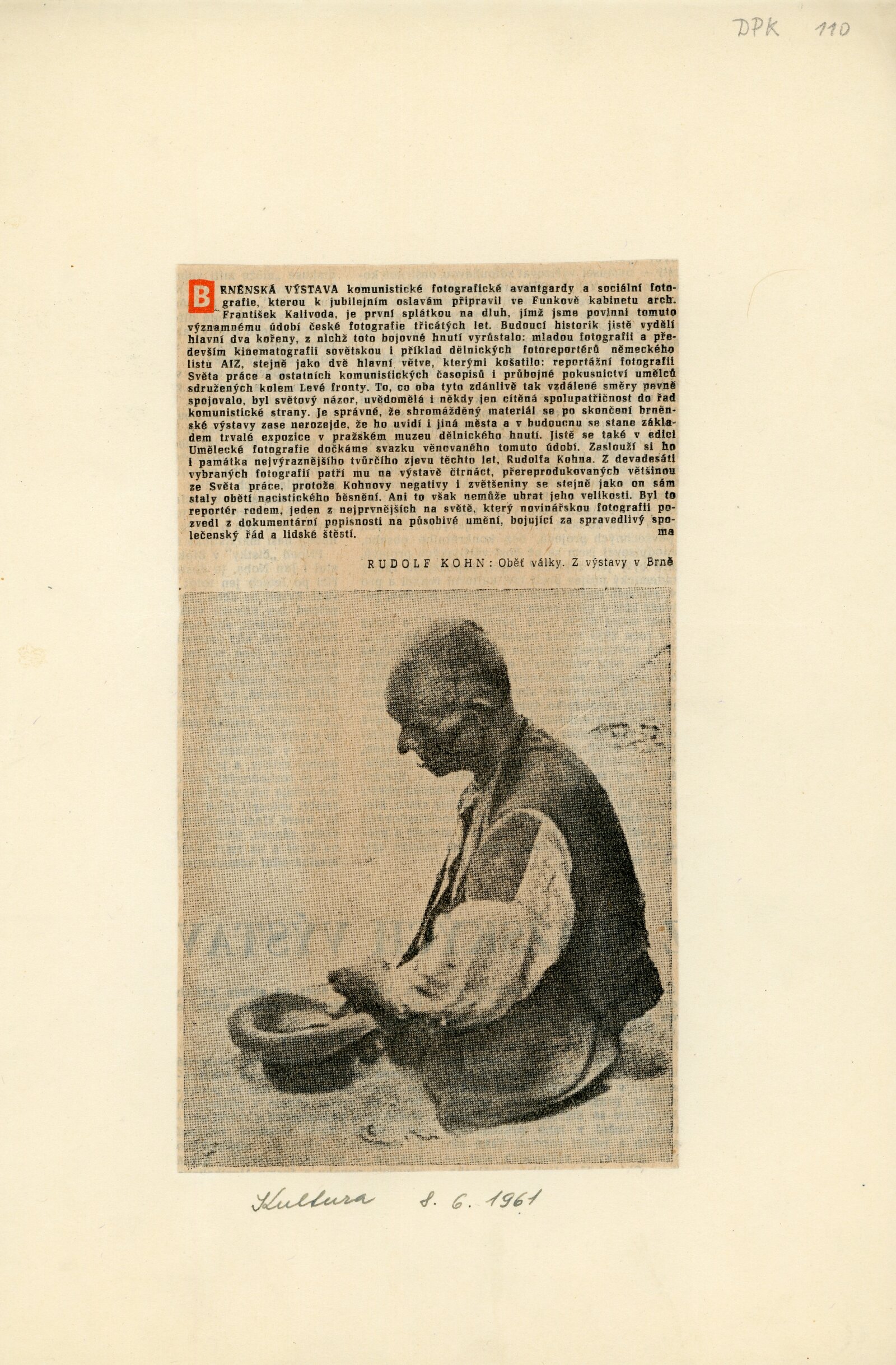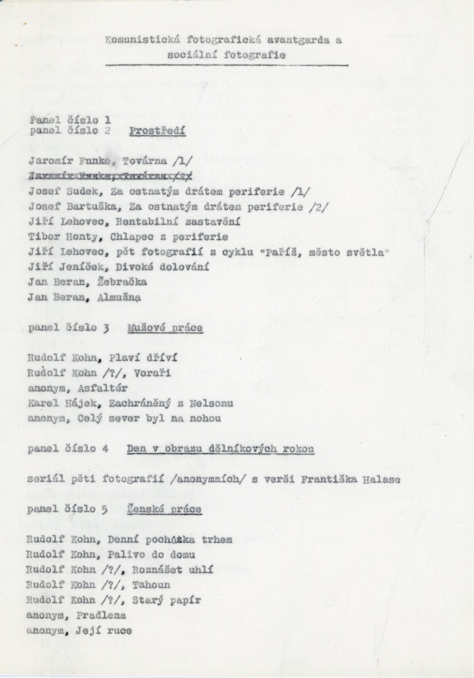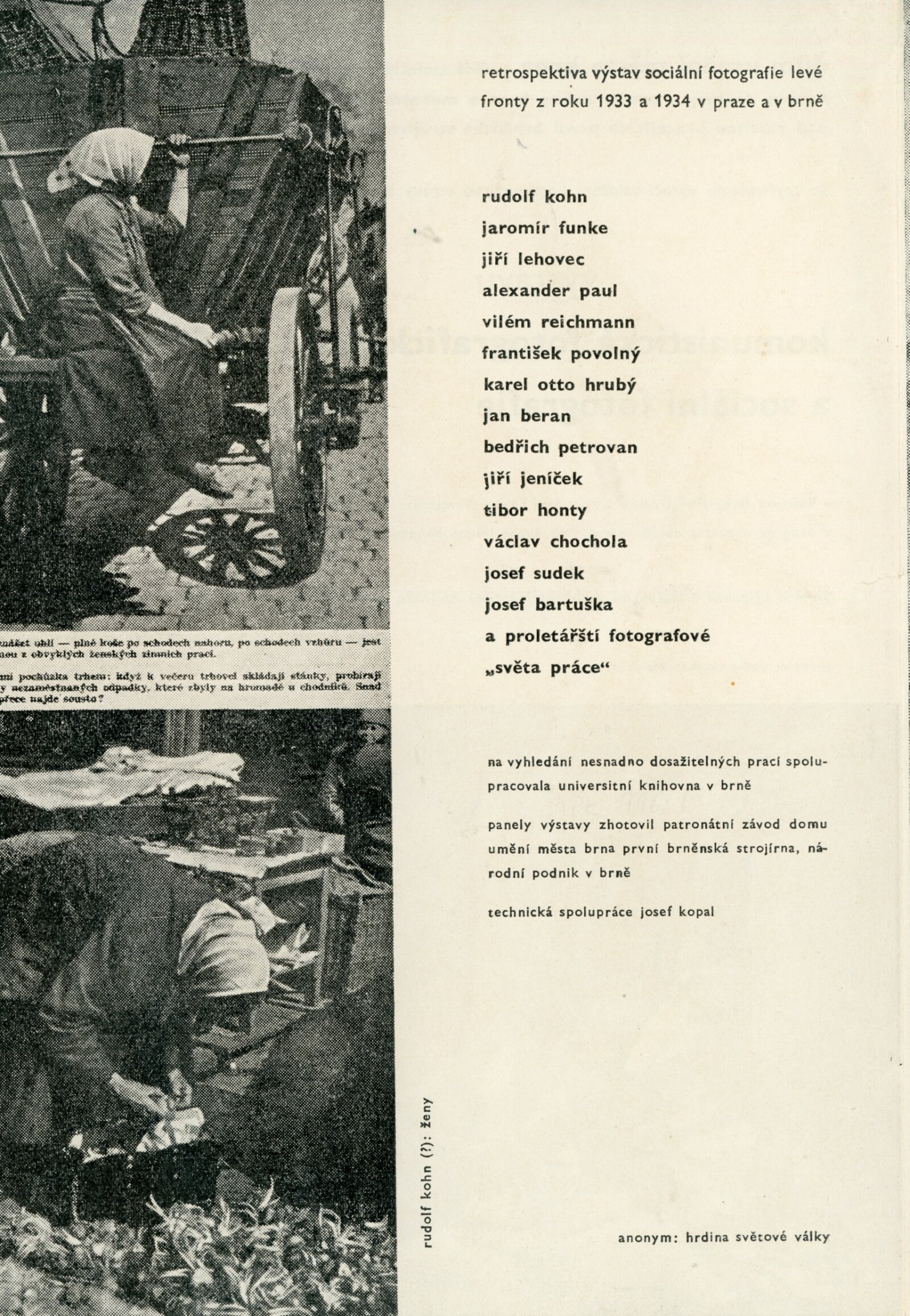 pozvánka, katalog, plakát, strojopisy textů (Rudolf Kohn a "socfoto" třicátých let, František Kalivoda – Předchůdci sociální fotografie), zápis z porady o výstavě, seznam vystavených prací, fotografie děl pro katalog, korespondence (o přípravě výstavy, Adolf Kroupa, František Kalivoda, Jiří Jeníček, AJG, SNG, provozní korespondence), žádosti o zapůjčení fotografií, potvrzení o převzetí putovní výstavy AJG, recenze v tisku, strojopis úvodního slova vernisáže výstavy František Povolný