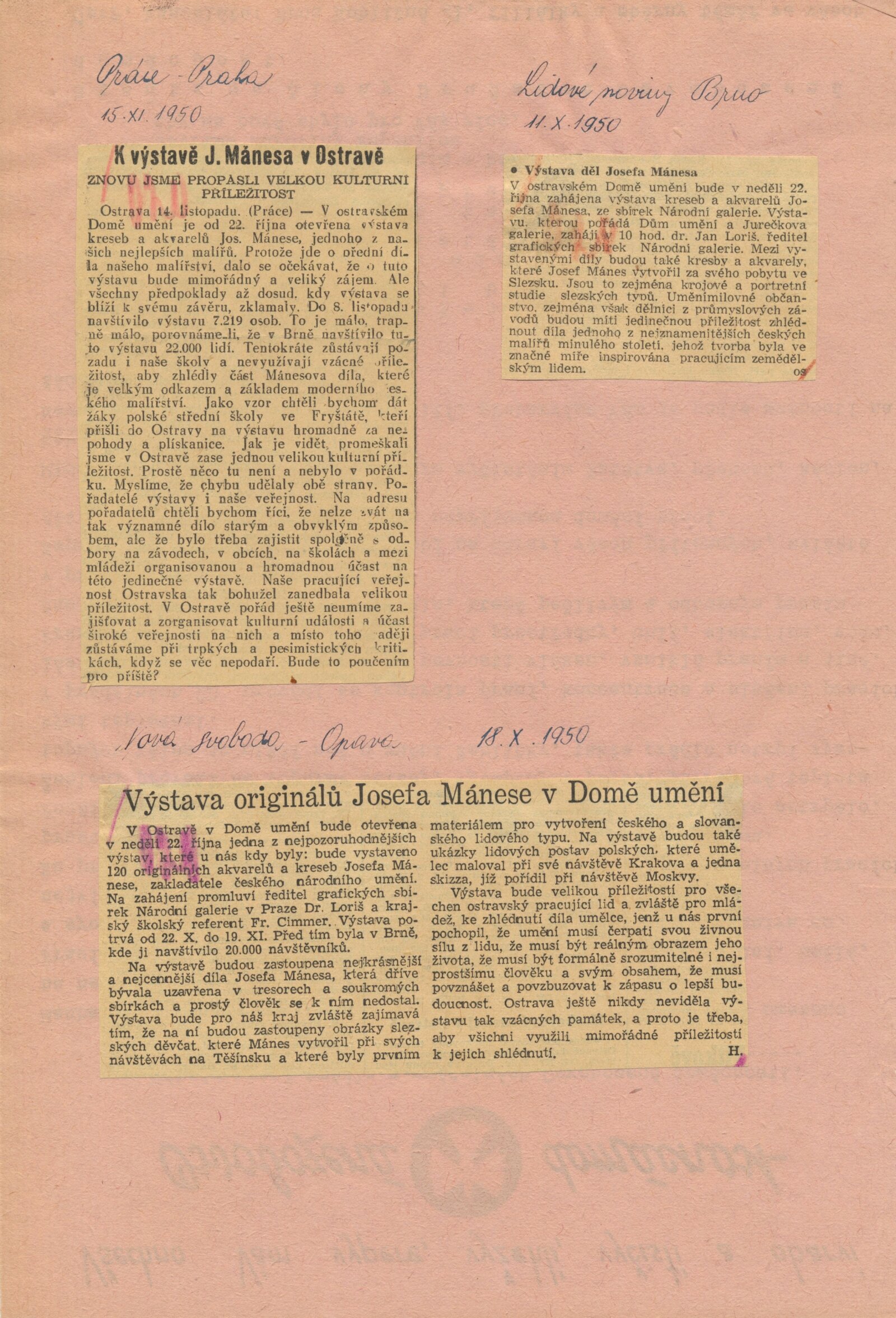 Kresby a akvarely Josefa Mánesa: Dům umění v Brně, 8. 9. – 8. 10. 1950 / Praha: Grafická sbírka Národní galerie, 1950. – 7 s., DU 141. – MG
