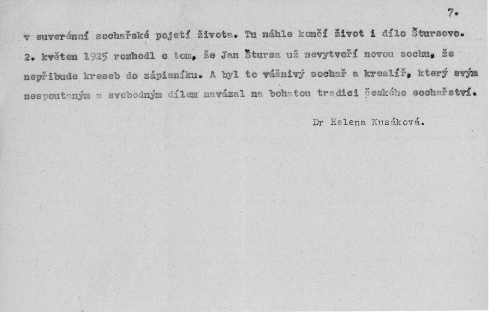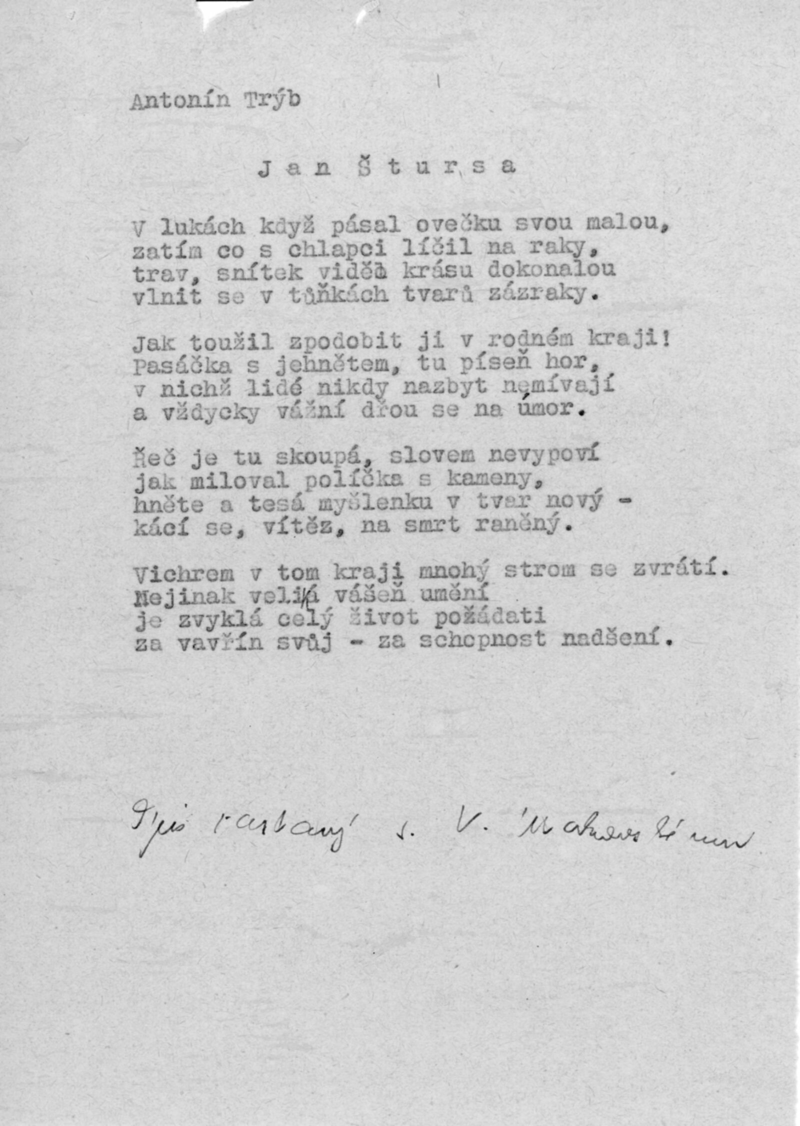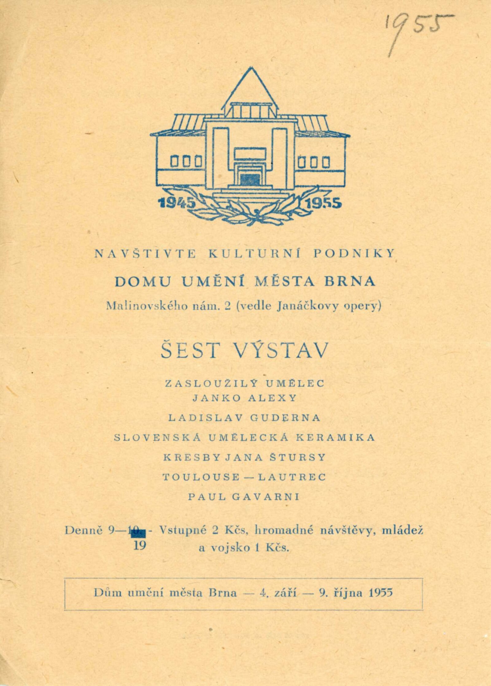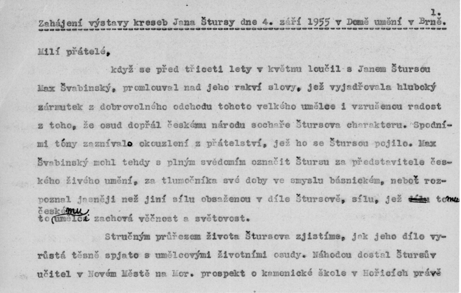 Kresby Jana Štursy: Dům umění města Brna, 4. 9. – 9. 10. 1955 / Text: Helena Kusáková. – Brno: DUmB, 1955. – 10 s., obr., báseň Antonína Trýba, DU 224. – UPM
