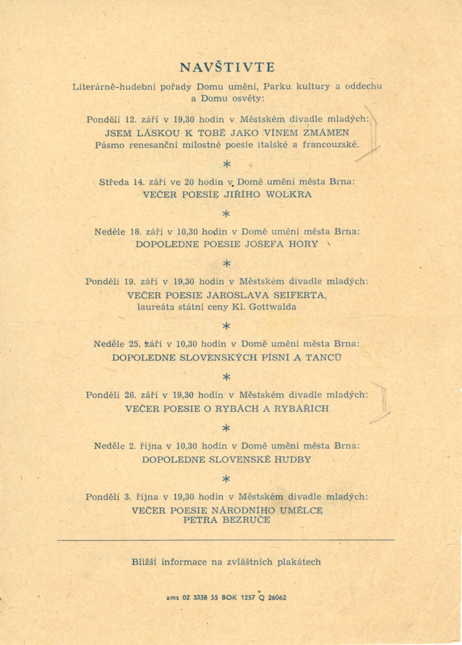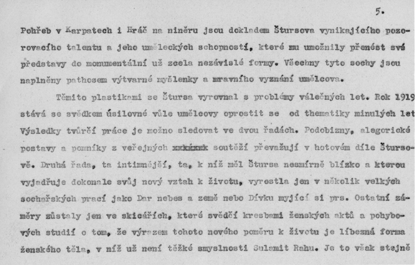 úvodní řeč Heleny Kusákové, báseň Antonína Trýba „Jan Štursa“, korespondence (zejména s Antonínem Trýbem), leták (pozvání na akce DU), výstavy a pořady (DU 224–226 a 230), pozvánka na Štursův večer a otevření Štursovy síně v Novém Městě na Moravě (7. 5. a 8. 5. 1955), provozní korespondence
