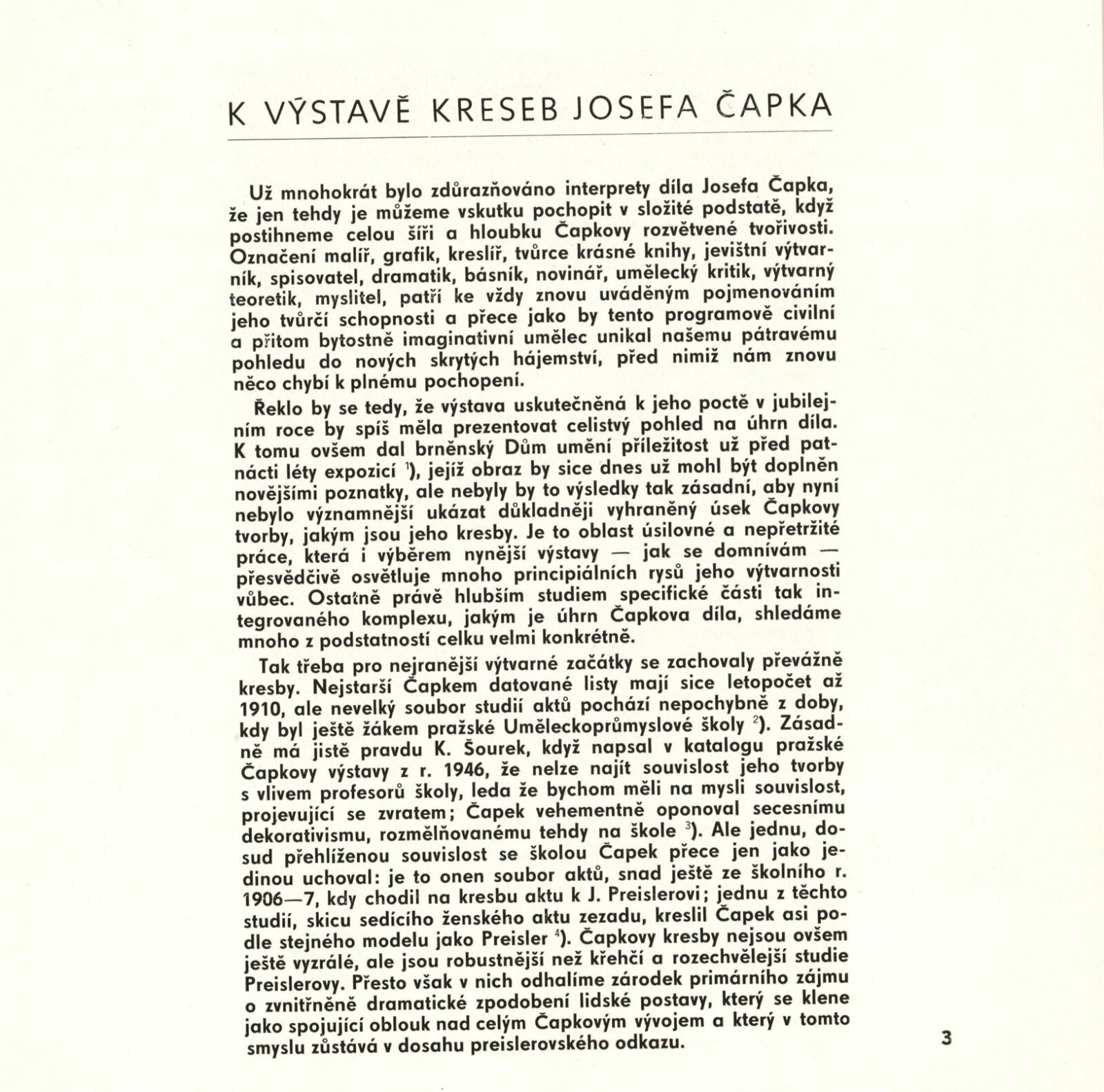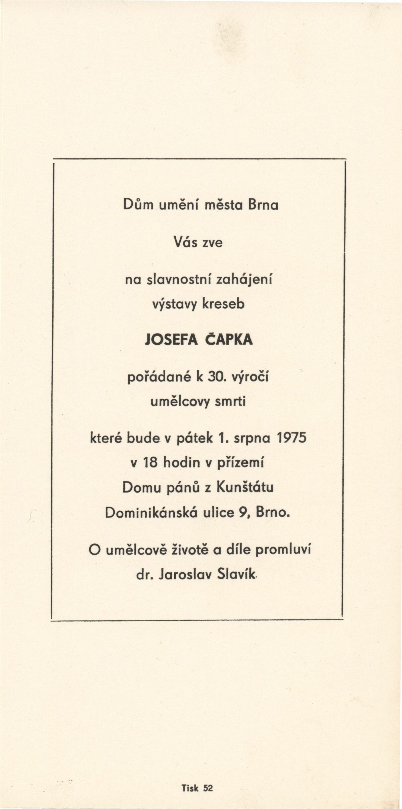 Kresby Josefa Čapka: Dům umění / Dům pánů z Kunštátu, 150. výstava Kabinetu grafiky, 1. 8. – 31. 8. 1975 / Výstava Domu umění města Brna k 30. výročí osvobození ČSSR a na paměť 30. výročí umělcovy smrti. – Text: Jaroslav Slavík. – Brno: DUmB, 1975. – 23 s., obr., seznam exponátů 10 s., DPK 600. – MZK; MMB