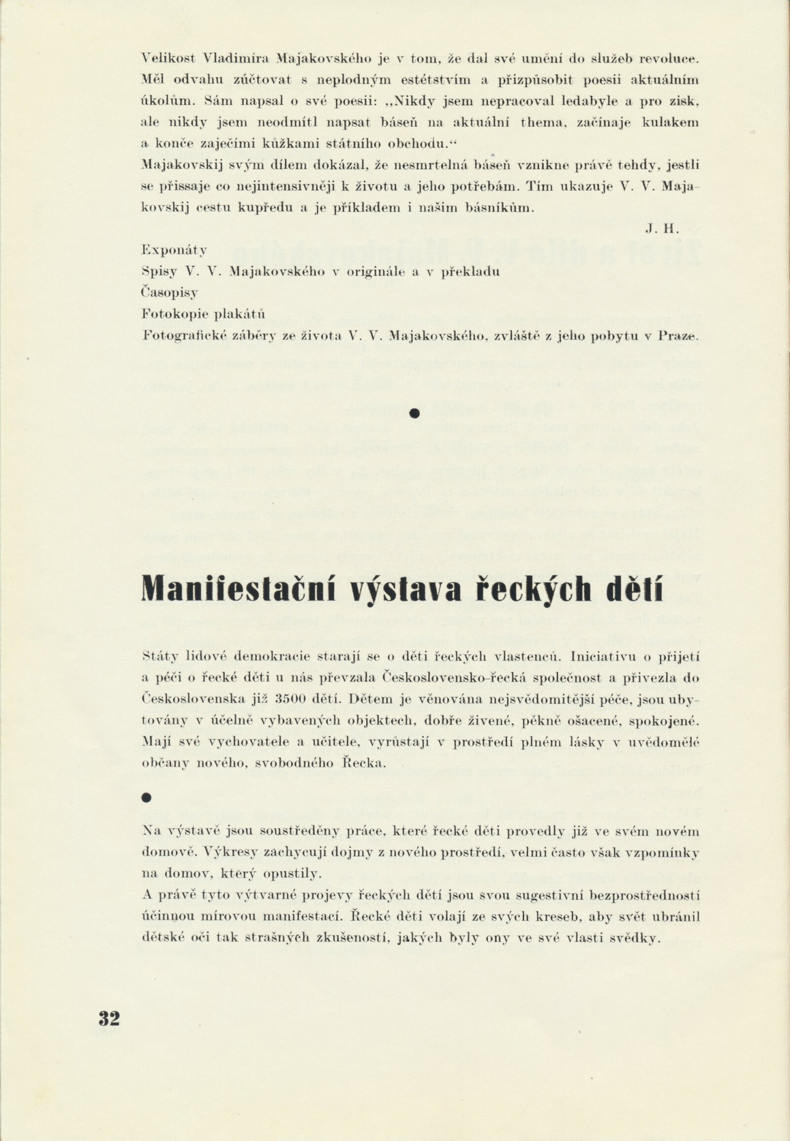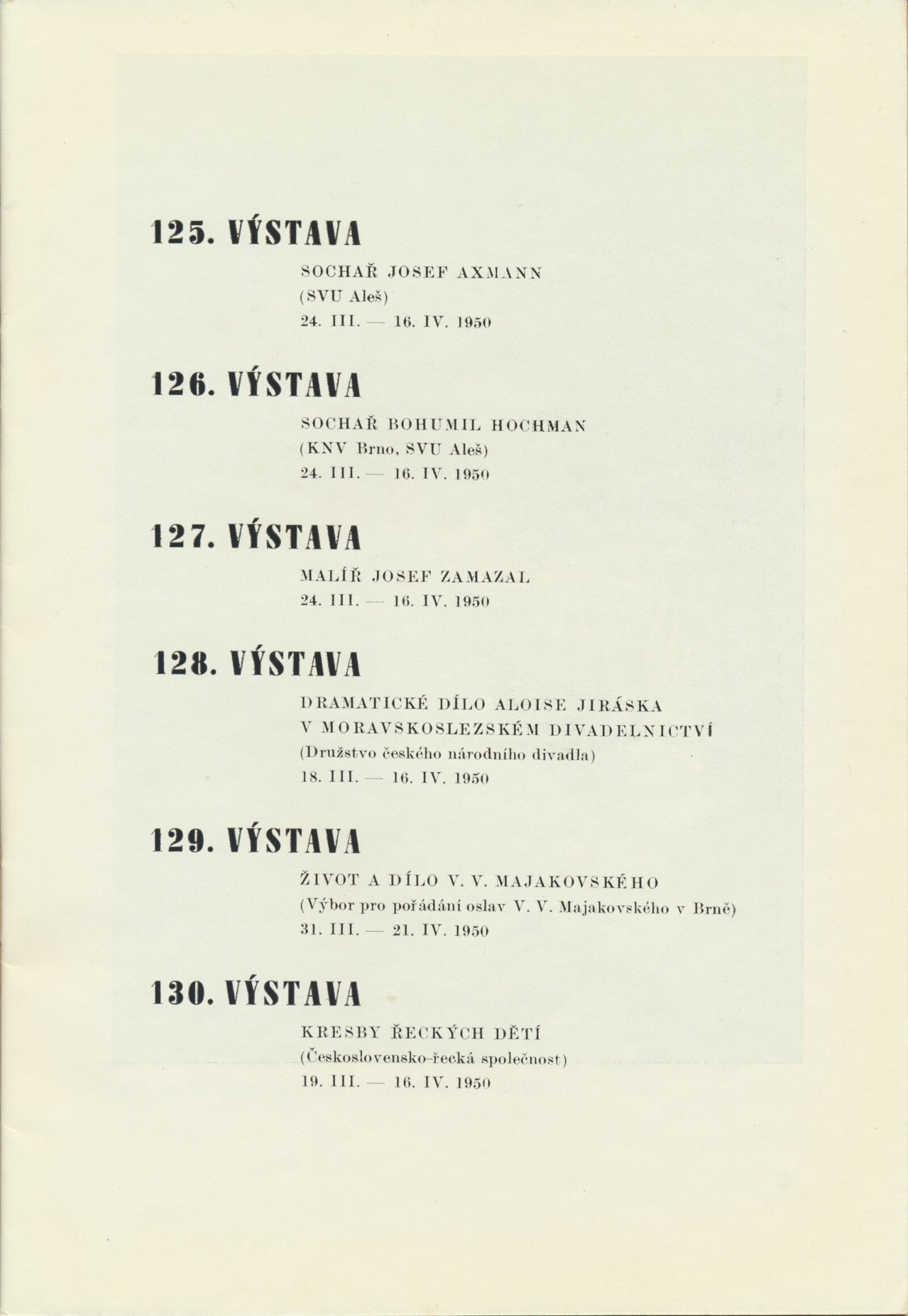 Katalog výstav Domu umění, výstavní list Domu umění, pořádaných mezi březnem a dubnem 1950 / Obsahuje výstavy: Sochař Josef Axmann. 125. výstava, Sochař Bohumil Hochman. 126. výstava, Malíř Josef Zamazal. 127. výstava, Dramatické dílo Aloise Jiráska v moravskoslezském divadelnictví. 128. výstava, Život a dílo V. V. Majakovského. 129. výstava, Kresby řeckých dětí. 130. výstava / Texty: A. L., J. B. Svrčka. – Brno: Dům umění, 1950. – 32 s., obr., životopisy umělců, soupisy prací, DU 125–130. – MG; MMB