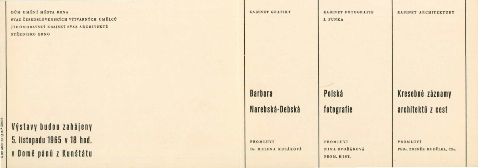 Kresebné záznamy architektů z cest: Dům umění města Brna / Dům pánů z Kunštátu, Kabinet architektury Svazu architektů ČSSR, 5. 11. – 28. 11. 1965 / Brno: Svaz architektů ČSSR, 1965. – 4 s., obr., DPK 286, K ?