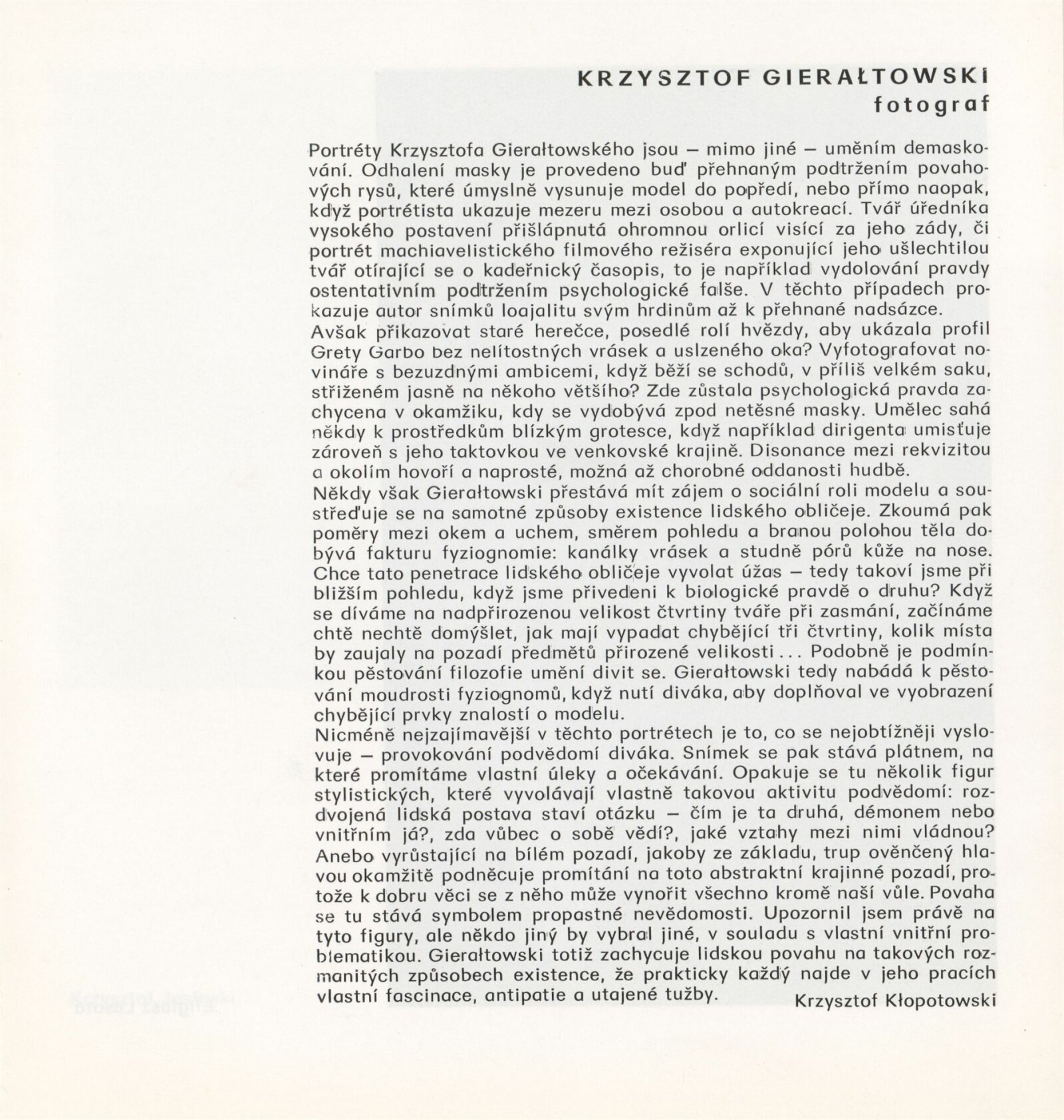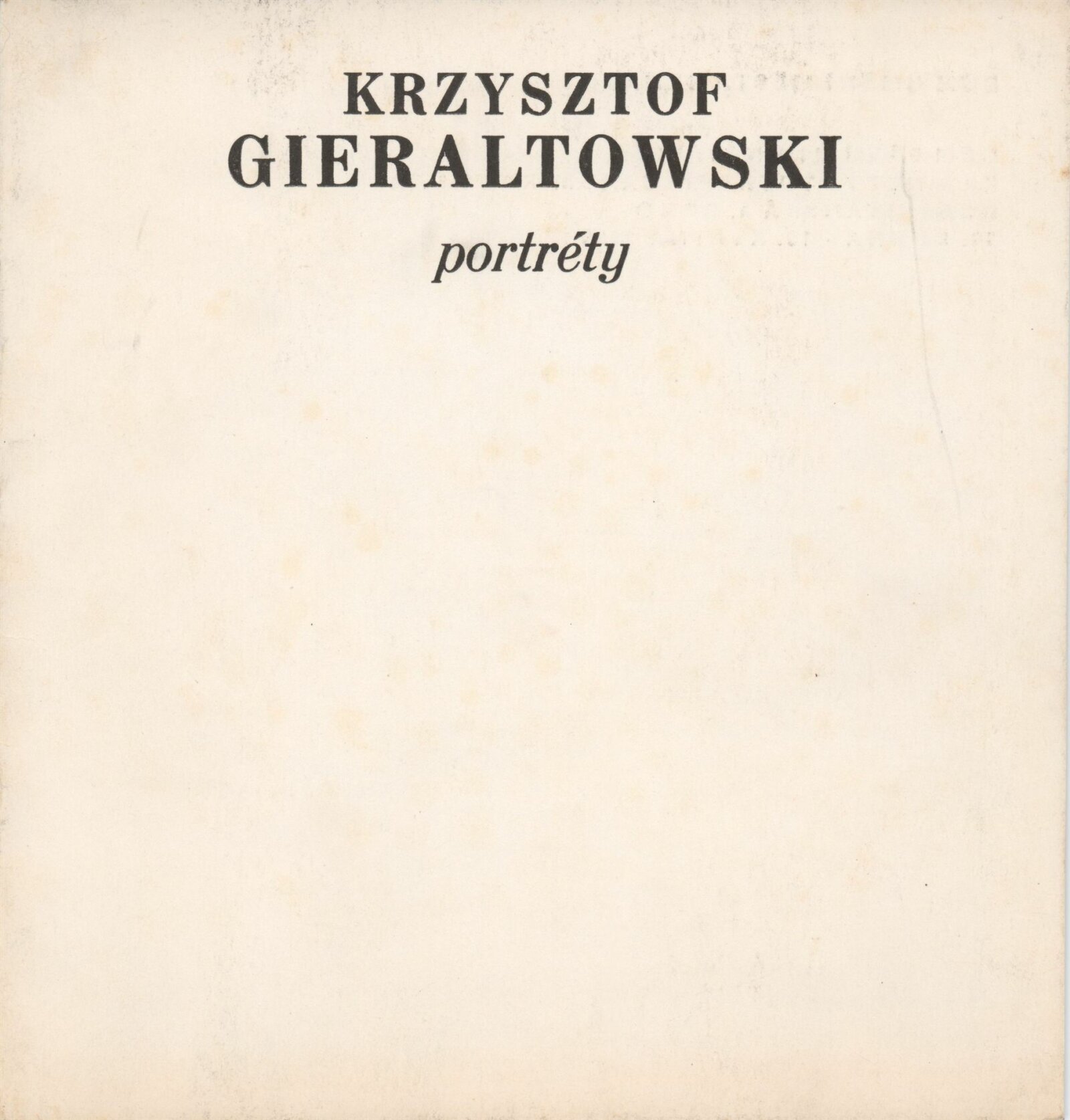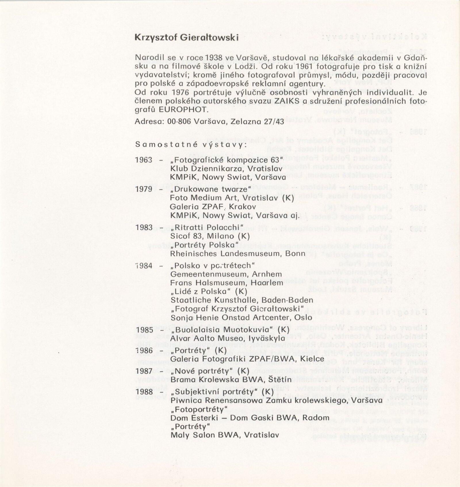 Kryzsztof Gieraltowski. Portréty: Dům umění města Brna / Dům pánů z Kunštátu, Kabinet fotografie Jaromíra Funka, 10. 4. – 13. 5. 1990 / Text: Krzysztof Klopotowski. – Brno: DUmB, 1990. – [12] s., obr., životní data, výstavy, fotografie ve sbírkách, DPK 935. – MZK; MG