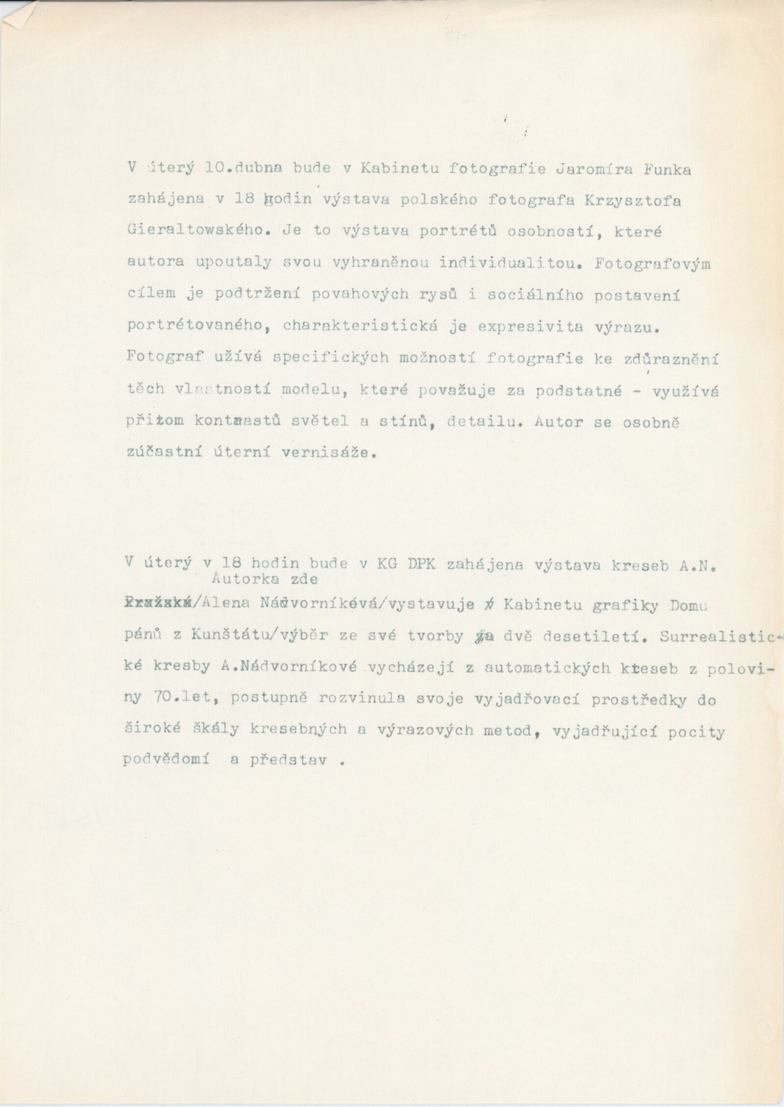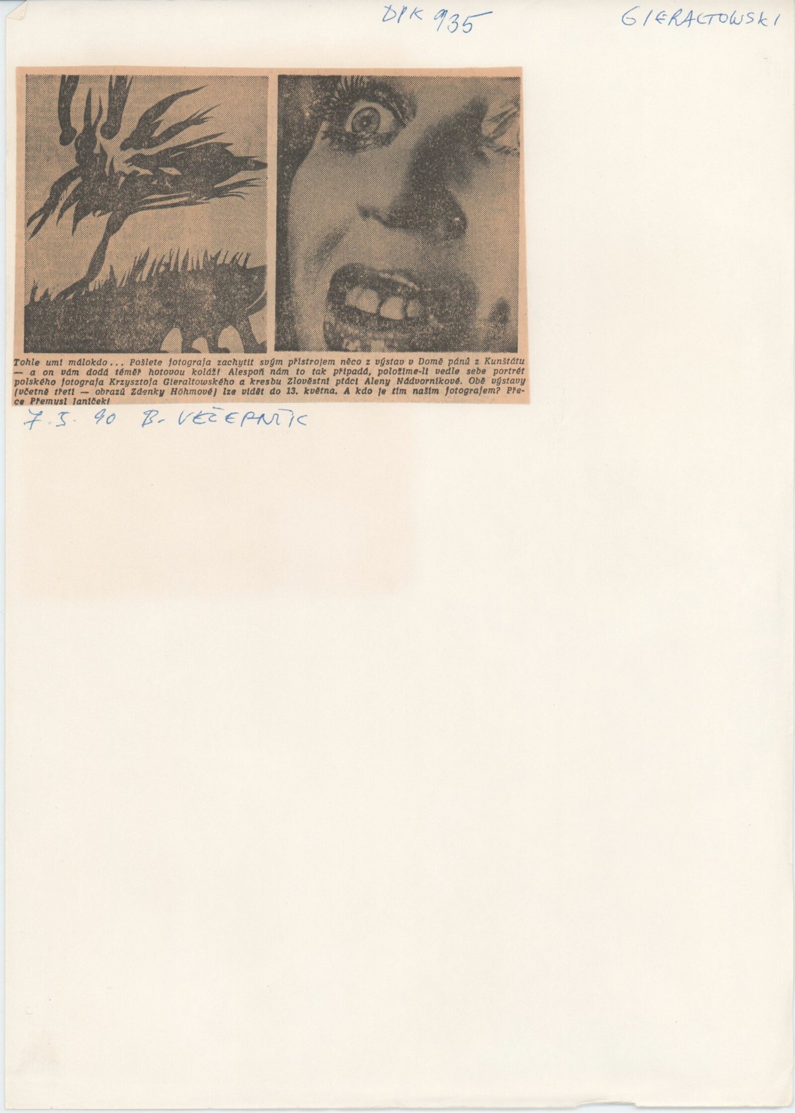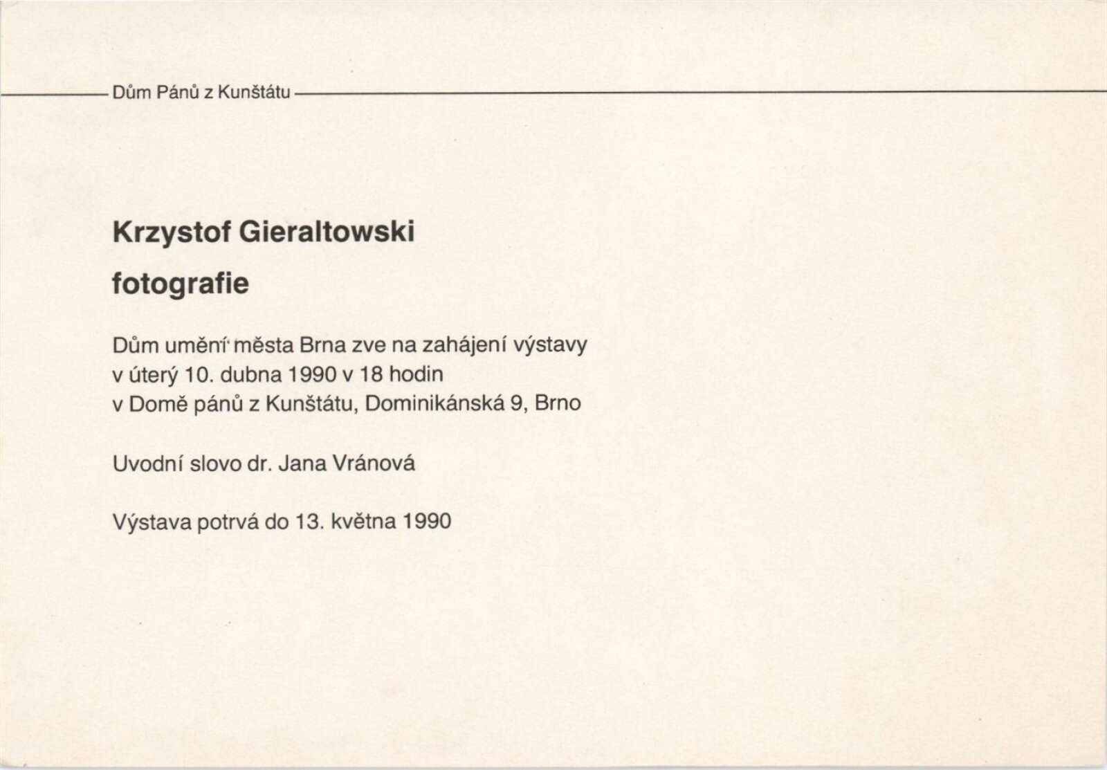 Kryzsztof Gieraltowski. Portréty: Dům umění města Brna / Dům pánů z Kunštátu, Kabinet fotografie Jaromíra Funka, 10. 4. – 13. 5. 1990 / Text: Krzysztof Klopotowski. – Brno: DUmB, 1990. – [12] s., obr., životní data, výstavy, fotografie ve sbírkách, DPK 935. – MZK; MG