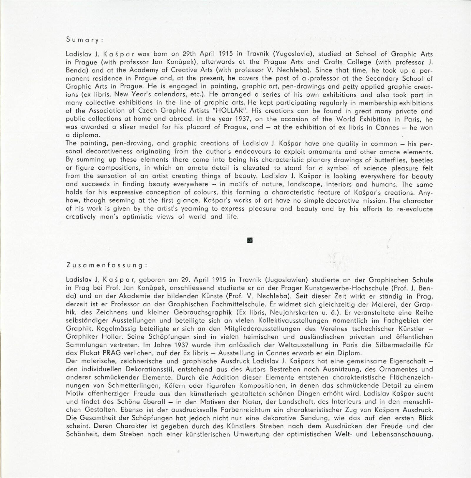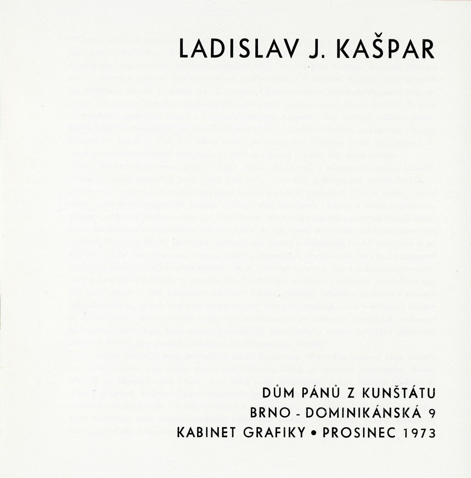 Ladislav J. Kašpar: Dům umění / Dům pánů z Kunštátu, 139. výstava Kabinetu grafiky, 7. 12. 1973 – 1. 1. 1974 / Text: Zdeněk Čubrda. – Brno: DUmB, 1973. – 14 s., obr., seznam vystavených prací 1 s., portrét, životopis, DPK 556
