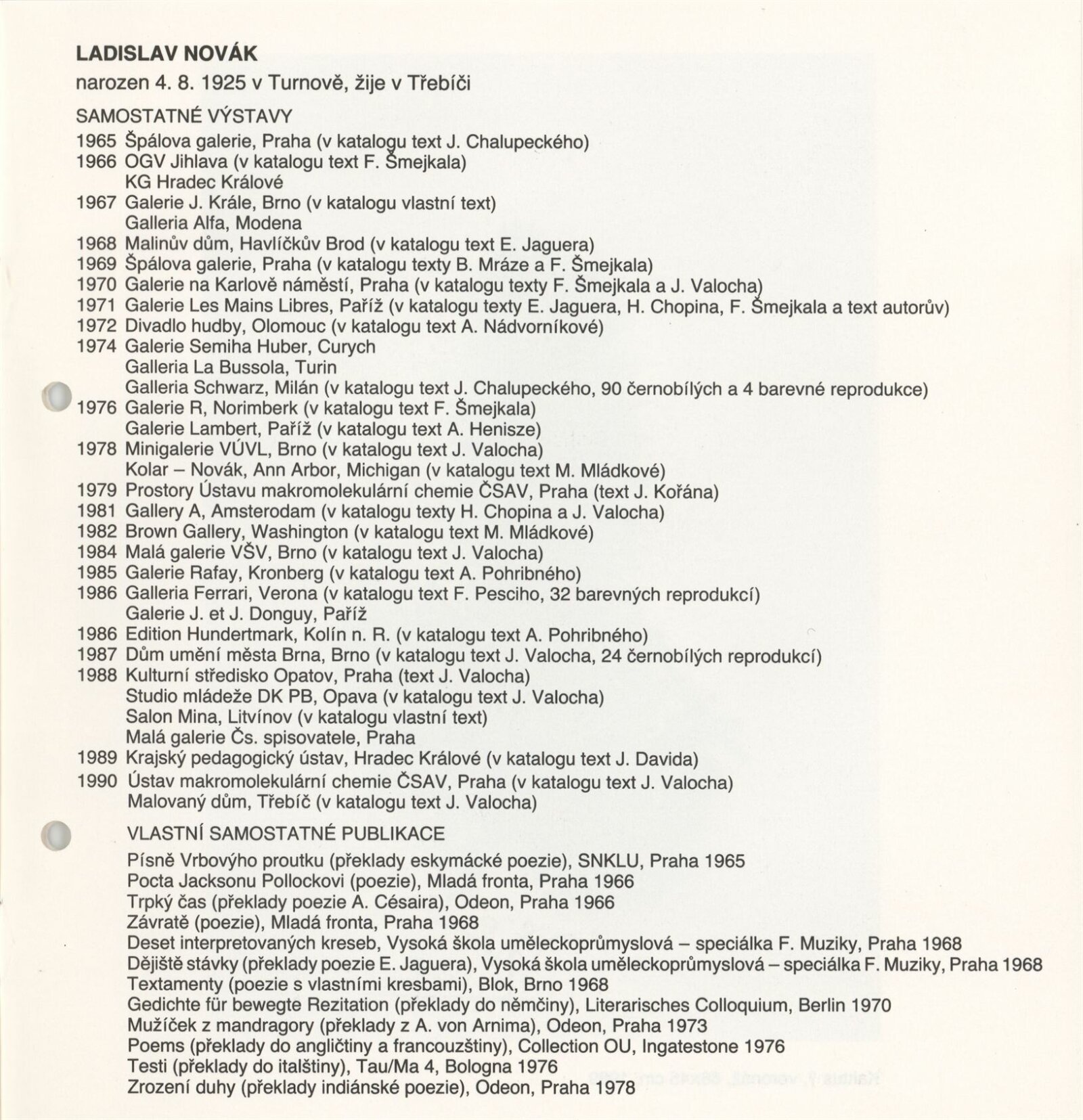 Ladislav Novák. Veronáže: Galerie Stará radnice, Kabinet grafiky, 11. 10. – 18. 11. 1990 / Text: Jiří Valoch. – Brno: DUmB, 1990. – [12] s., obr., životní data, výstavy, vlastní publikace, GSR 80. – MG