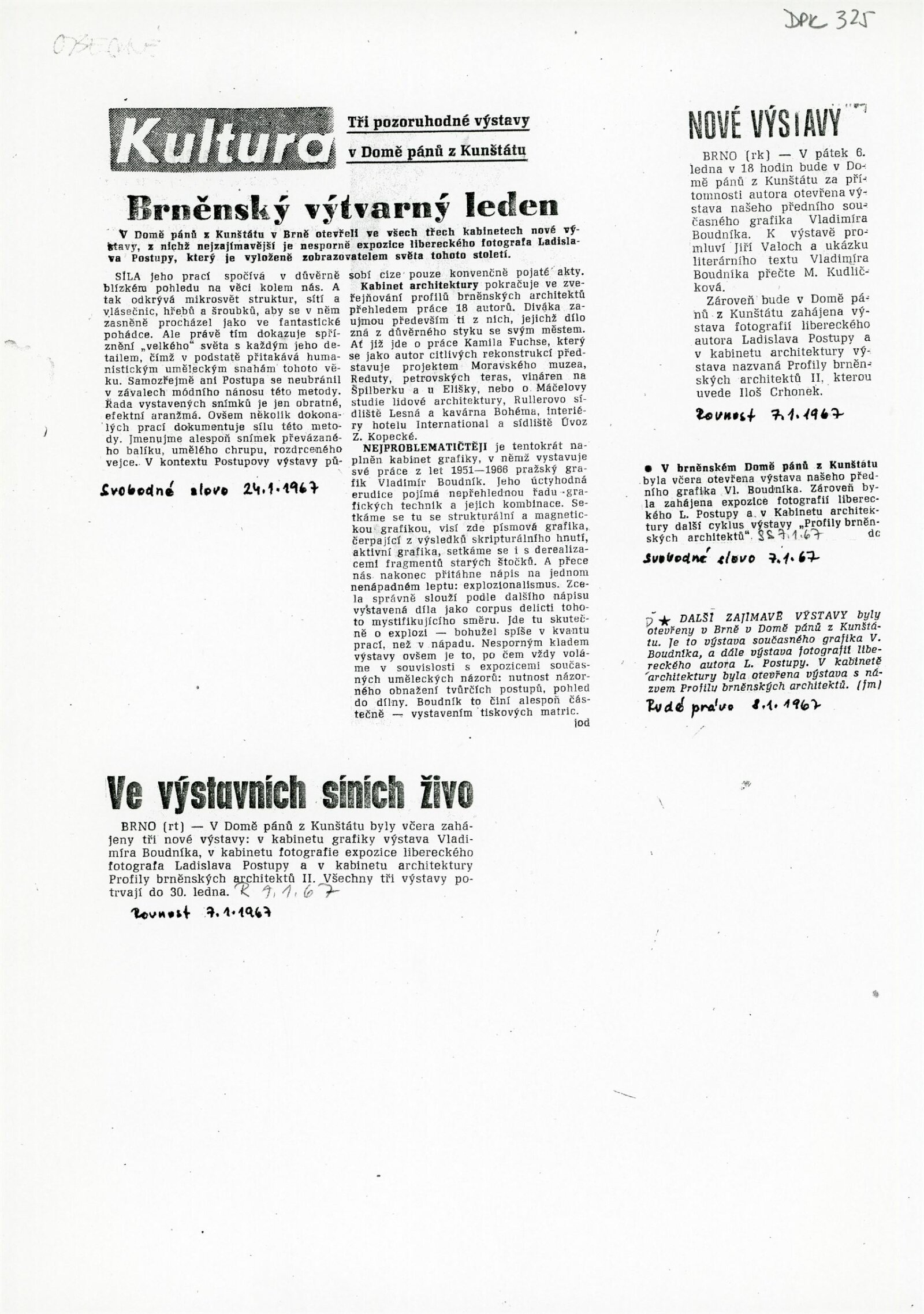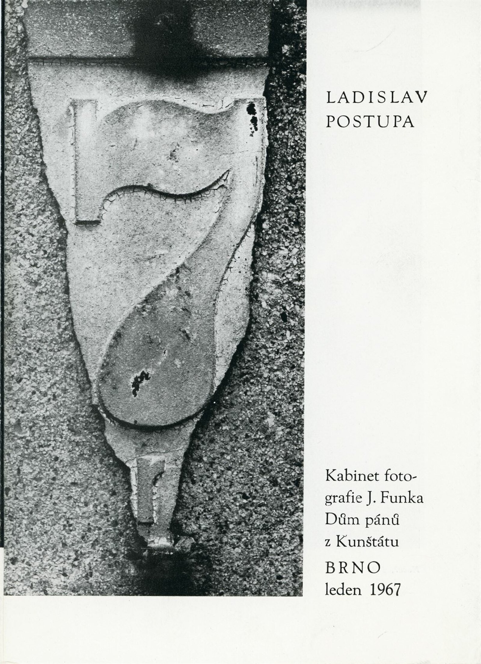 Ladislav Postupa: Dům umění města Brna/ Dům pánů z Kunštátu, 78. výstava Kabinetu fotografie Jaromíra Funka, 6. 1. – 30. 1. 1967 / Brno: DUmB, 1967. – skládačka, 6 s., obr., životopis, DPK 325. – MZK; MG