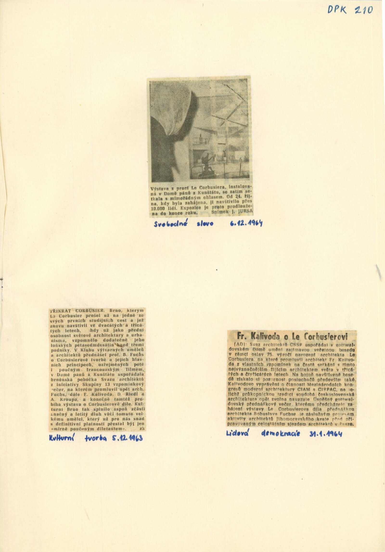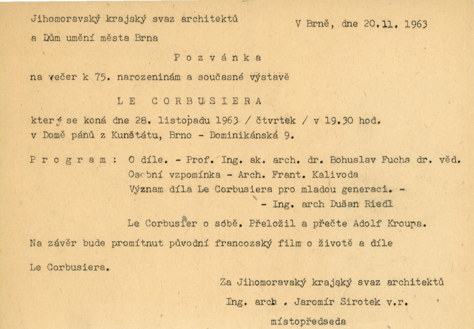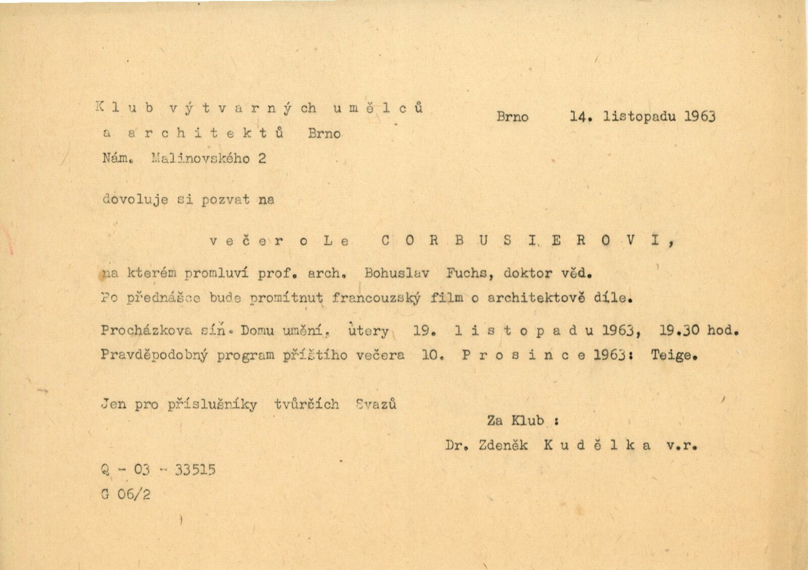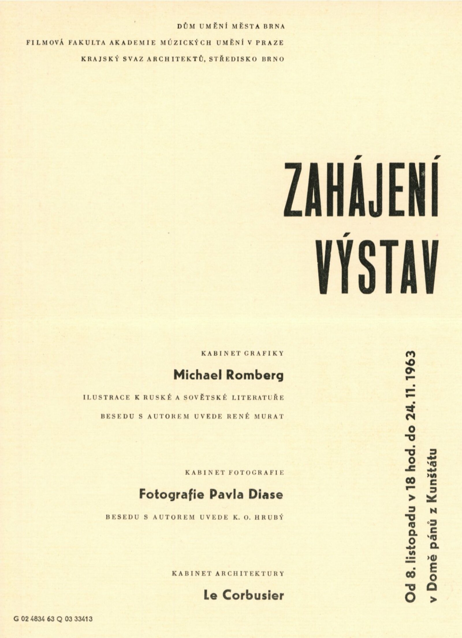 Le Corbusier: Dům umění města Brna / Dům pánů z Kunštátu, Kabinet architektury Svazu architektů ČSSR, 8. 11. – 24. 11. 1963 / Brno: Svaz architektů ČSSR, 1963. – 4 s., obr., DPK 210. – MG