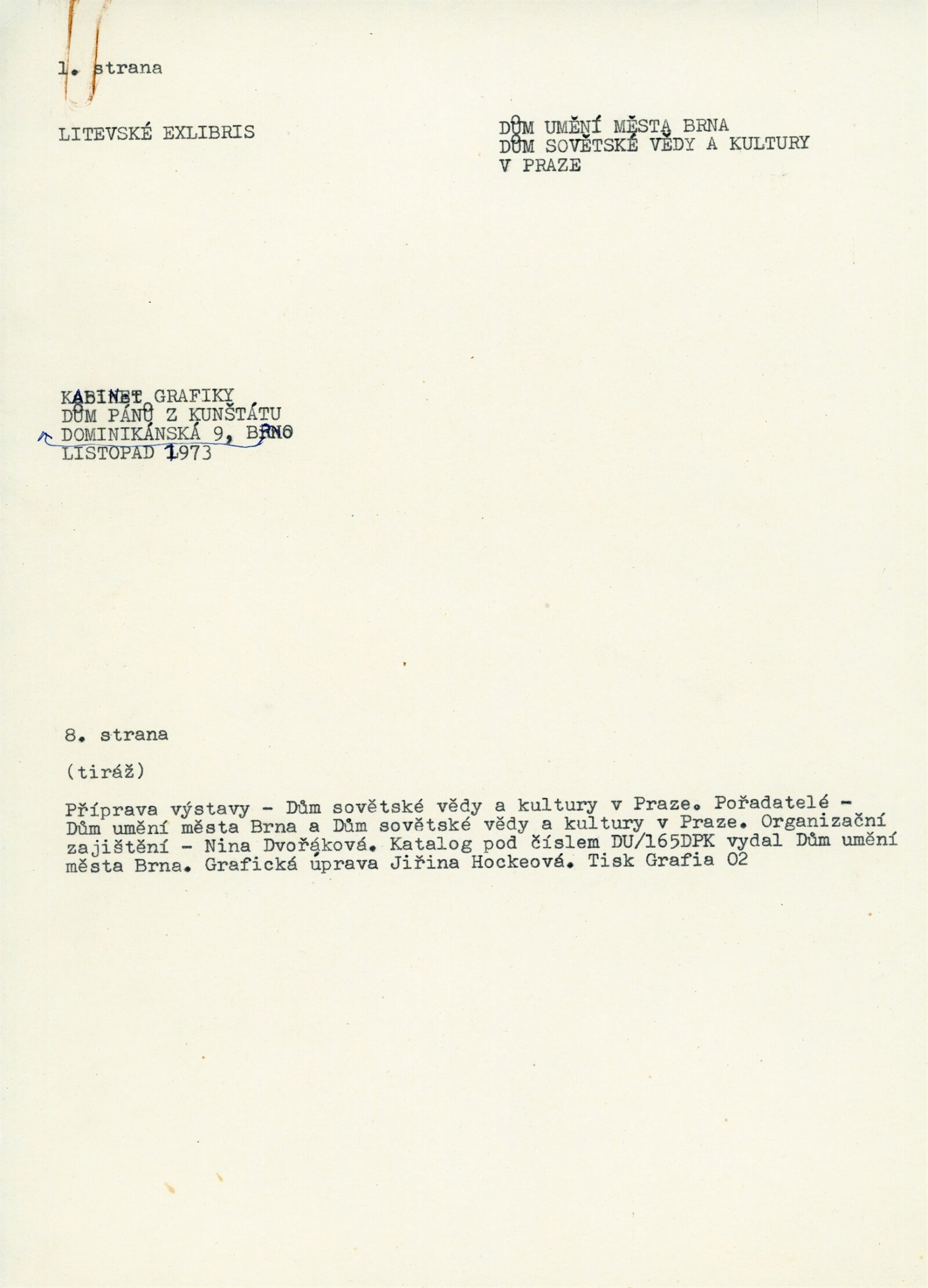 pozvánka, maketa katalogu, podklady pro katalog (ČJ, RJ), žádost o schválení tisku katalogu, dopis MV SČSP (k výstavě k Měsíci československo–sovětského přátelství), provozní korespondence, výstavní smlouva, žádost o povolení výstavy, recenze v tisku