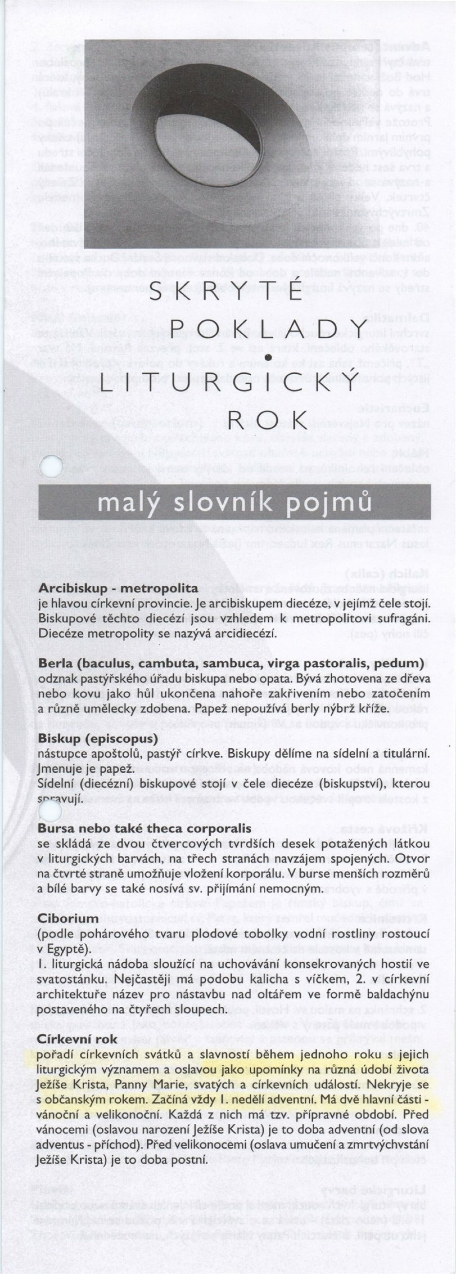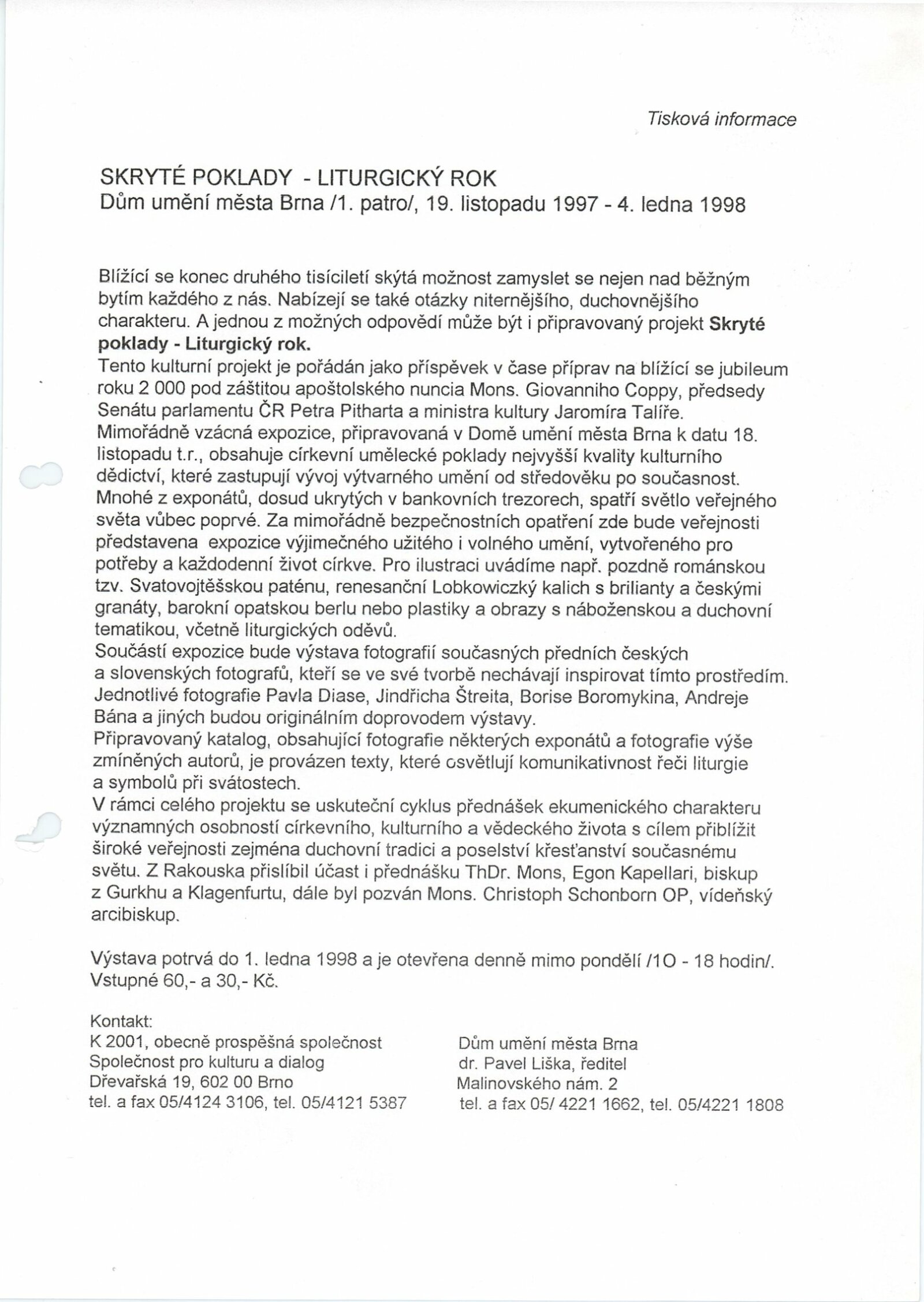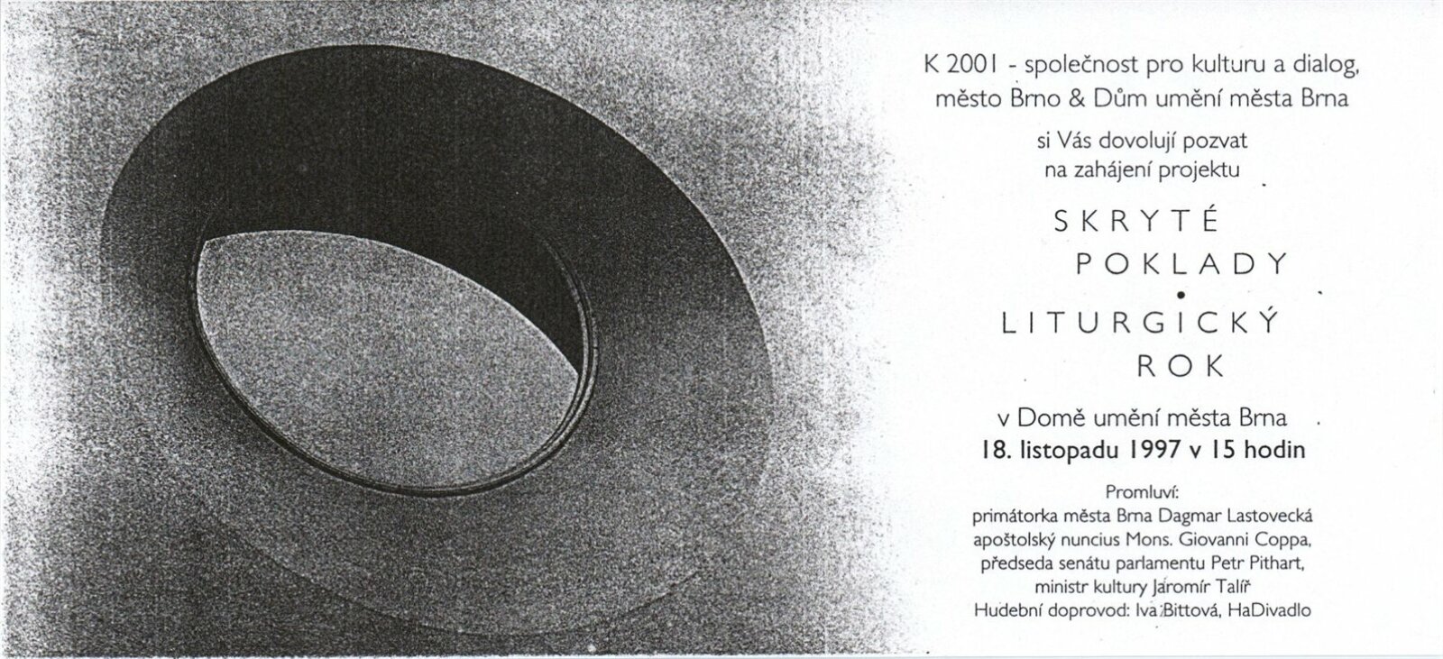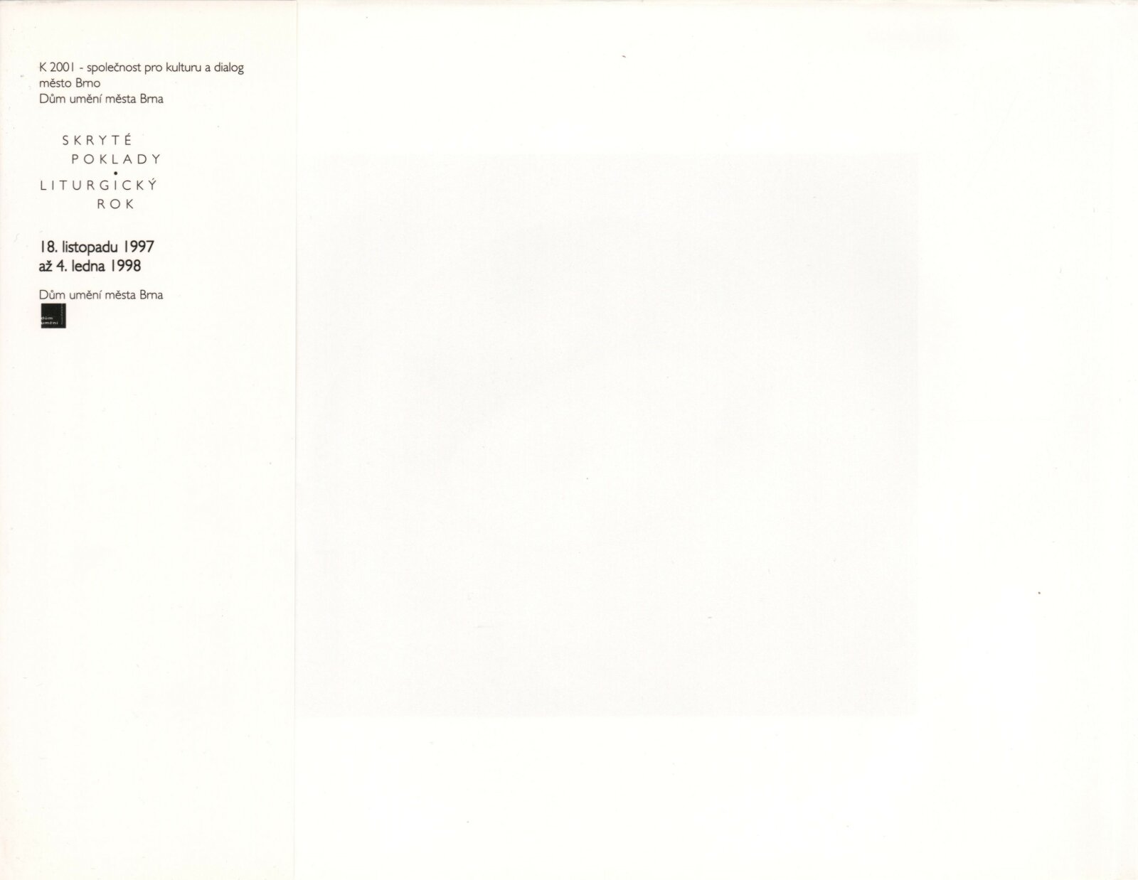 Skryté poklady. Liturgický rok: Dům umění města Brna, 18. 11. 1997 – 4. 1. 1998 / Texty: Jaromír Talíř, Giovanni Coppa, Jan Graubner, Jiří Mikulášek a další. – Brno: K, Společnost pro kulturu a dialog, 2001. – [83] s., obr., DU 1065. – MZK