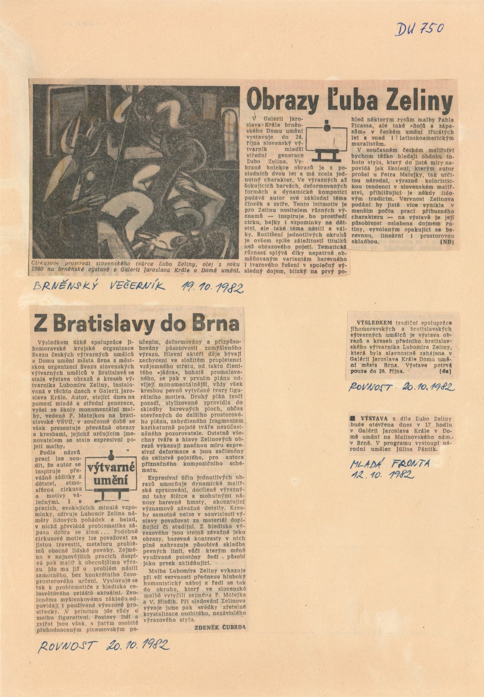 Ľubo Zelina. Obrazy, kresba: Dům umění, Galerie Jaroslava Krále, 5. 10. – 24. 10. 1982 / Převzatý katalog. Ľubo Zelina. Maľba, kresba: Sieň Laca Novomeského, Bratislava, 1982 / Text: Dušan Kubiš. – Bratislava: Sieň Laca Novomeského, 1982. – 20 s., obr., portrét, výstavy, DU 750