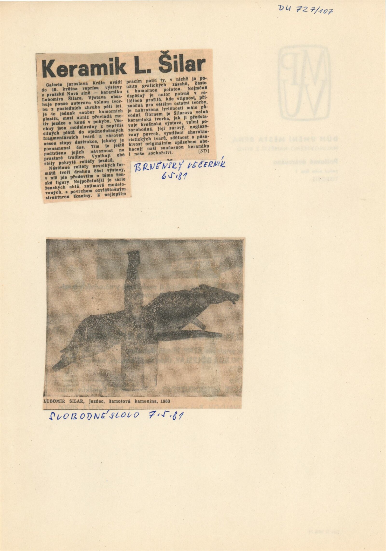 Lubomír Šilar. Keramika 1974–1980: Dům umění, Galerie Jaroslava Krále, 7. 4. – 10. 5. 1981 / Text: Dagmar Tučná. – Praha: SČVU, 1980. – 14 s., obr., seznam vystavených prací 2 s., portrét, životní data, výstavy, ceny, realizace pro architekturu, DU 727