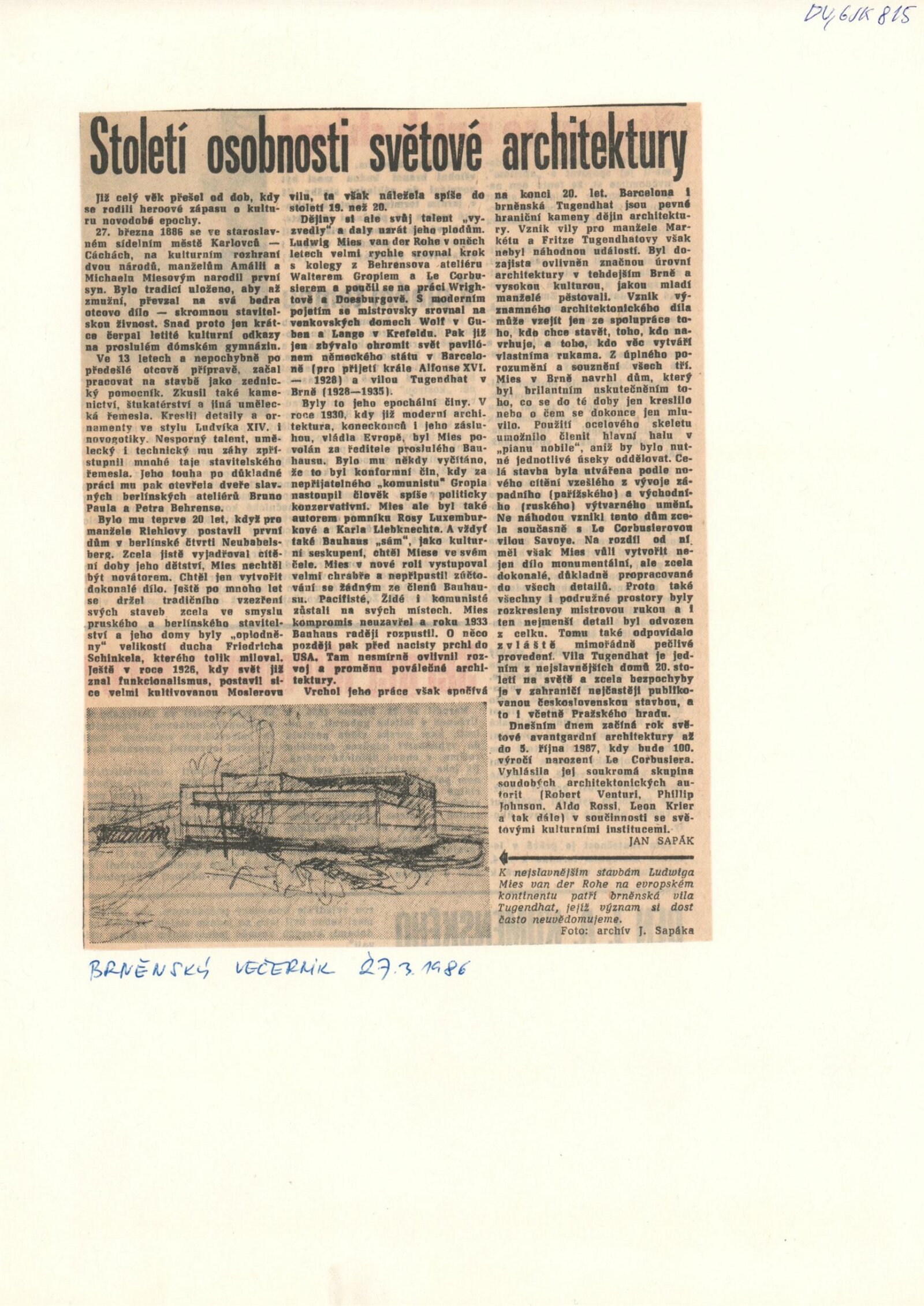 Ludwig Mies van der Rohe: Vila Tugendhat v Brně: Dům umění, Galerie Jaroslava Krále, 27. 2. – 8. 3. 1986 / U příležitosti zahájení vyšel jako pozvánka tisk o 4 listech v obálce s životopisnými údaji, DU 815. – MG; MMB