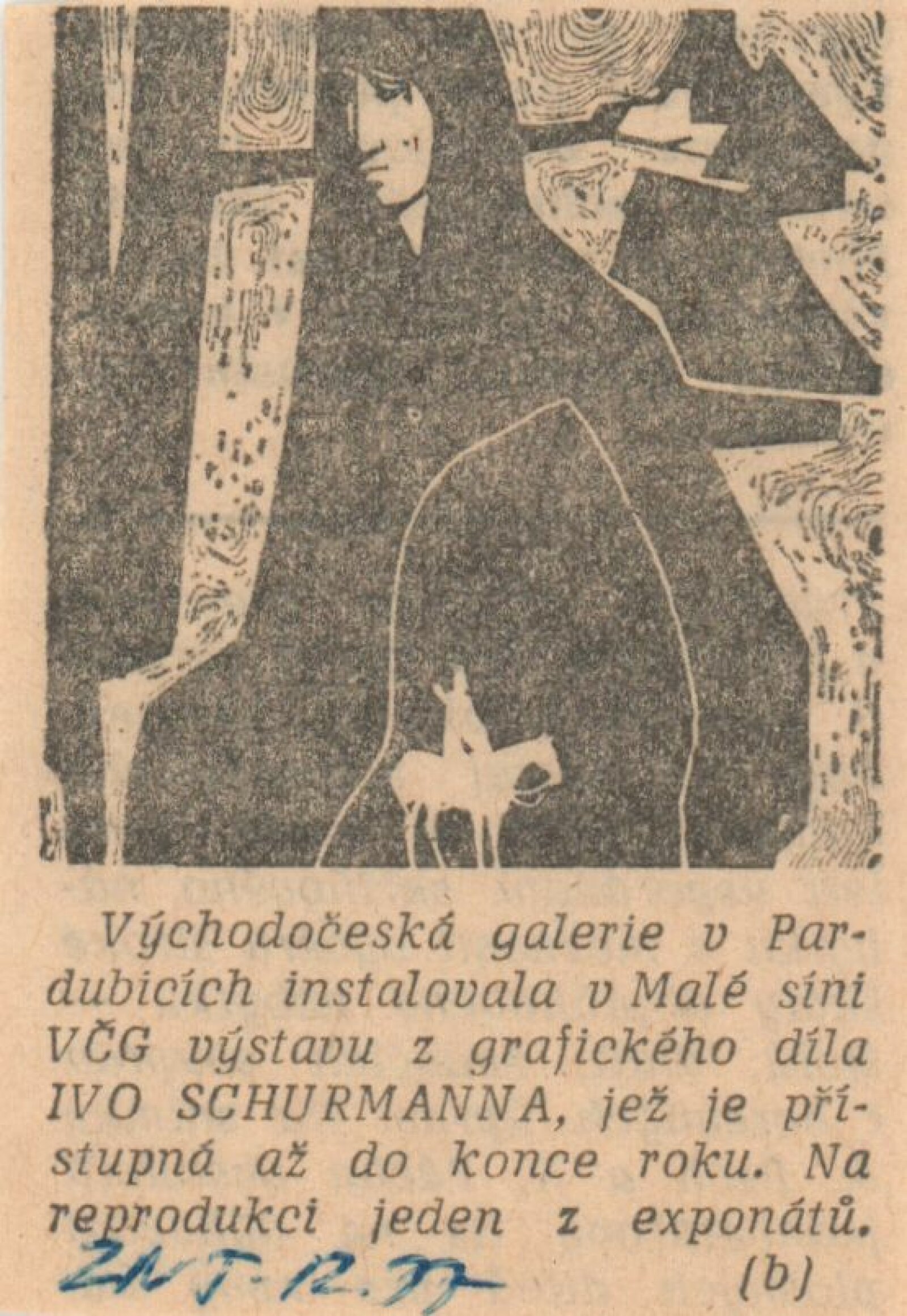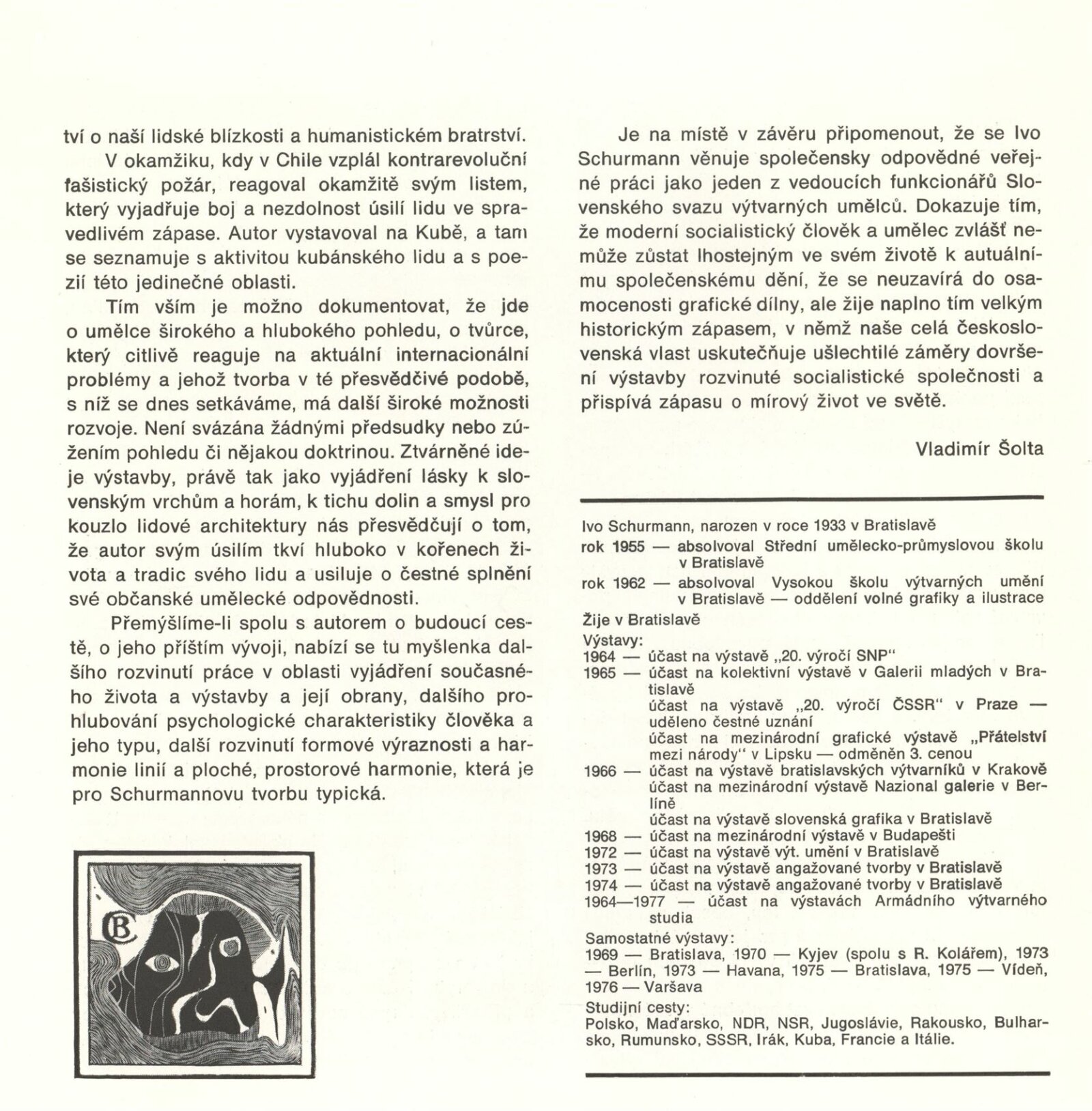 Ivo Schurmann. Grafika: Dům umění, hala, 30. 11. 1980 – 4. 1. 1981 / Převzatý katalog Ivo Schurmann. Text: Vladimír Štolfa. – Praha: Armádní výtvarné studio, 1977. – 12 s., obr., neobsahuje seznam vystavených prací, DU 719. – MZK; MG