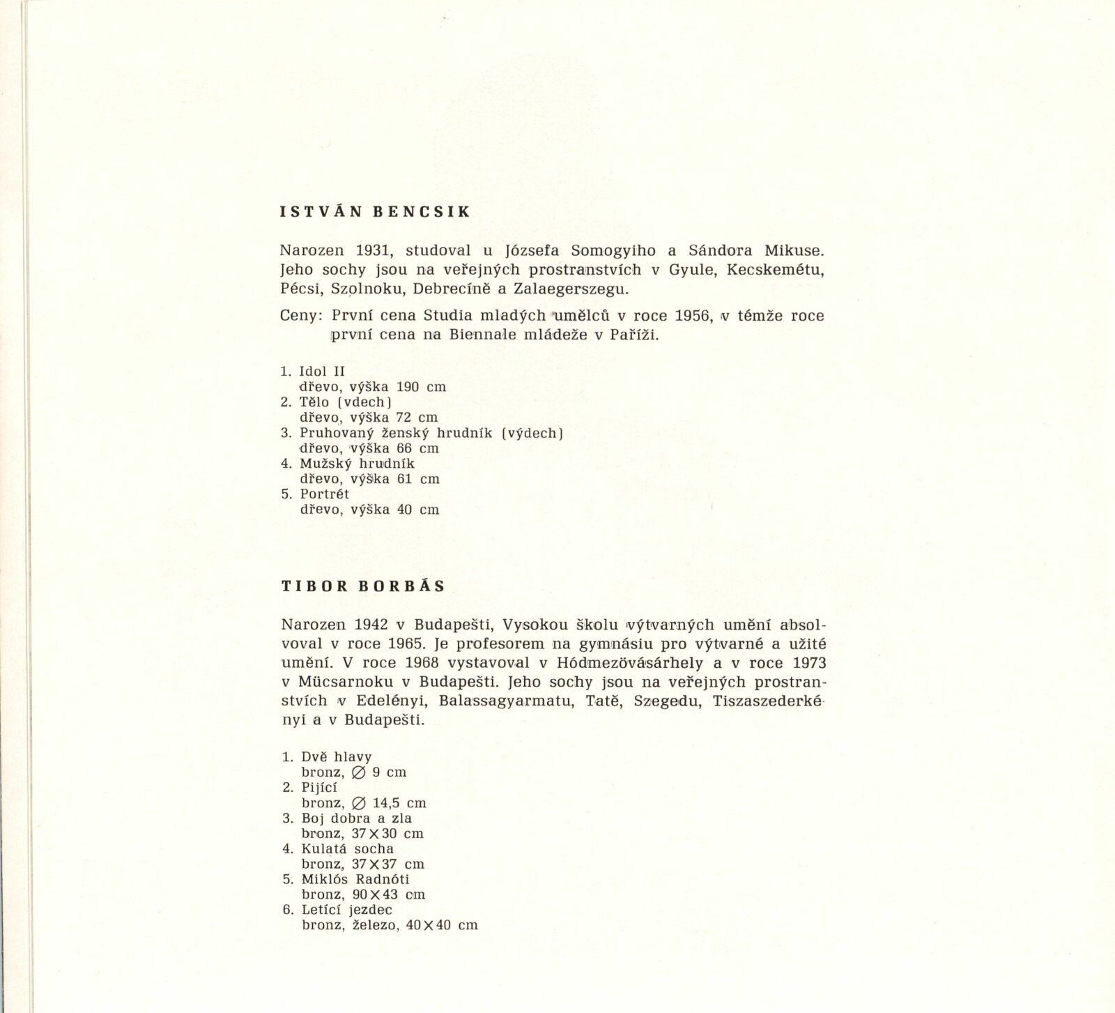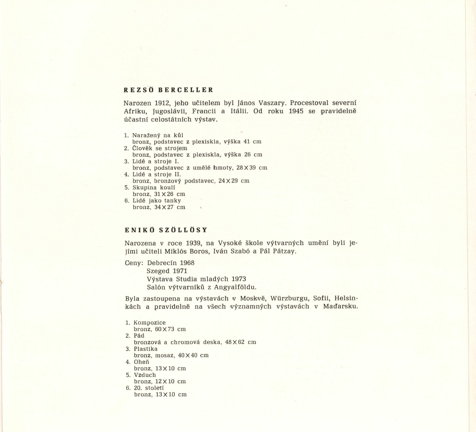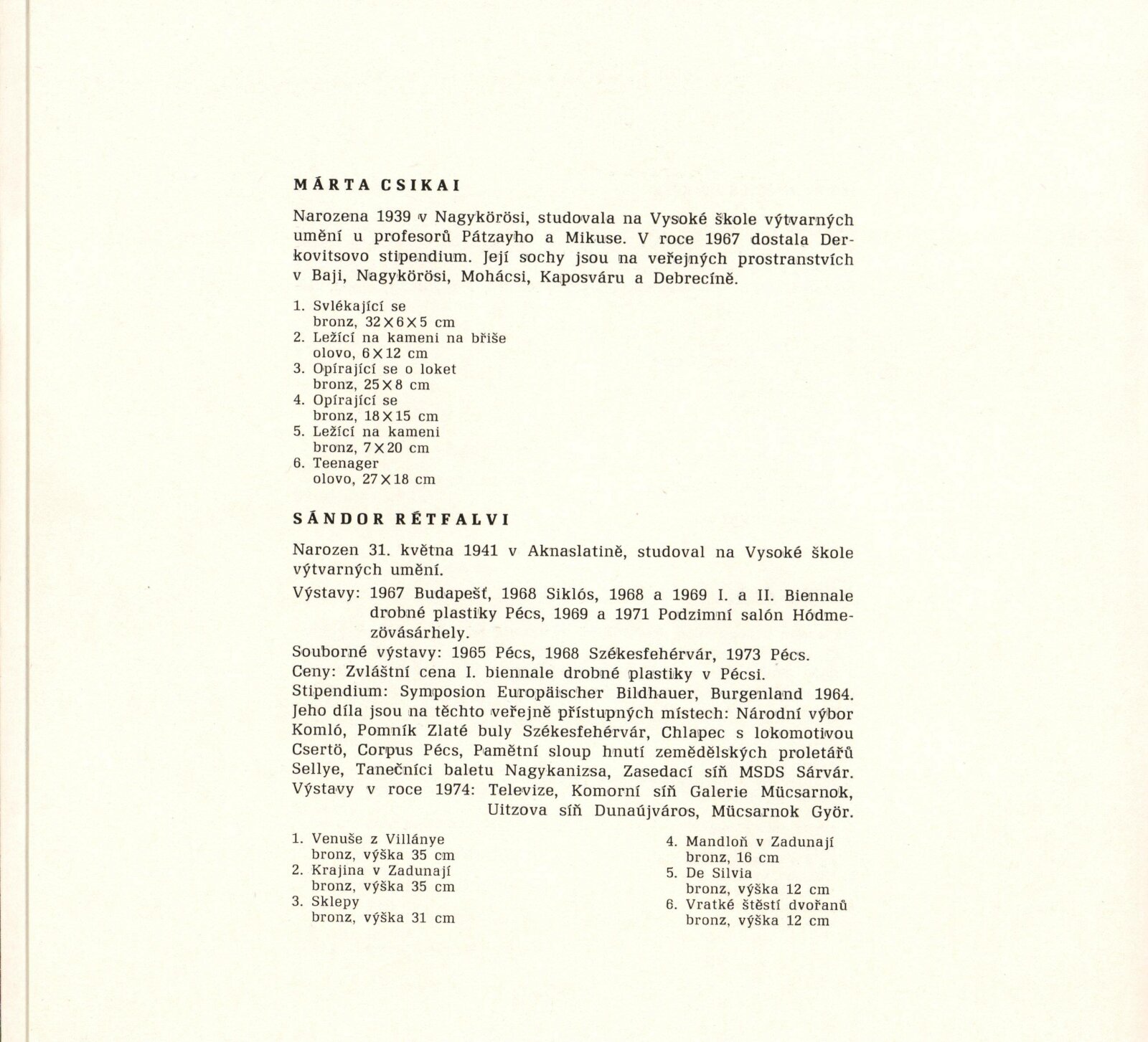 Maďarská medaile a drobná plastika: Dům umění / Dům pánů z Kunštátu, 30. 5. – 23. 6. 1975 / Převzatý katalog. Maďarská medaile a drobná plastika. Při příležitosti 30. výročí osvobození Maďarska: ve výstavní síni Staroměstské radnice, Praha, duben 1975 / Text: Ferenc Szamosi. – Praha: Galerie hlavního města Prahy, 1975. – 14 s., obr., životní data, DPK 599. – MZK