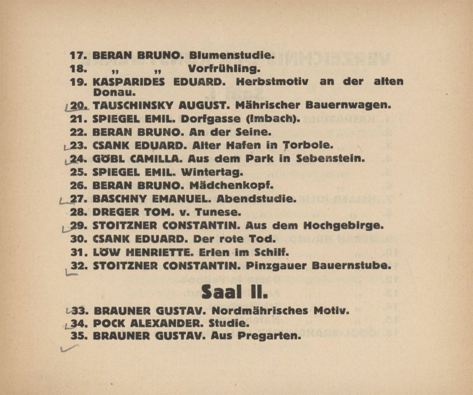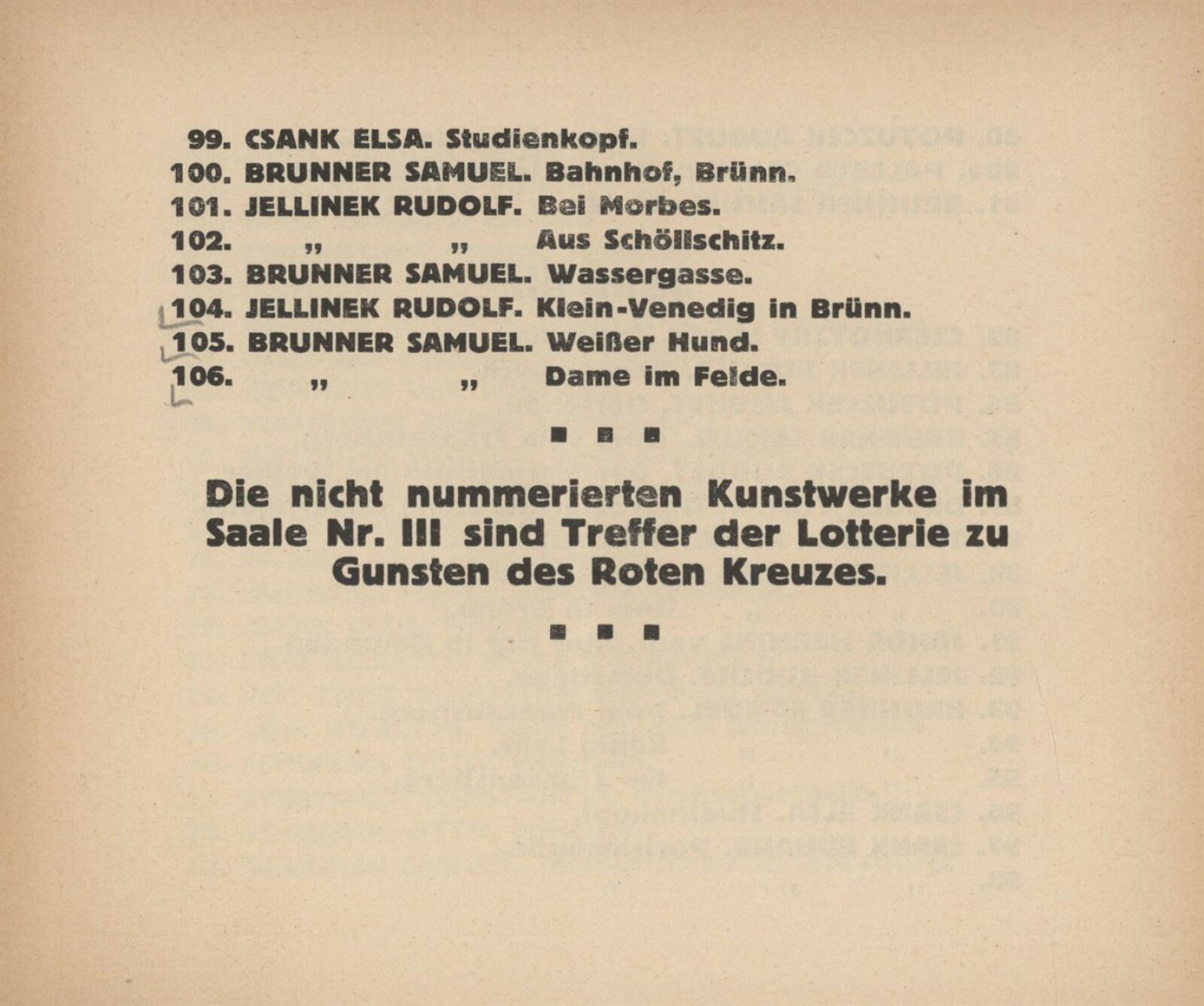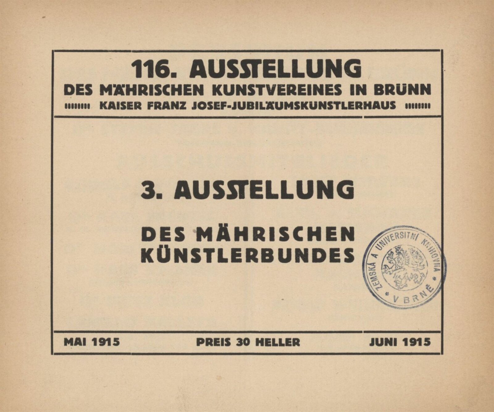 3. Ausstellung des Mährischen Künstlerbundes: 116. Ausstellung des Mährischen Kunstvereines in Brünn, Kaiser Franz Josef–Jubiläumskünsterhaus, květen–červen 1915/ Brünn: Mährischer Kunstverein, 1915. – 16 s. – Kubíček 7519; MZK; SVKOL; MG