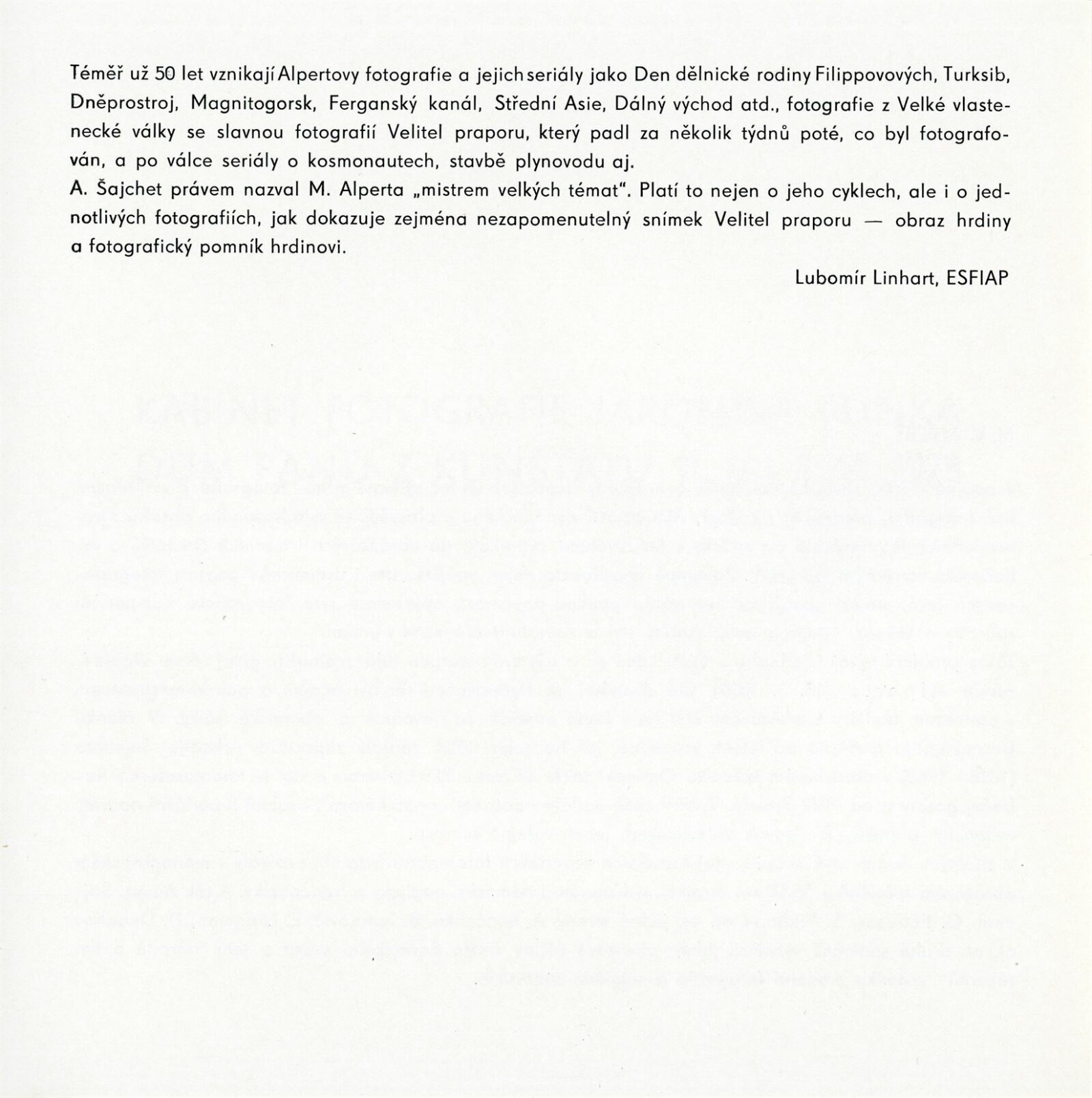 pozvánka, katalog, text katalogu, schválení tisku katalogu, foto z vernisáže, provozní korespondence, korespondenční lístky od Lubomíra Linharta, dopis I. F. Malcevu, žádost o povolení výstavy