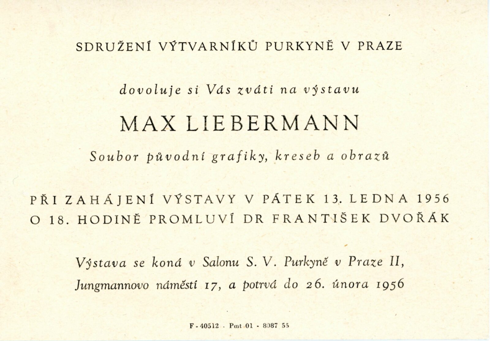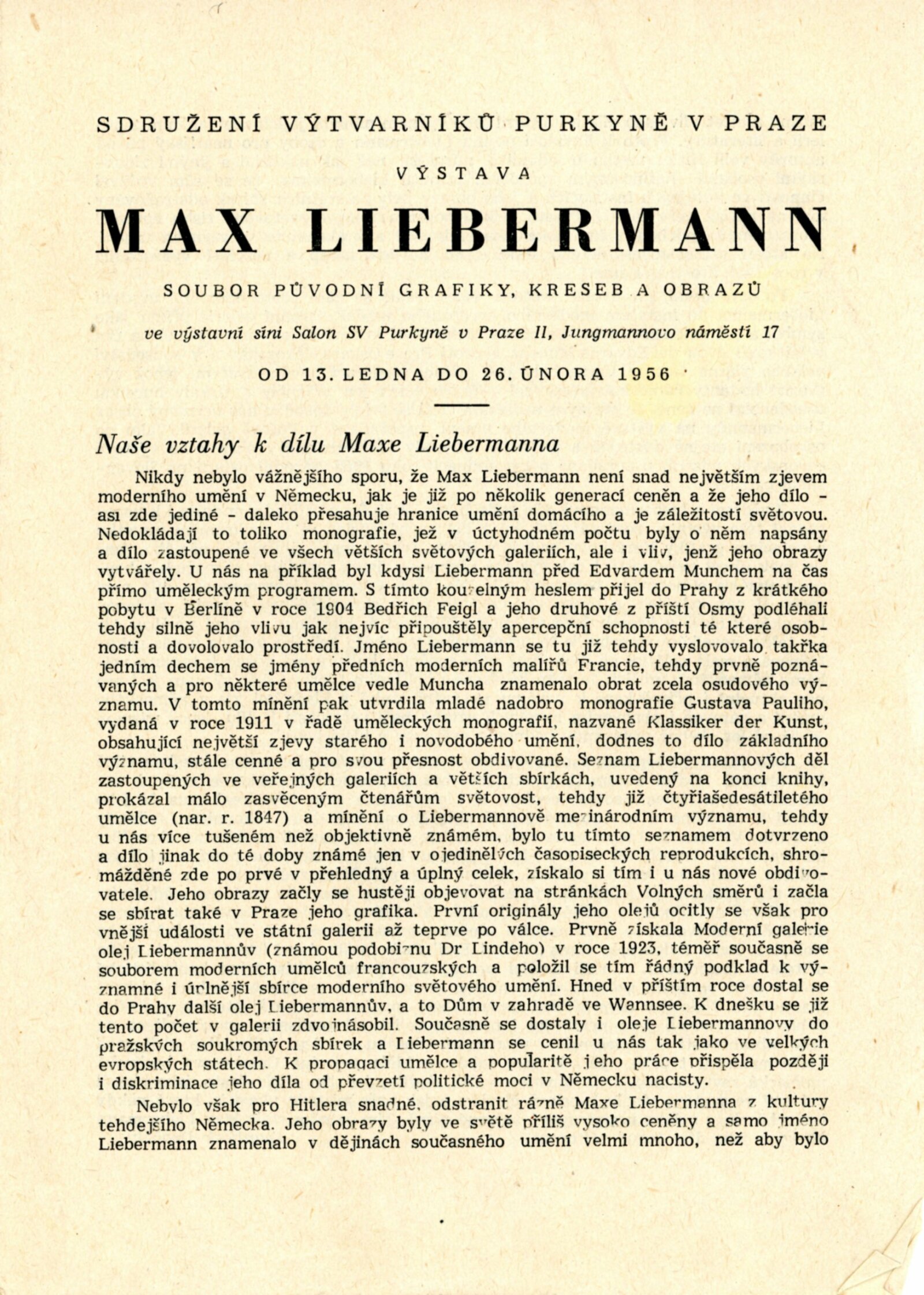 Max Liebermann. A. T. Steinlen. Výstava kreseb a původní grafiky: Dům umění města Brna, 22. 4. – 20. 5. 1956 / Text: Helena Motalová – Brno: DUmB, 1956. – 4 s., DU 249–250. – MG