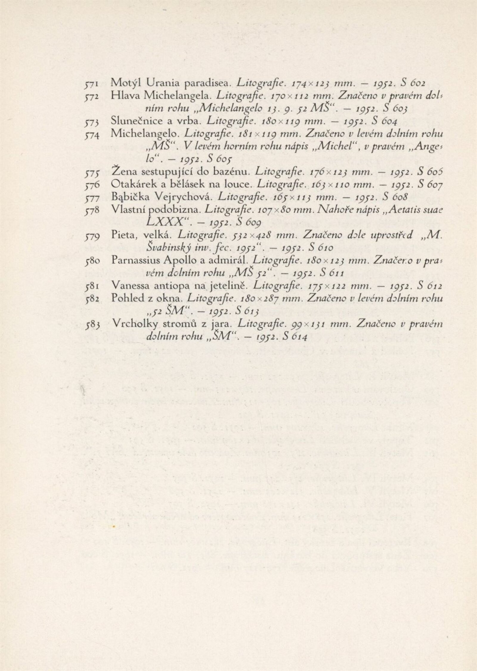 Max Švabinský: Dům umění, 23. 5. – 31. 6. 1954 / Převzatý katalog. Národní umělec Max Švabinský. Souborná jubilejní výstava malířského a kreslířského díla k osmdesátým narozeninám umělcovým: Slovanský ostrov v Praze, 17. 9. – 15. 11. 1953 / Text: Jan Květ. – Praha: ÚSČSVU, 1953. – 55 s., 47 s. obr. příl., DU 198. – MZK