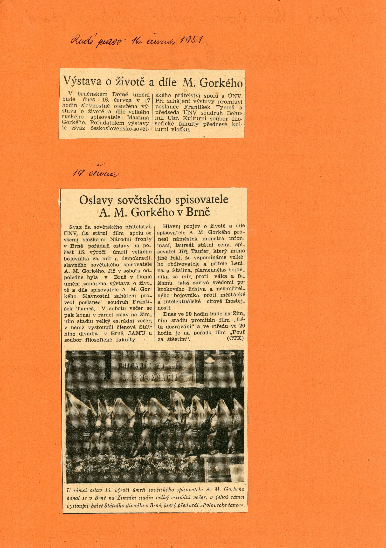 Maxim Gorkij: Dům umění, 16. 6. – 1. 7. 1951 / Převzatý katalog. Maxim Gorkij. Život a dílo: Výstavní síň Československého spisovatele, červen 1951 / Texty: Josef Kadlec, Bohumil Mathesius. – Praha: Svaz československo-sovětského přátelství, 1951. – 16 s., obr., DU 159. – MZK