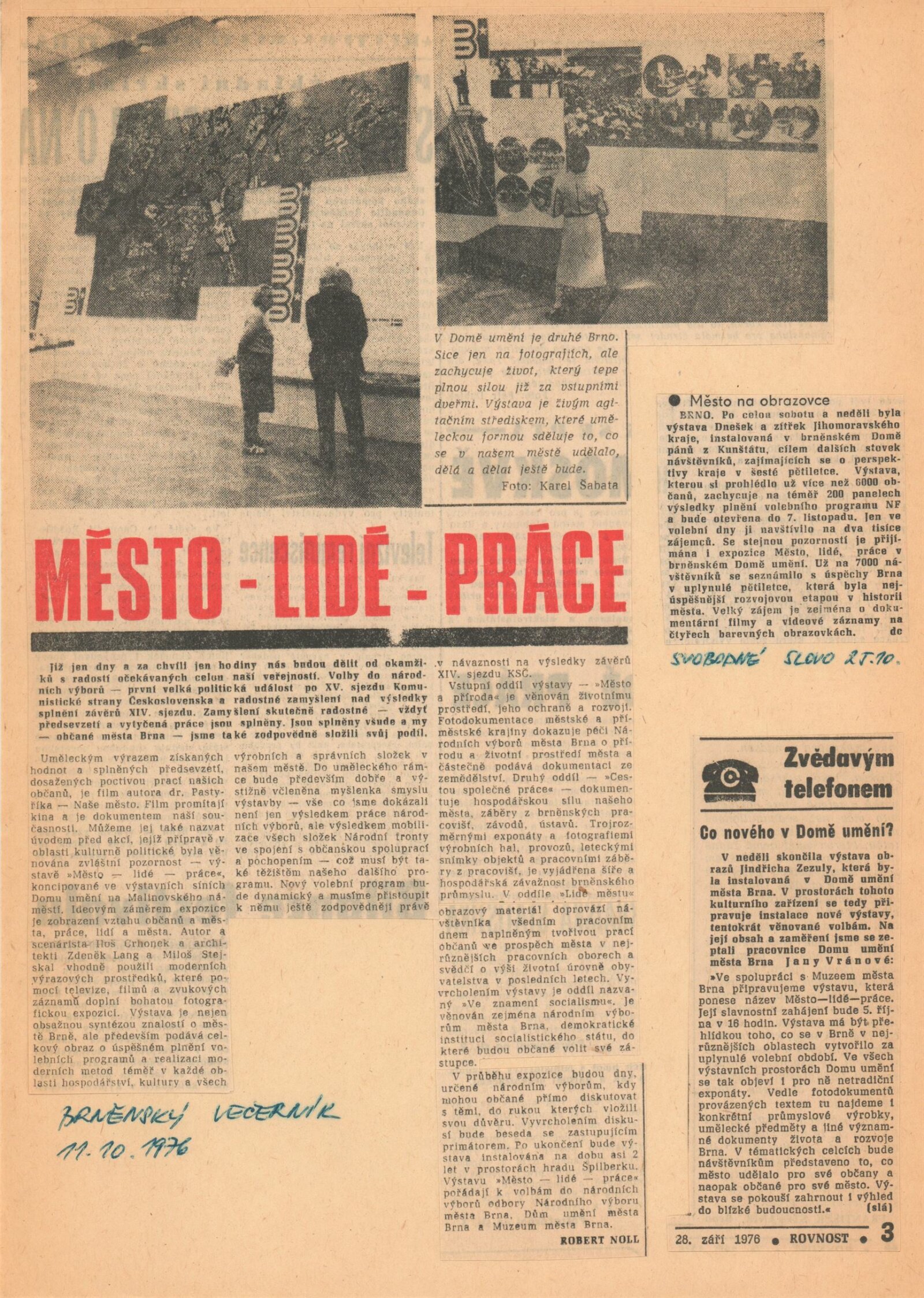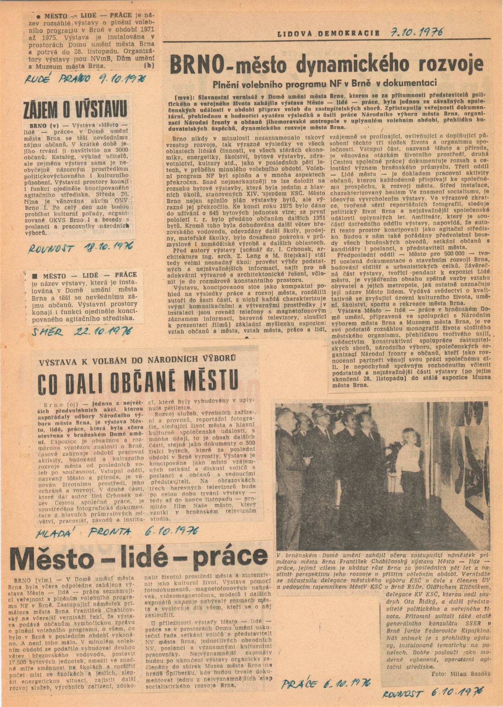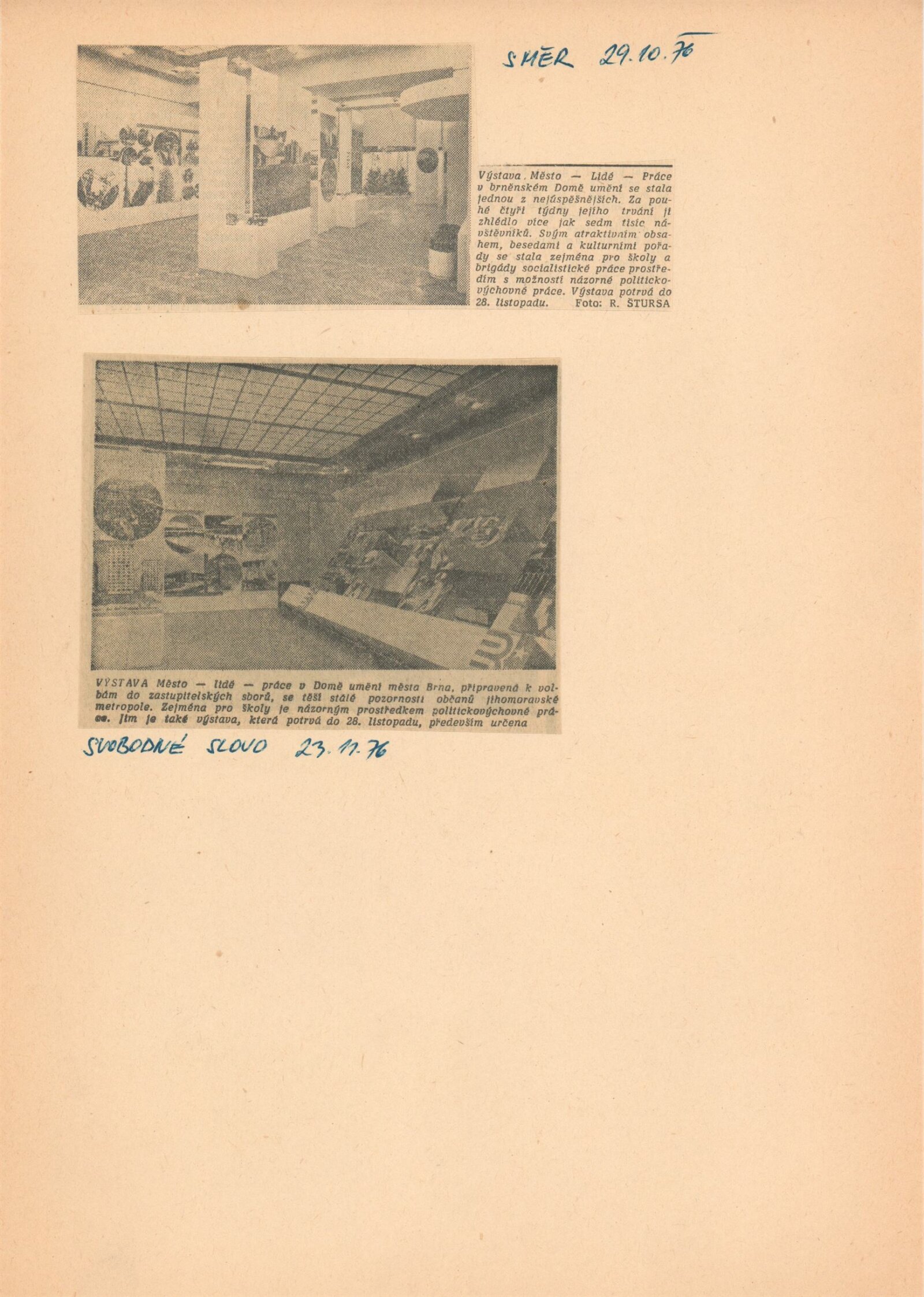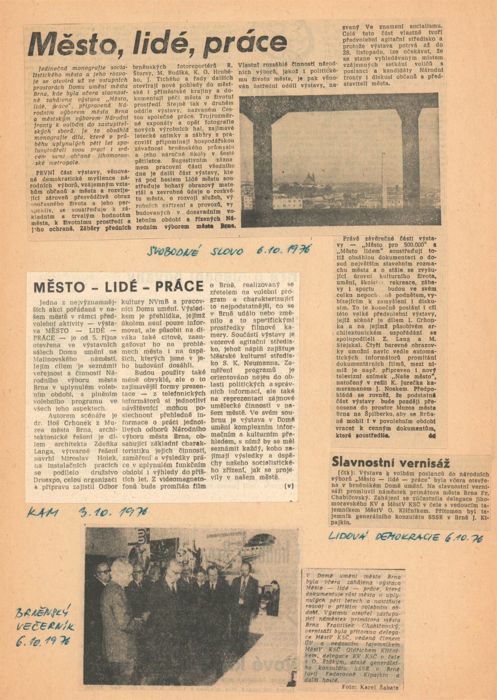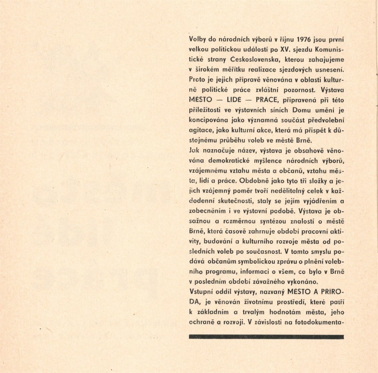Město, lidé, práce. Výstava k volbám do národních výborů: Dům umění města Brna, 5. 10. – 28. 11. 1976 / Text: anonymní. – Brno: DUmB, 1976. – 14 s., obr., DU 645. – MG