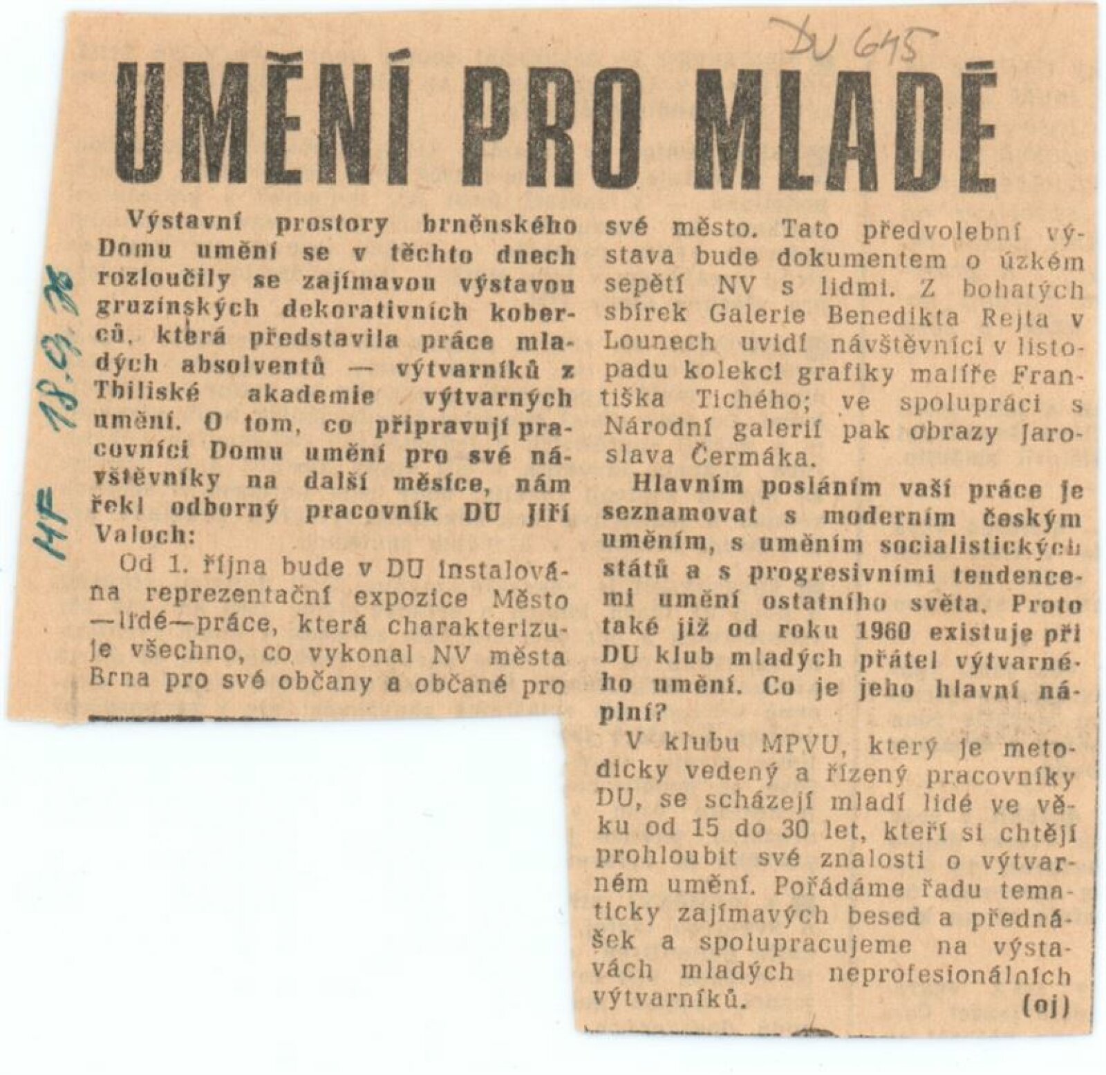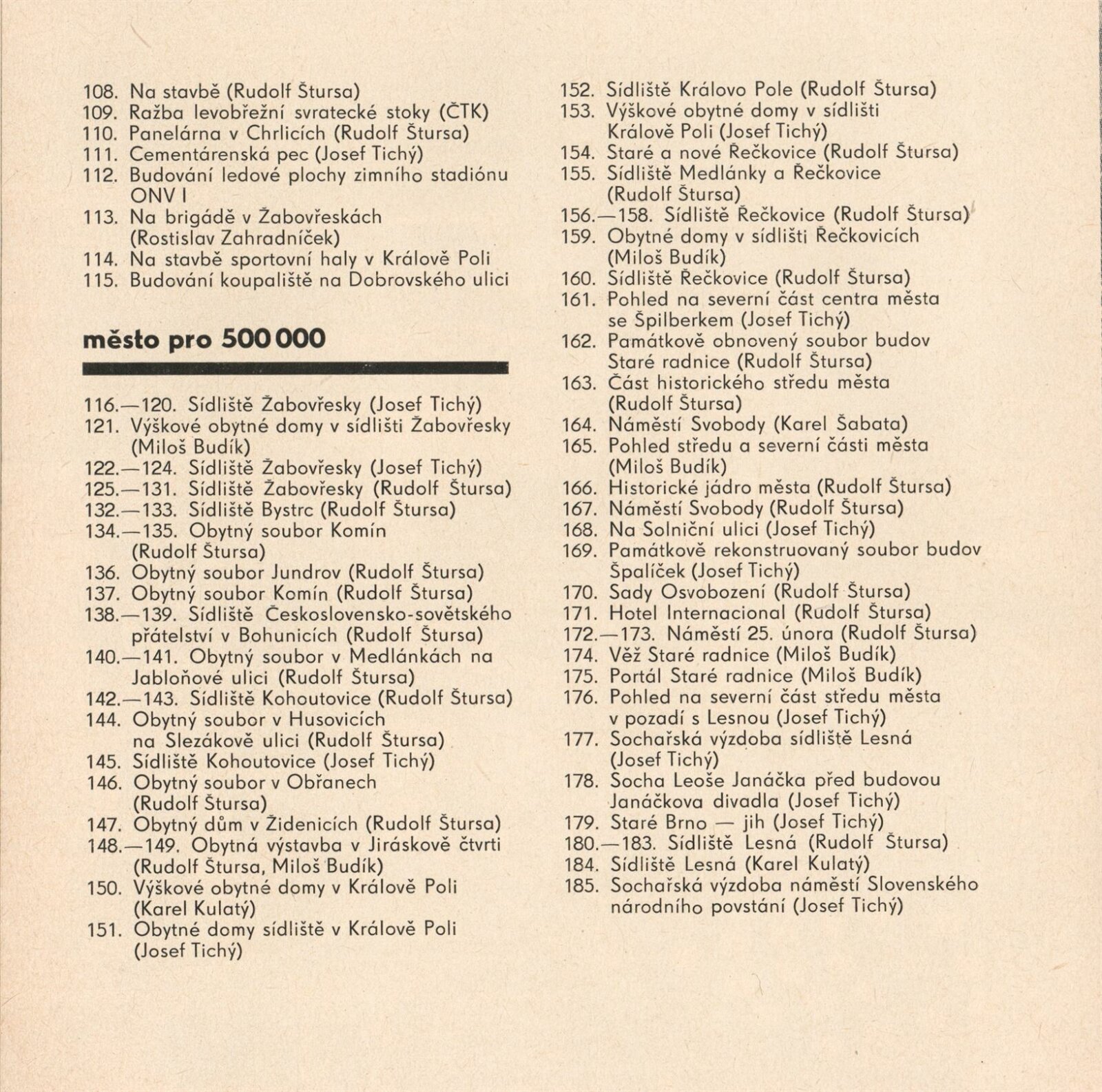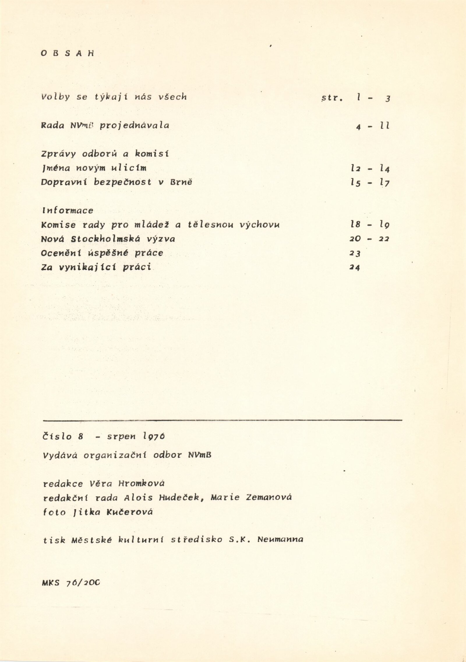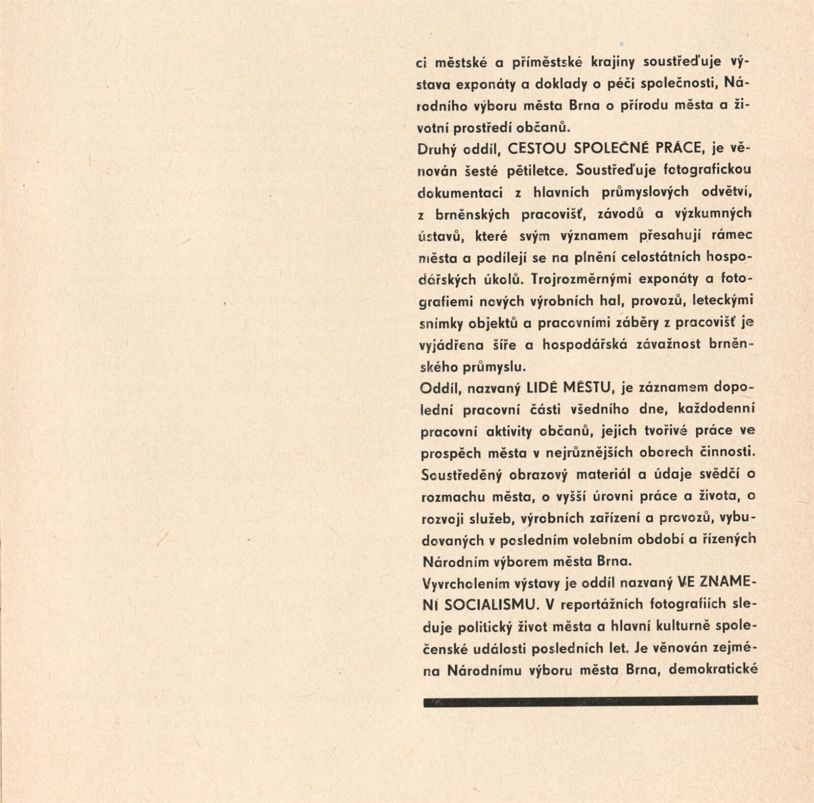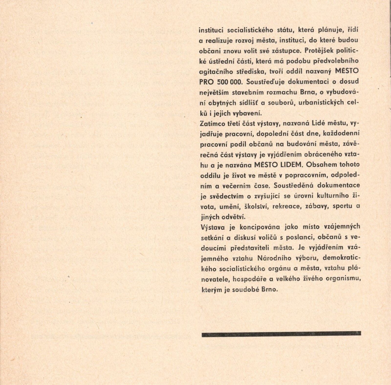 Město, lidé, práce. Výstava k volbám do národních výborů: Dům umění města Brna, 5. 10. – 28. 11. 1976 / Text: anonymní. – Brno: DUmB, 1976. – 14 s., obr., DU 645. – MG