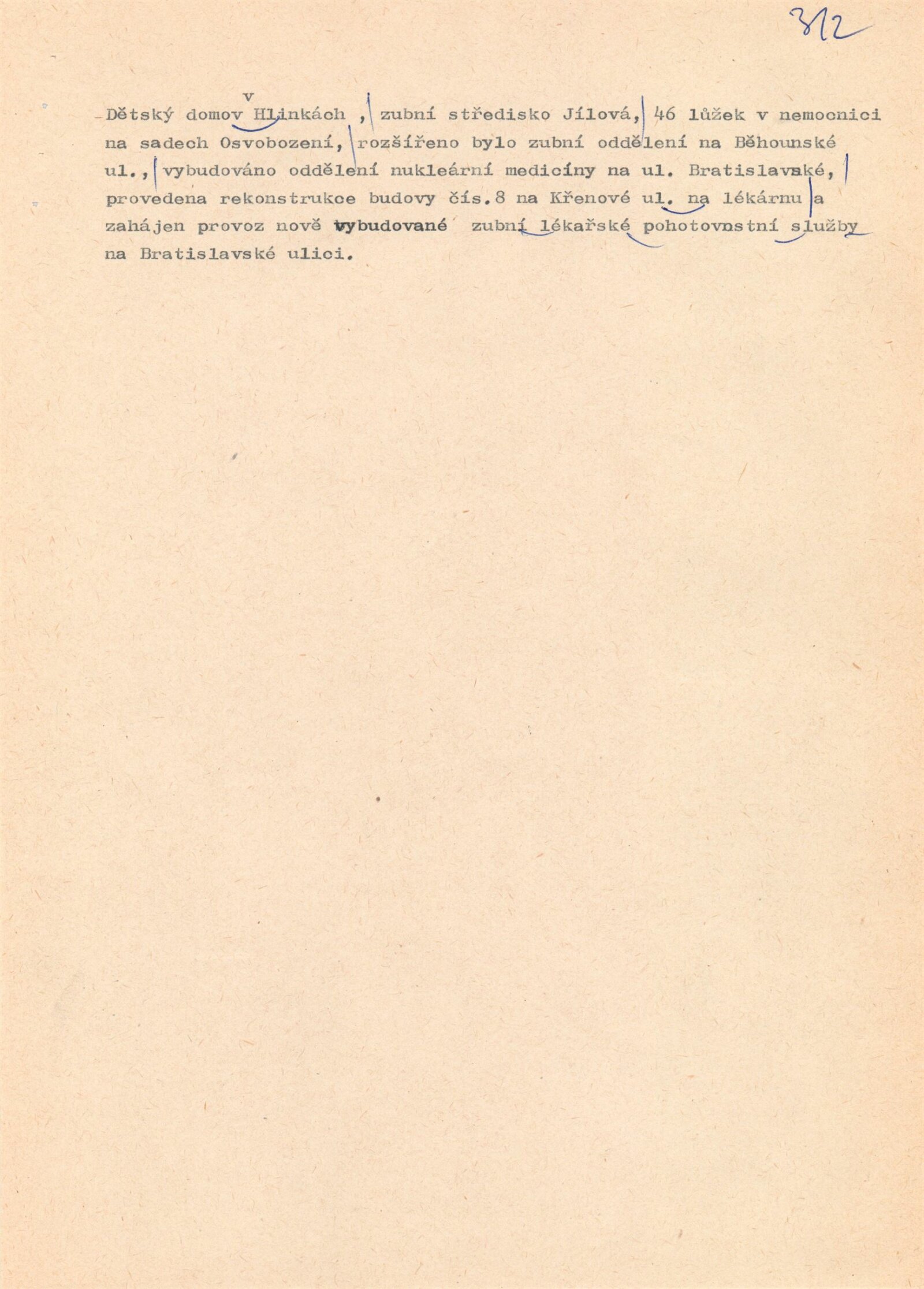 pozvánka, katalog, fotografie výstavy, zpráva o výstavě, poděkování náměstka primátora, provozní korespondence (financování, prezenční listina, zápisy z porad), podklady pro výstavu a katalog – technický projekt (texty jednotlivých odborů, půdorysné plány výstavy), informační zpravodaj NVmB, recenze v tisku