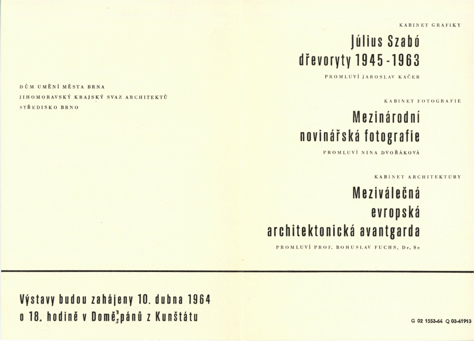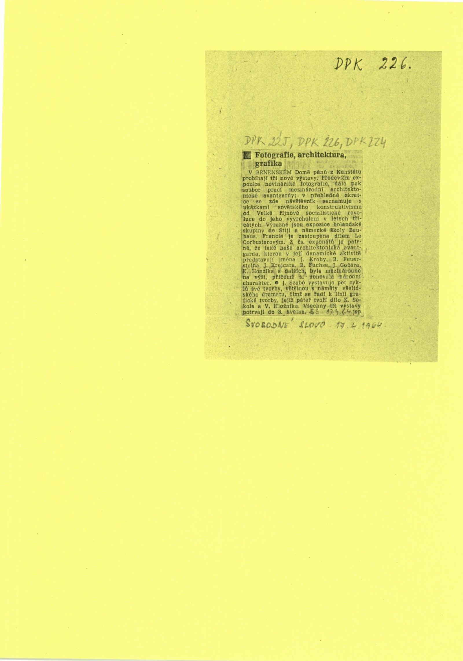 společná pozvánka DPK 224–226, karta k výstavě, seznam vystavených děl, korespondence (dopis zmiňující založení skupiny Nova a výstavu mezinárod. fotografie: M. Jodas, Adolf Kroupa, převoz výstavy do Brna: V. Kropp), recenze v tisku