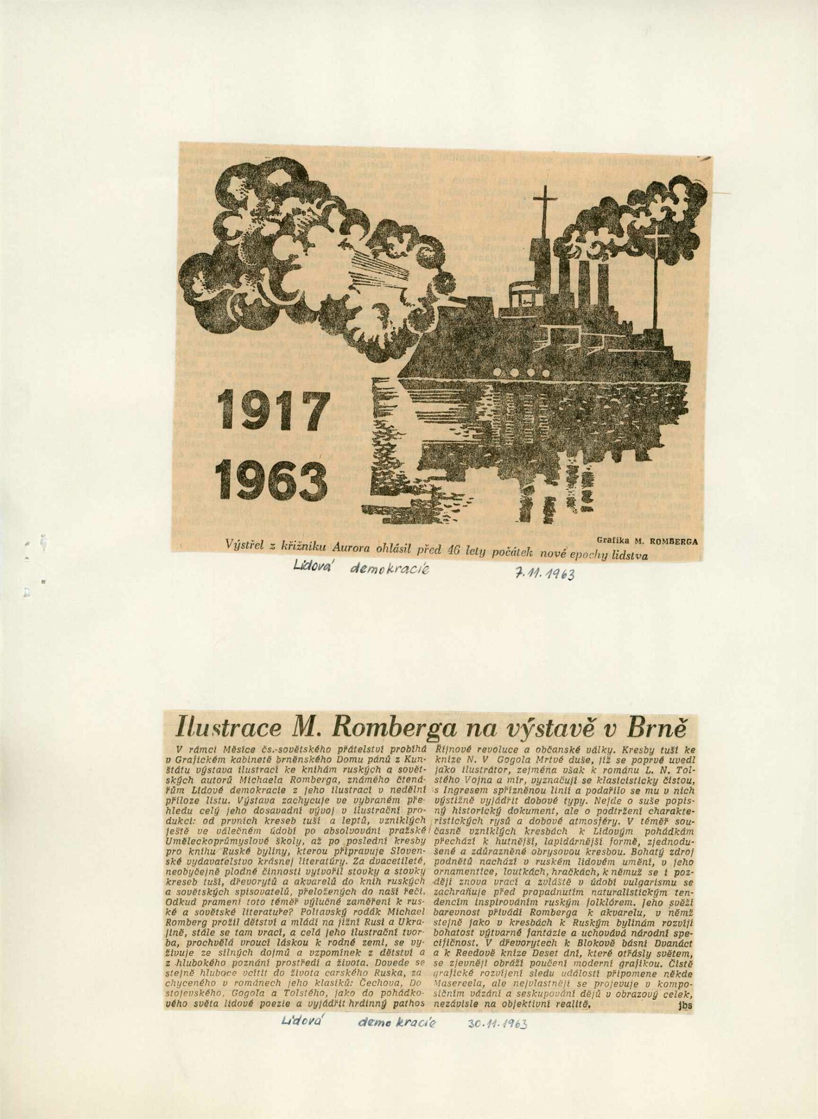 Michael Romberg. Ilustrace k ruské a sovětské literatuře: Dům umění města Brna / Dům pánů z Kunštátu, 48. výstava Kabinetu grafiky, 8. 11. 1963 – 1. 1. 1964 / Text: René Murat. – Brno: DUmB, 1963. – skládačka, 8 s., obr., DPK 208. – MZK; MG