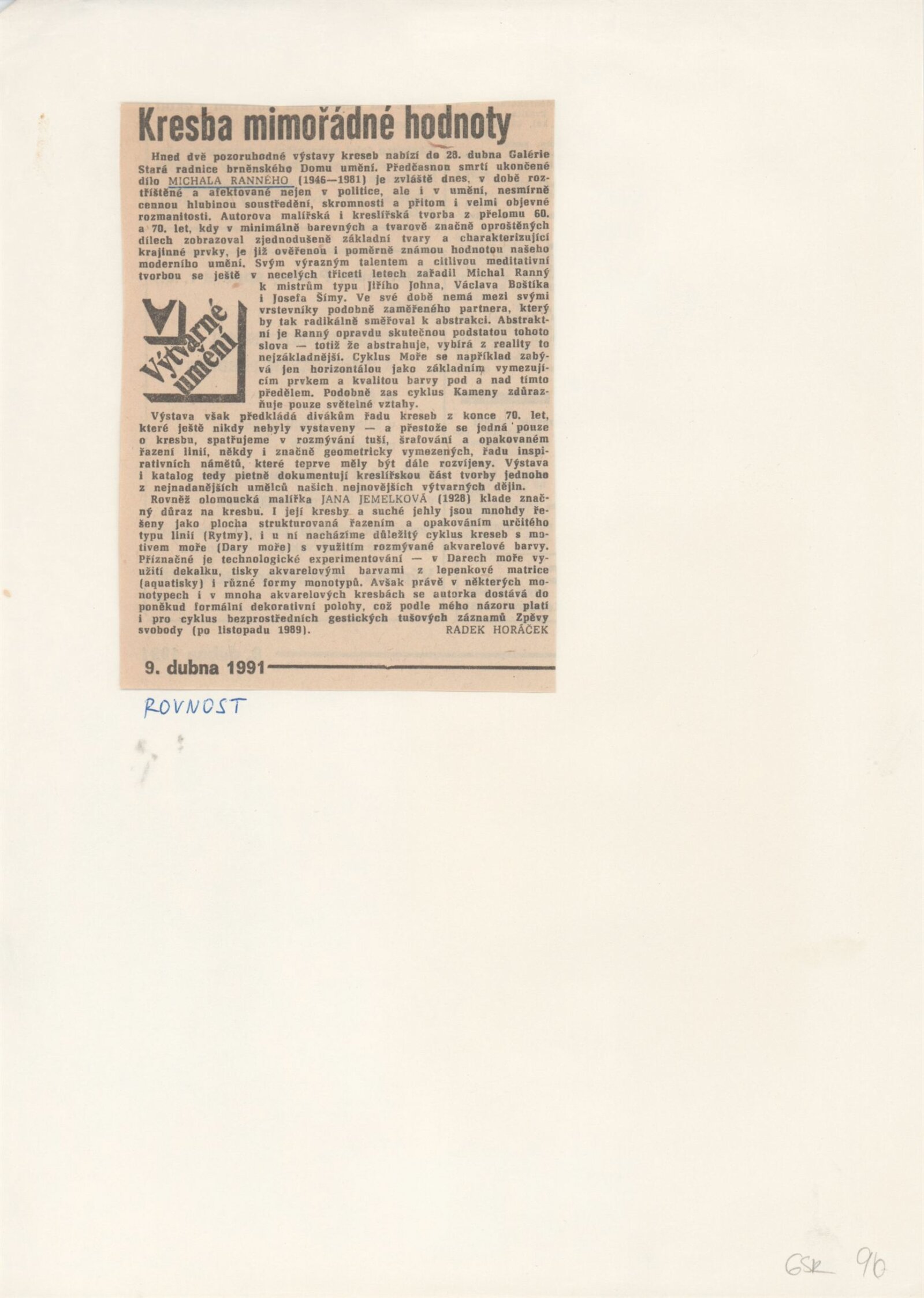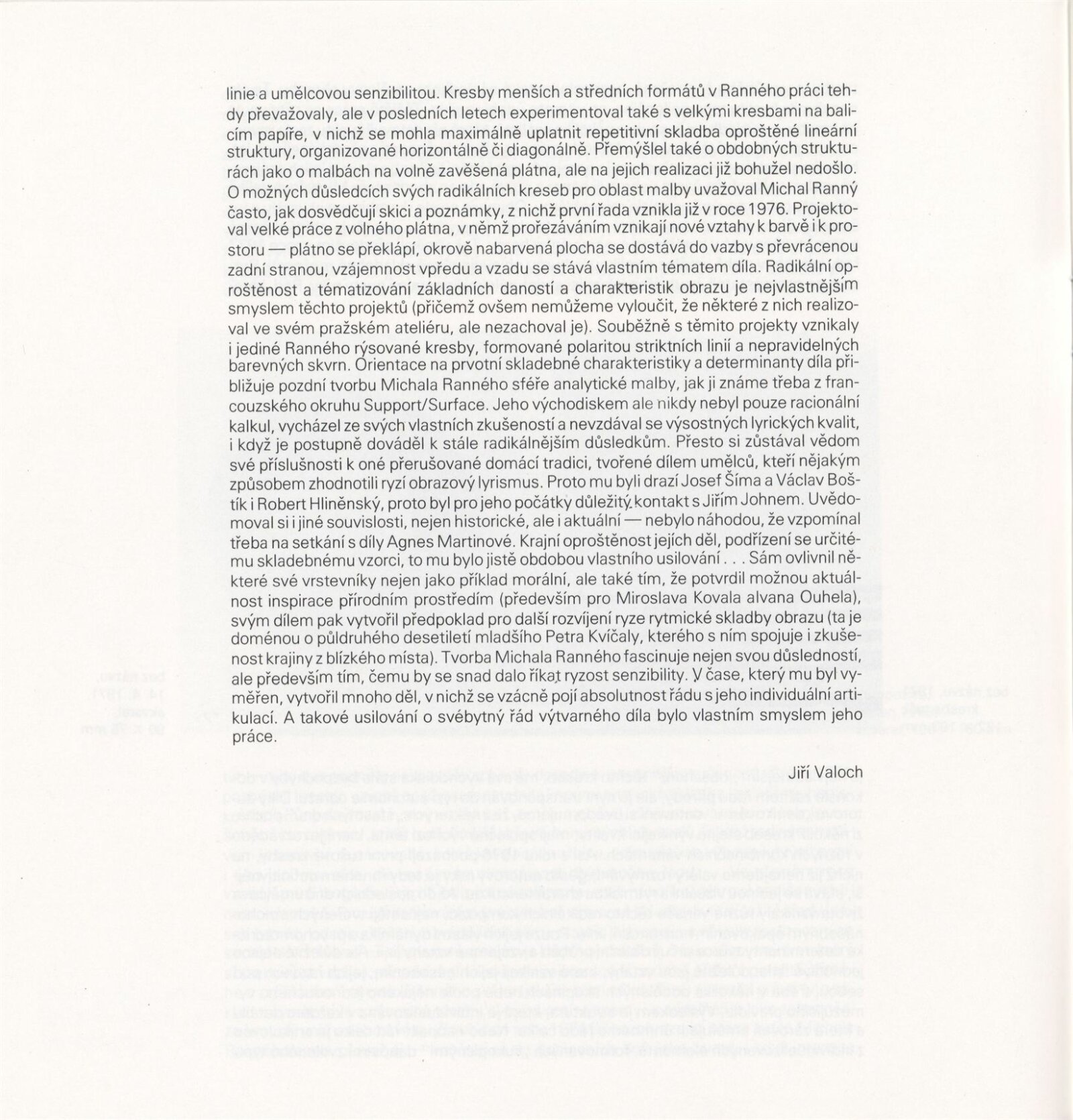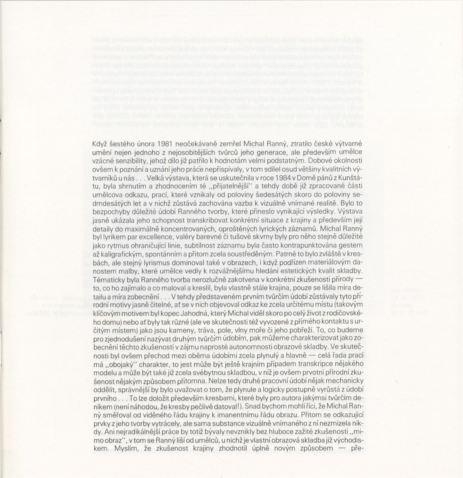 Michal Ranný. Kresby: Galerie Stará radnice, Kabinet grafiky, 26. 3. – 28. 4. 1991 / Text: Jiří Valoch. – Brno: DUmB, 1991. – [24] s., obr., životní data, výstavy, zastoupení ve sbírkách, GSR 96. –MZK; MG