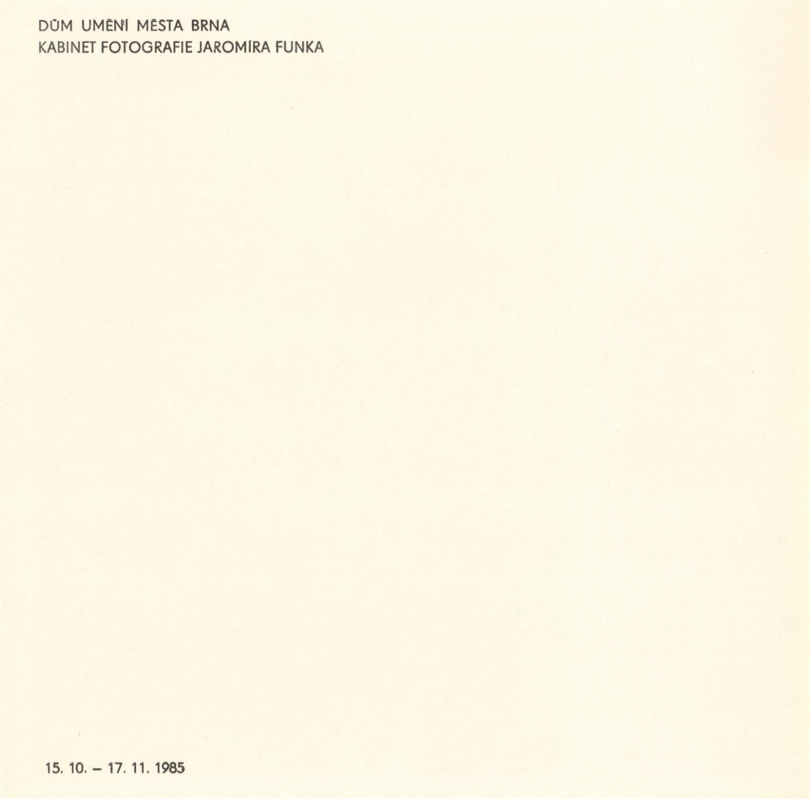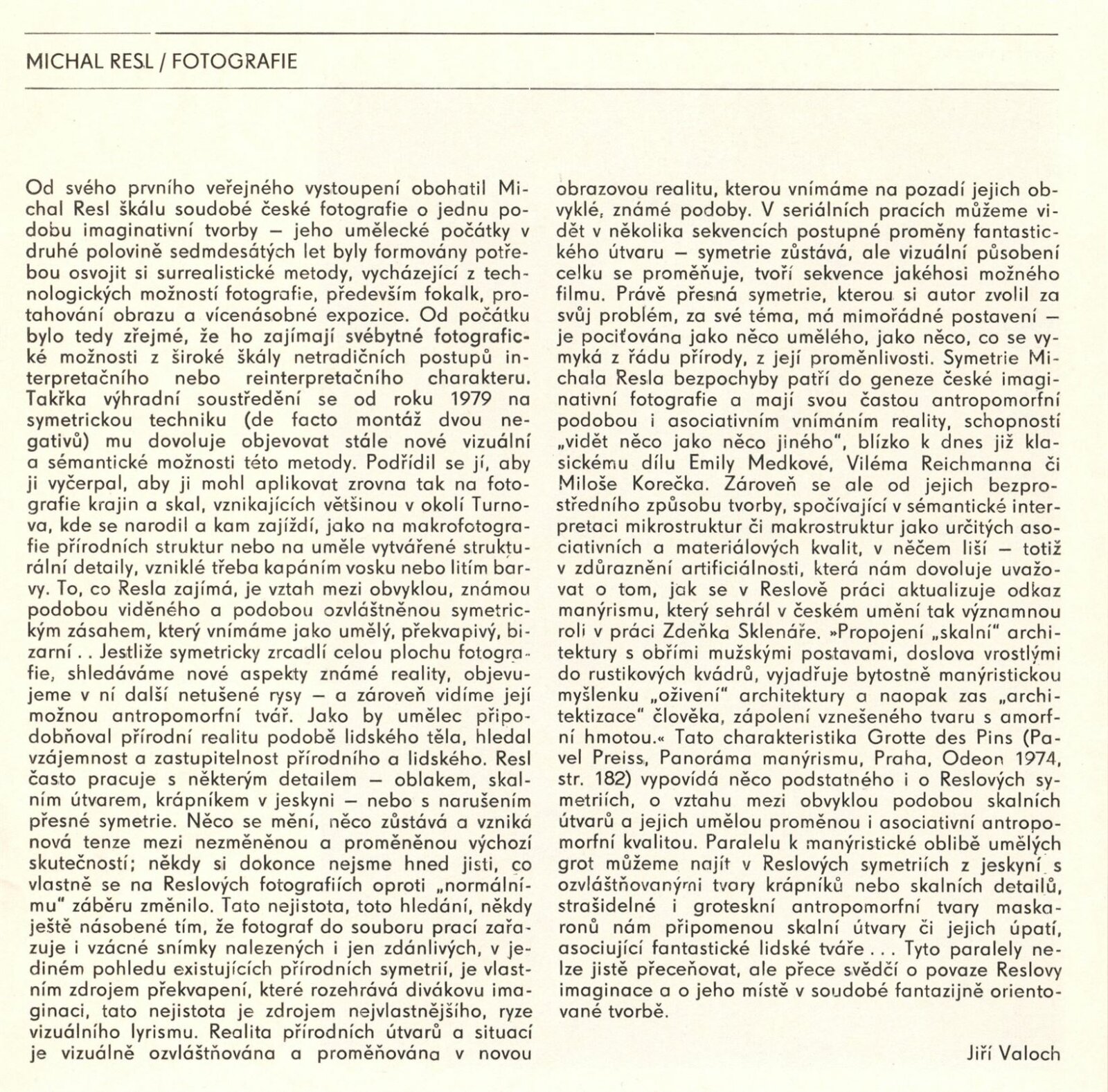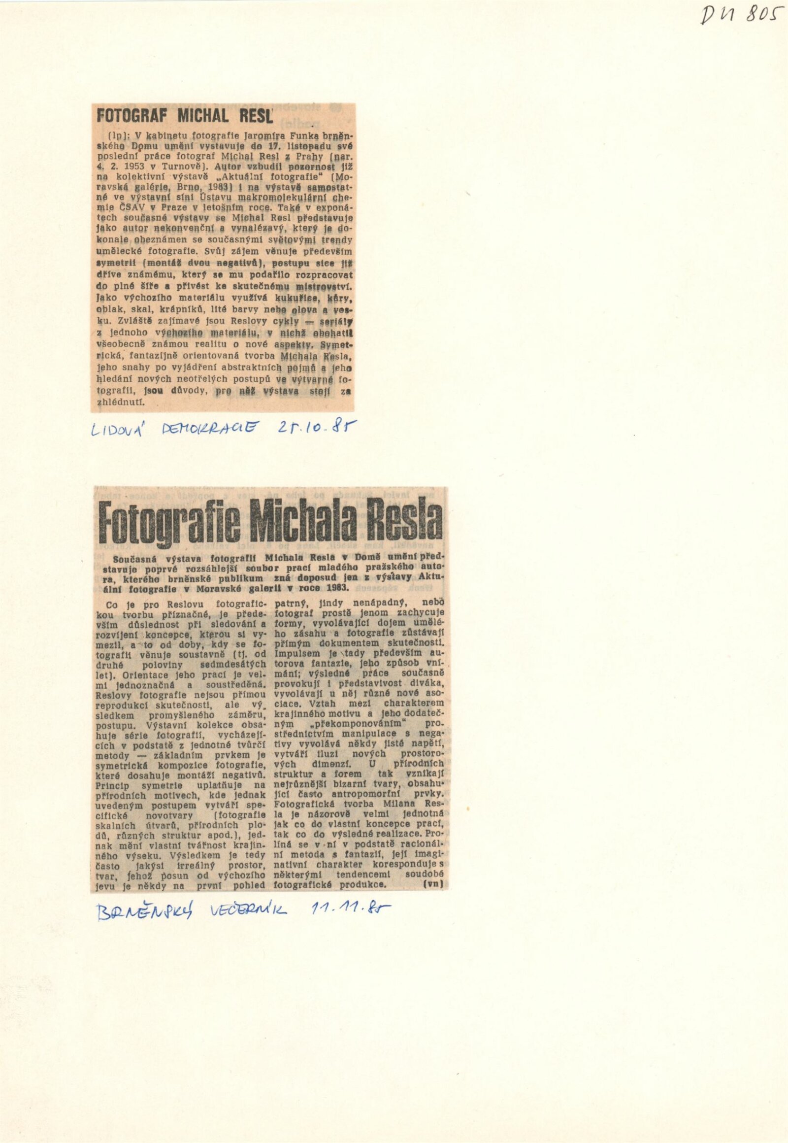 Michal Resl. Fotografie: Dům umění / Dům pánů z Kunštátu, Kabinet fotografie Jaromíra Funka, 15. 10. – 17. 11. 1985 / Text: Jiří Valoch. – Brno: DUmB, 1985. – 13 s., obr., životní data, výstavy, DU 805. – MZK; MG