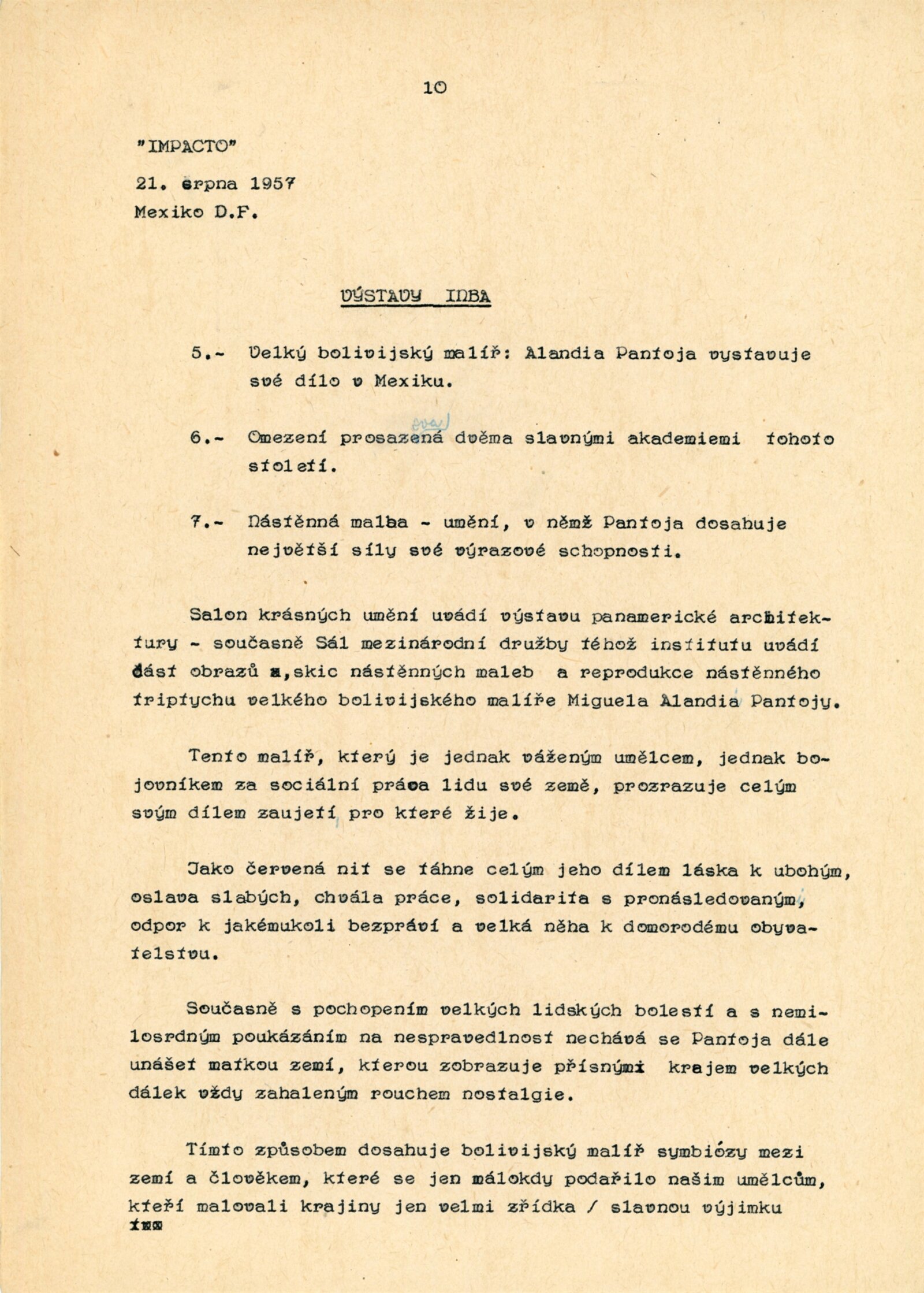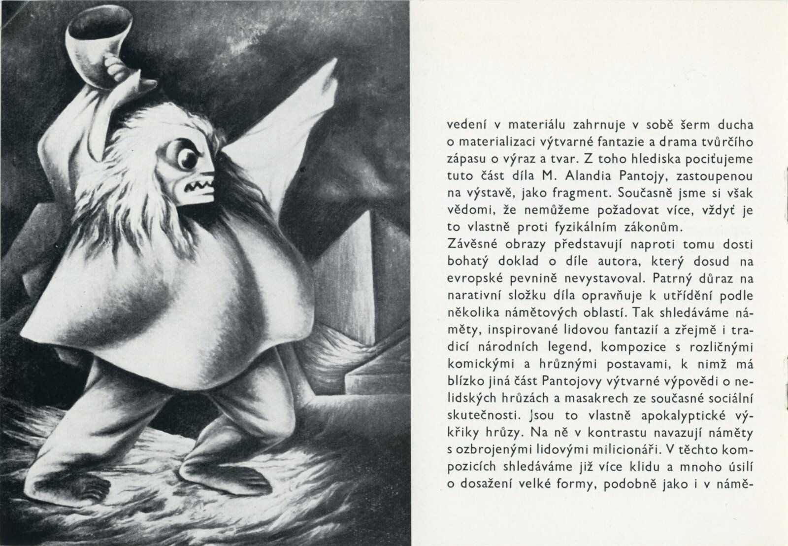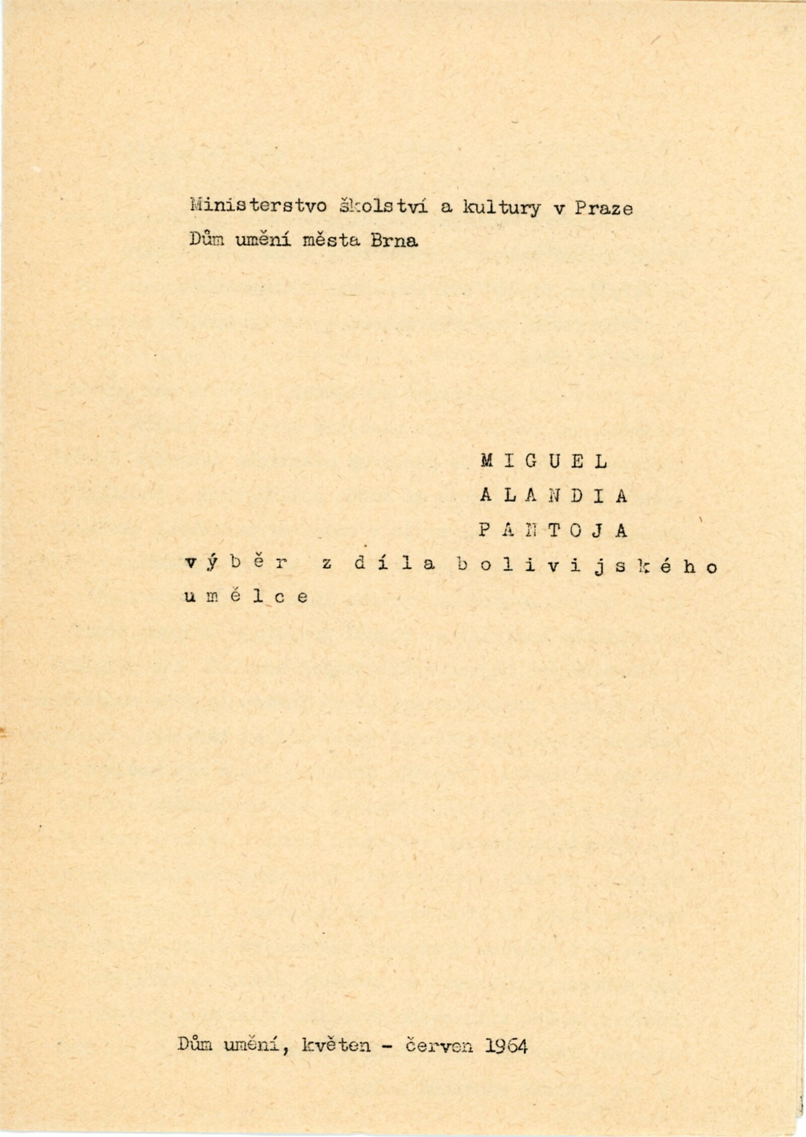 Miguel Alandia Pantoja. Výběr z díla bolivijského umělce: Dům umění města Brna, hala, Galerie Jaroslava Krále, 27. 5. – 28. 6. 1964 / Text: Jaroslav Kačer. – Brno: DUmB, 1964. – 10 s., obr., DU 431. – MZK; MG