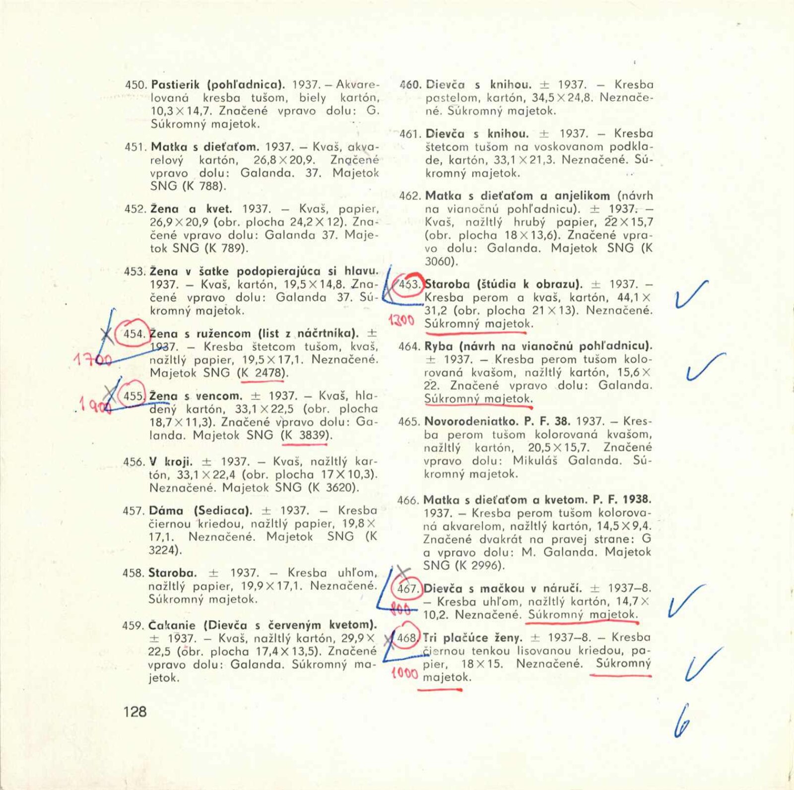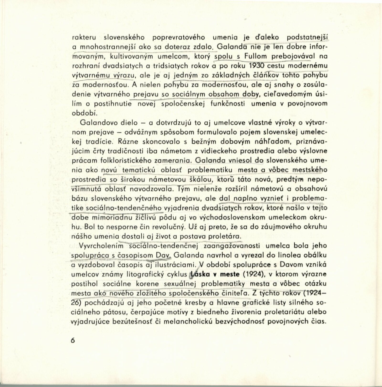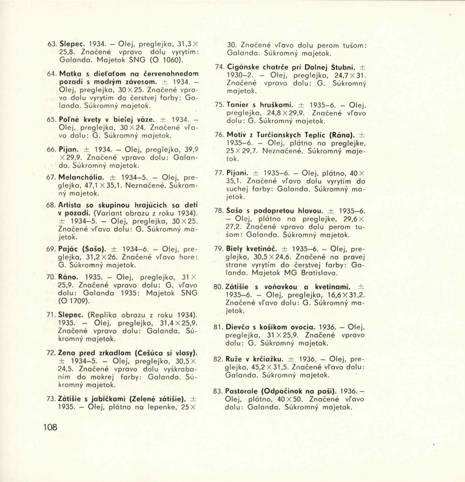 Mikuláš Galanda. Souborné dílo: Dům umění města Brna / Dům pánů z Kunštátu, 19. 1. – 23. 2. 1964 / Převzatý katalog. Dielo Mikuláša Galandu: Slovenská národná galéria Bratislava, září–prosinec 1963 / Text Karol Vaculík, z myšlienok Mikuláša Galandu. – Bratislava: Slovenská národná galéria, 1963. – 139 s., obr., životní data, výstavy, bibliografie, DPK 212. – MZK