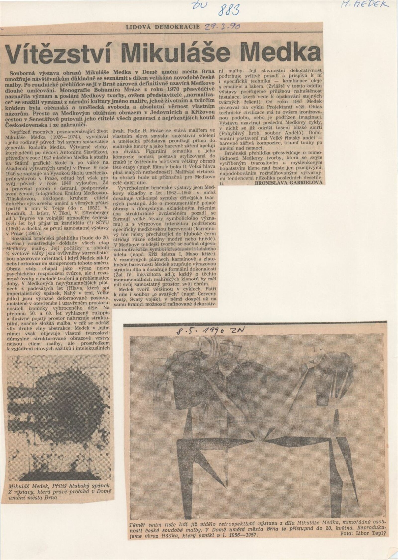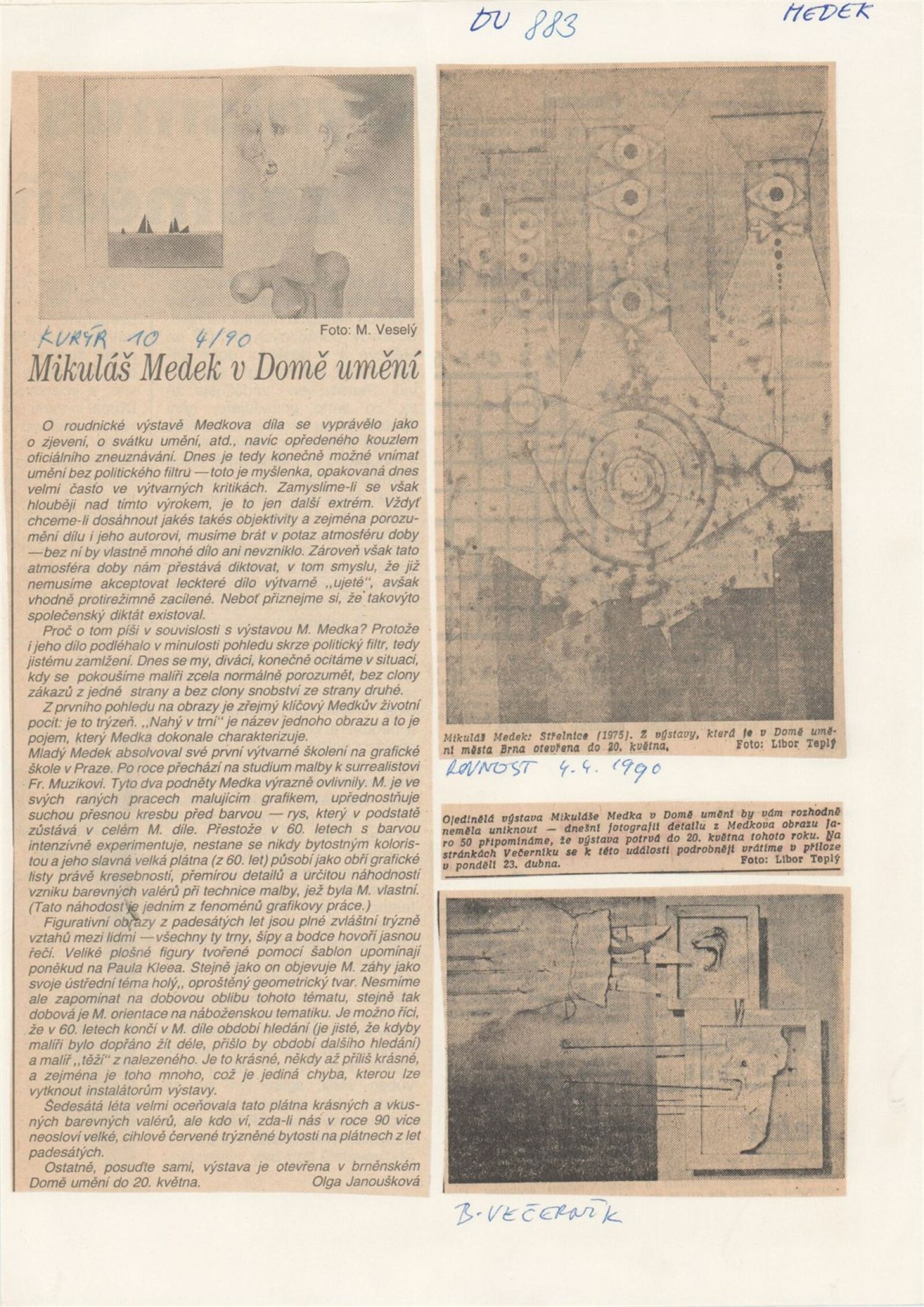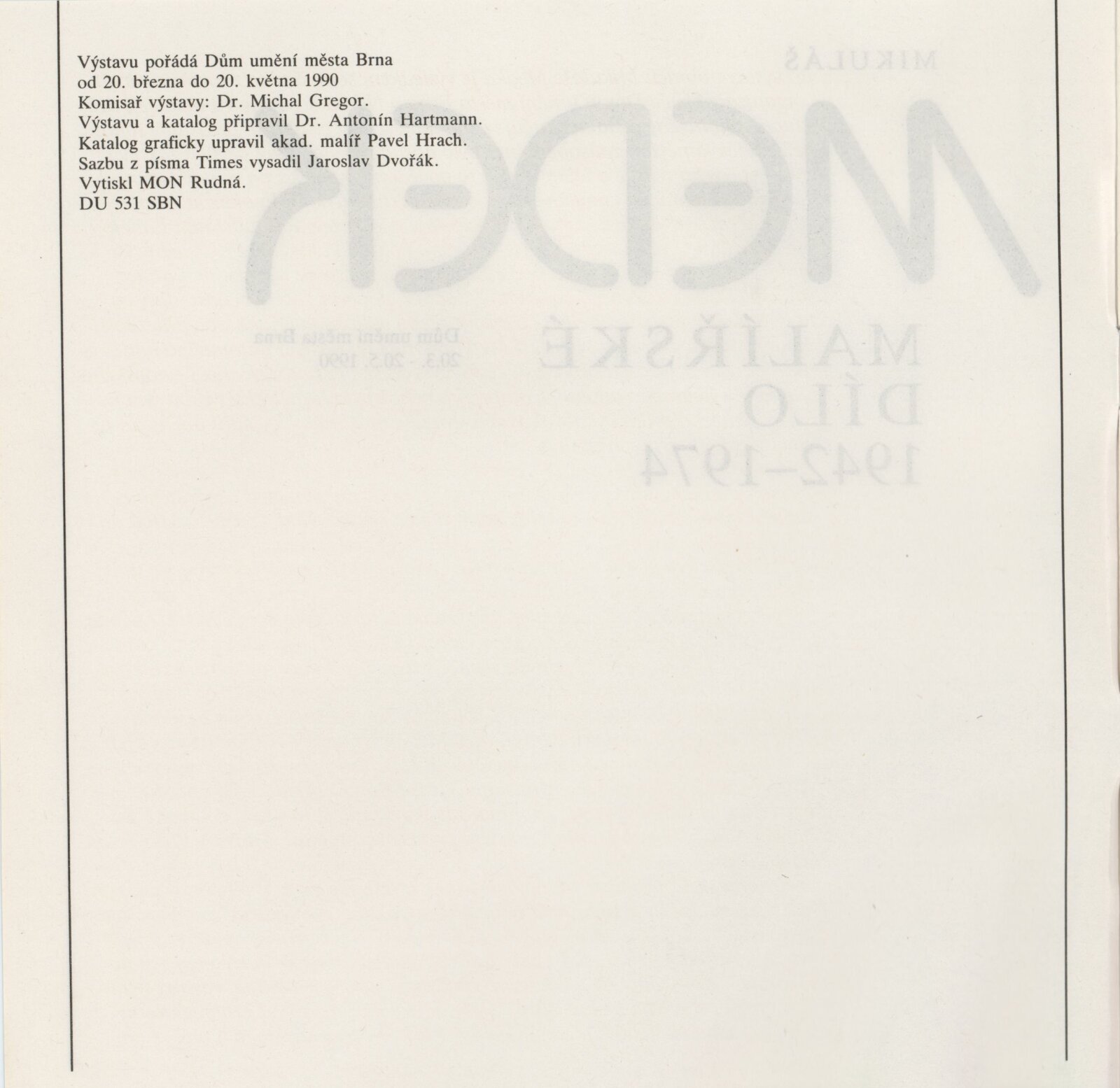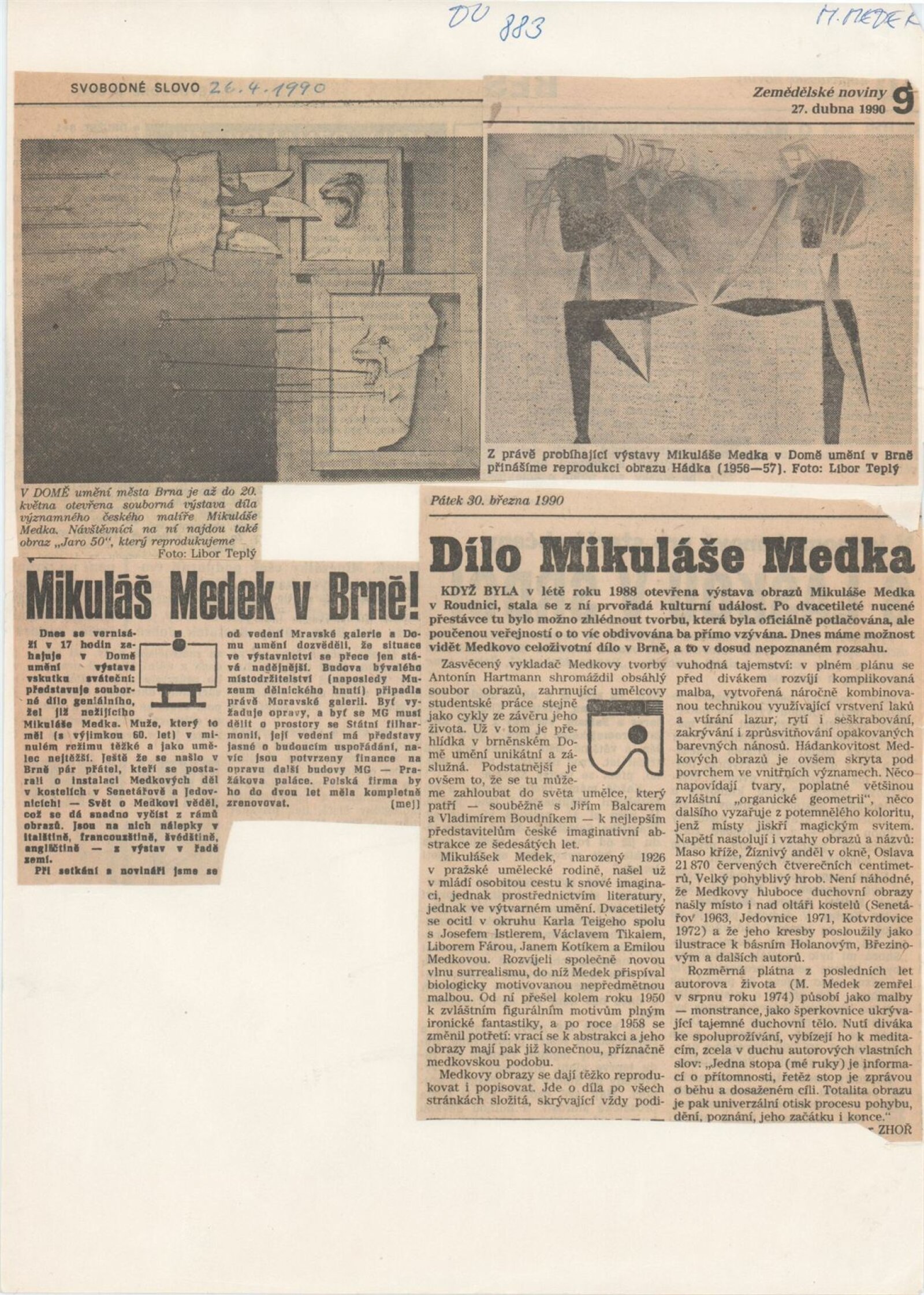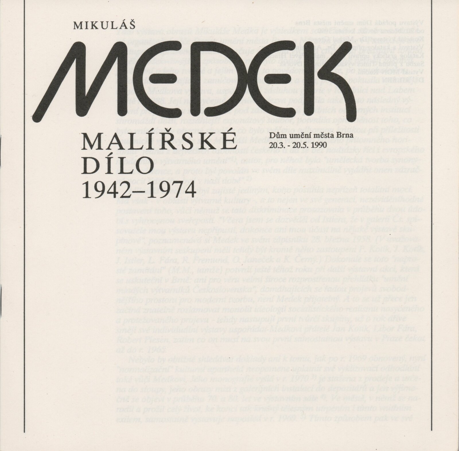 Mikuláš Medek. Malířské dílo 1942–1974: Dům umění města Brna, Galerie Jaroslava Krále, 1. patro, 20. 3. – 20. 5. 1990 / Text: Ivan Medek. – Brno: DUmB, 1990. – [50] s., obr. / Mikuláš Medek. Malířské dílo 1942–1974: Dům umění města Brna, Galerie Jaroslava Krále, 1. patro, 20. 3. – 20. 5. 1990 / Text: Antonín Hartmann. – Brno: DUmB, 1990. – [22] s., obsahuje životopis, seznam výstav, zastoupení ve sbírkách, seznam ilustrací, DU 883. – MZK; MG