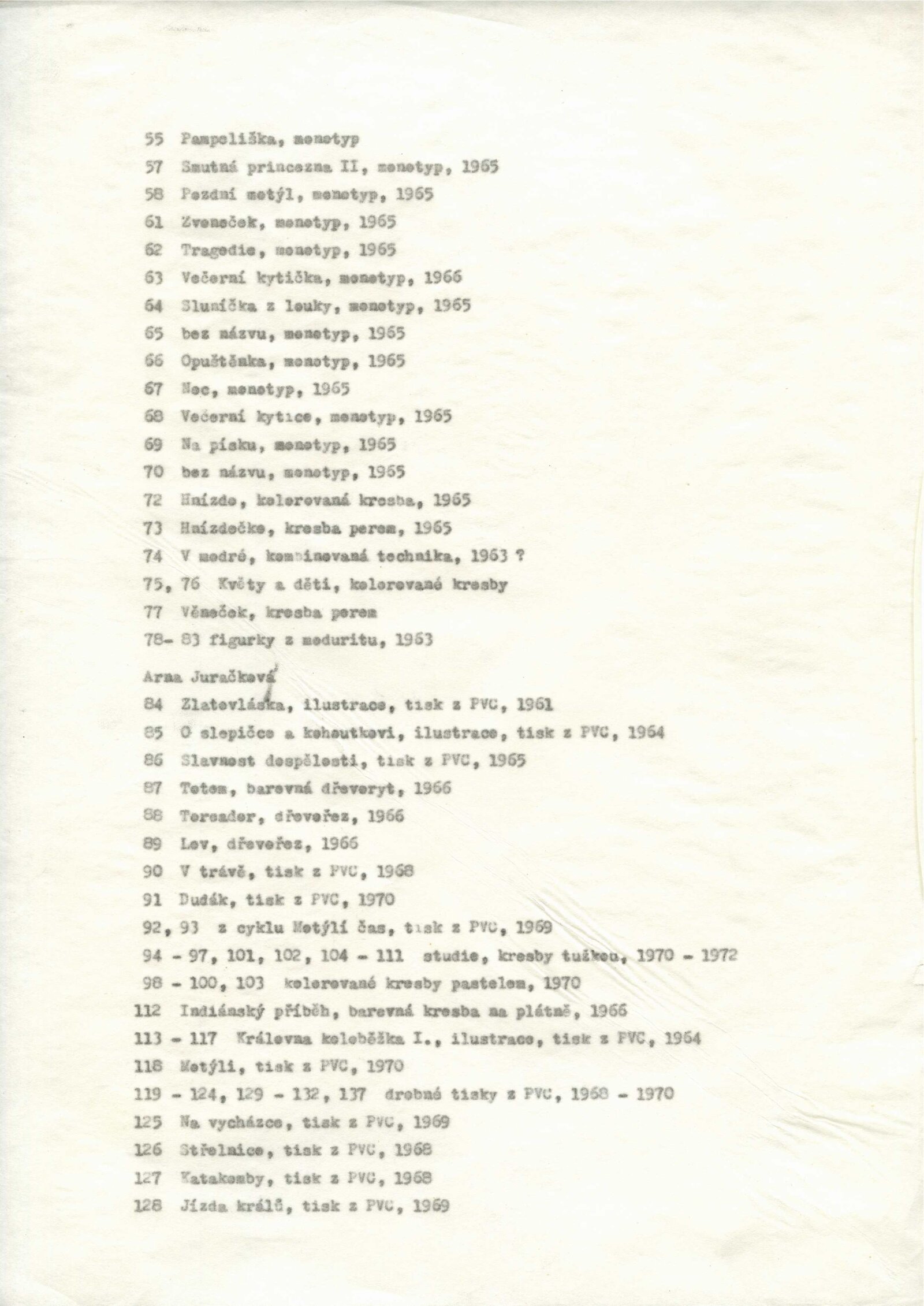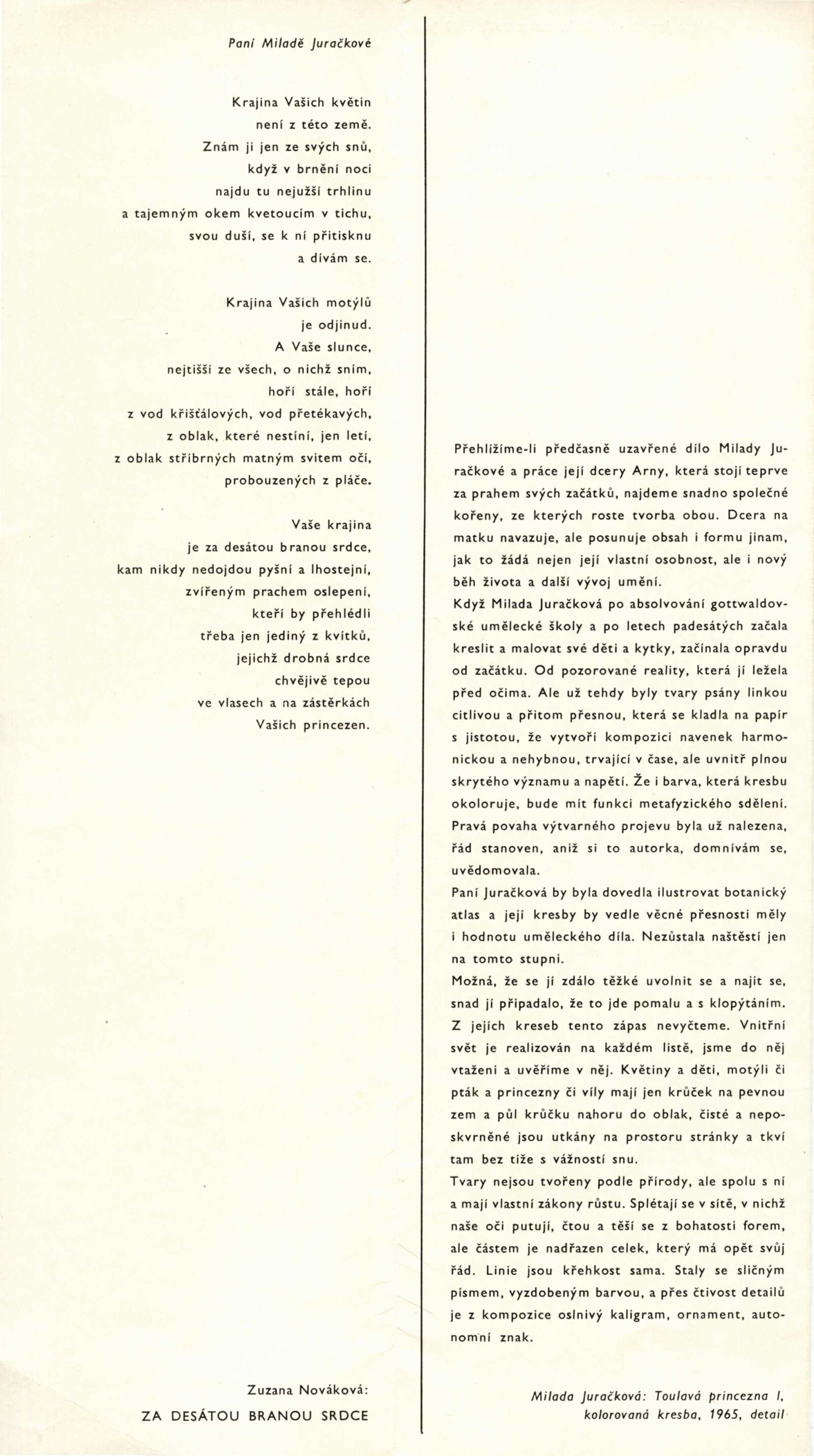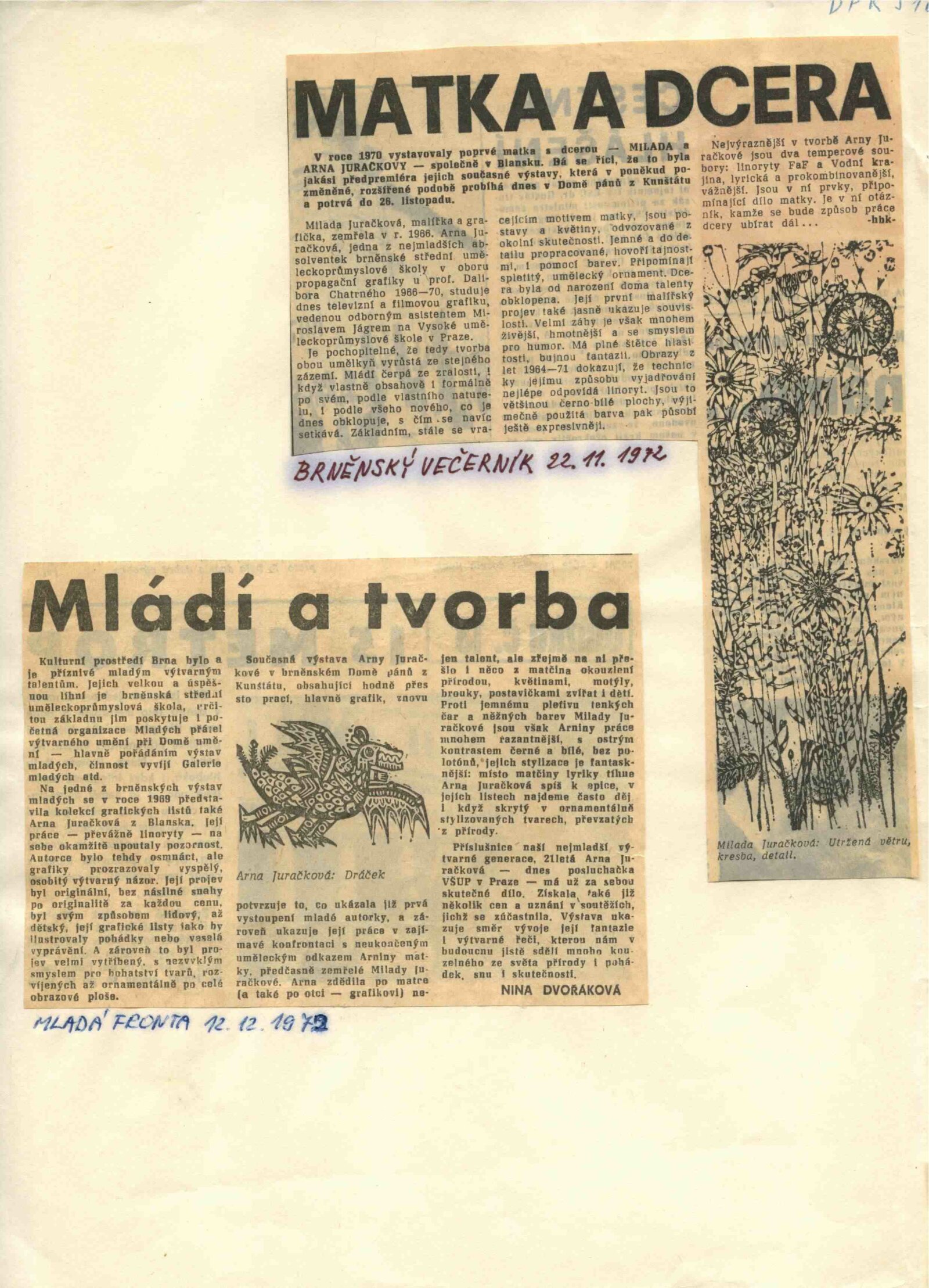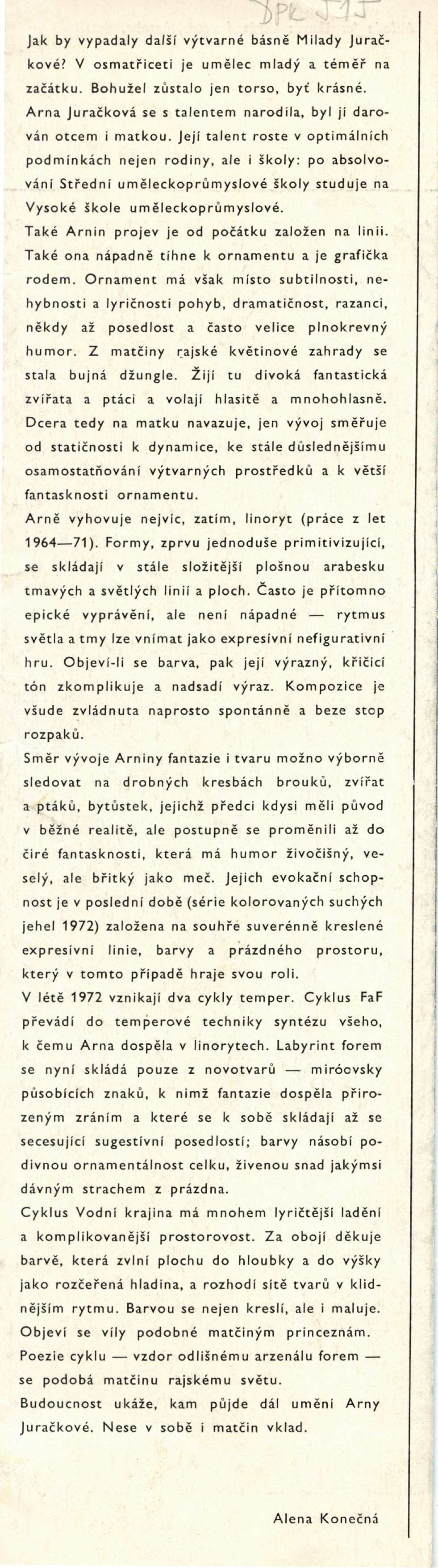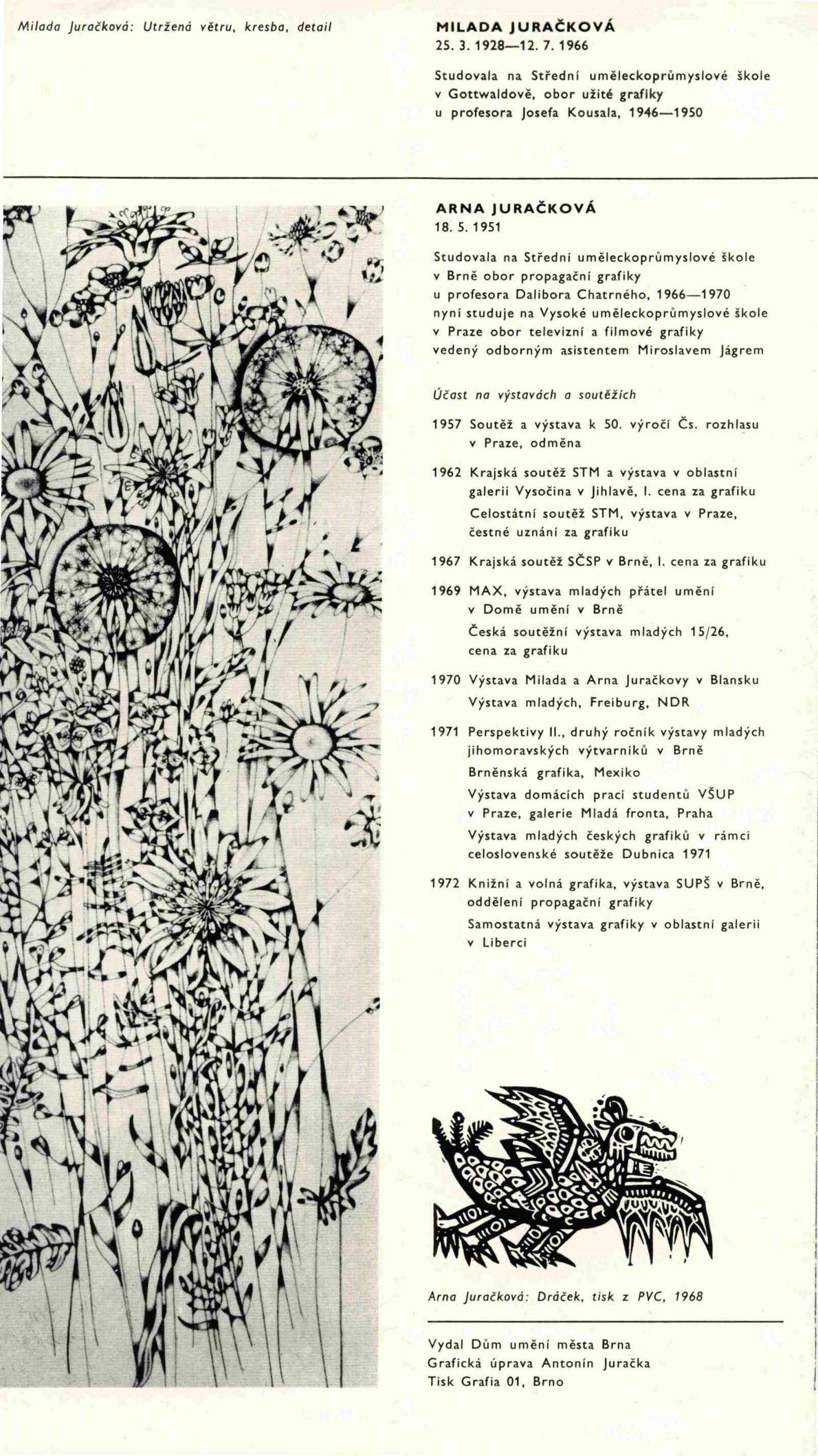 Milada a Arna Juračkovy: Dům umění města Brna / Dům pánů z Kunštátu, 128. výstava Kabinetu grafiky, 3. 11. – 26. 11. 1972 / Text: Alena Konečná. – Brno: DUmB, 1972. – skládačka (10 s., obr.), seznam vystavených prací 2 s., báseň Zuzany Novákové, DPK 516. – MG; MMB