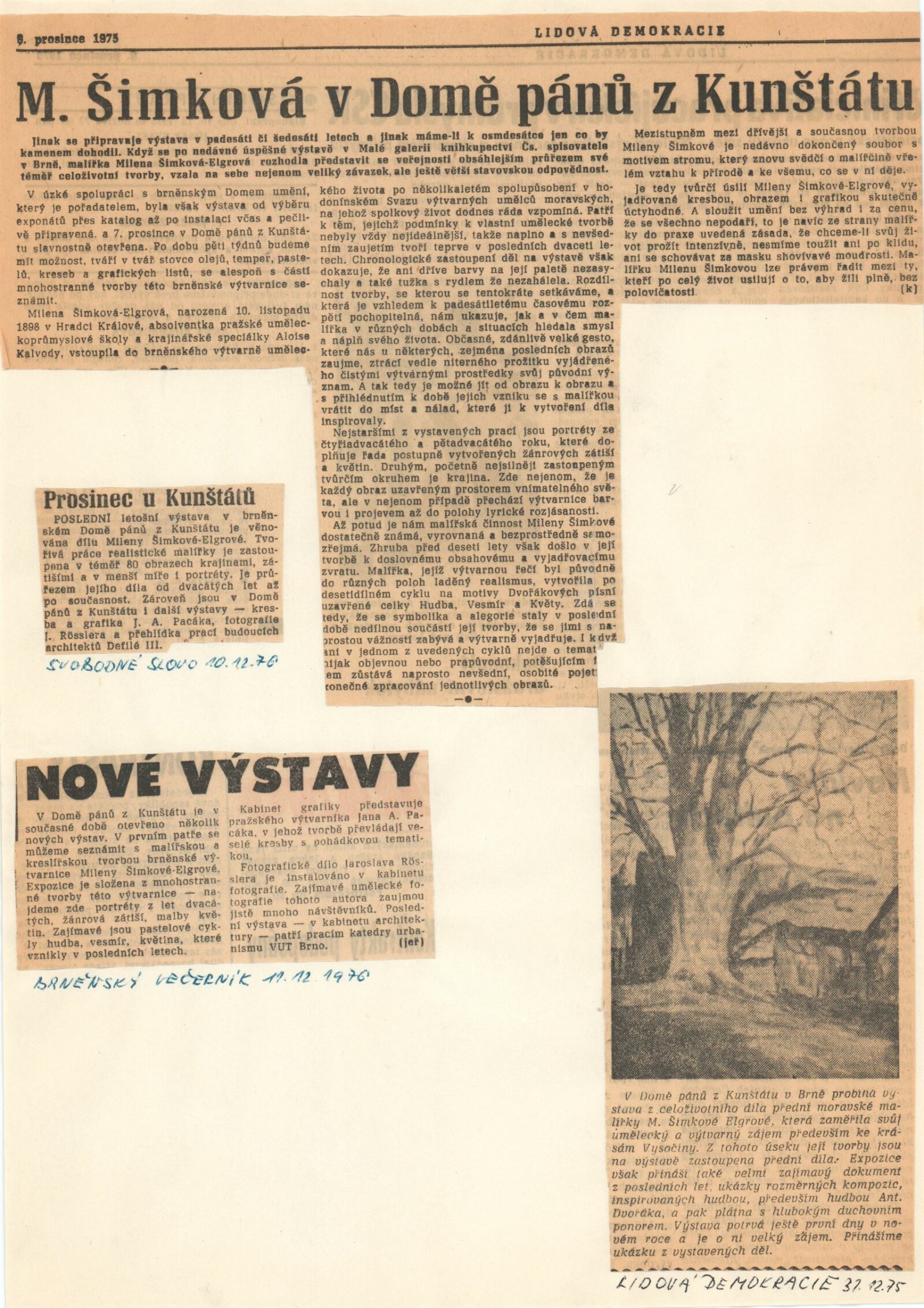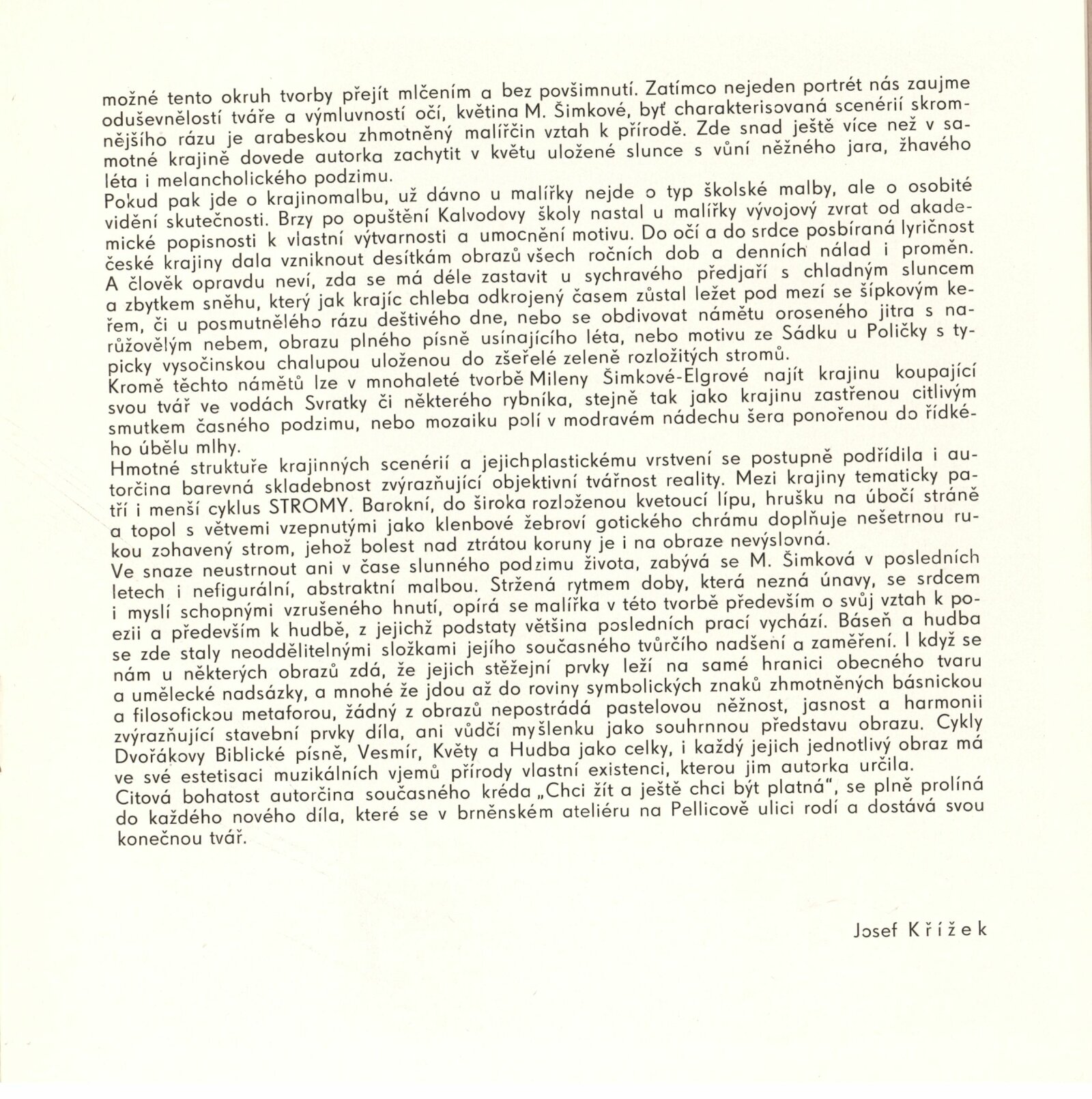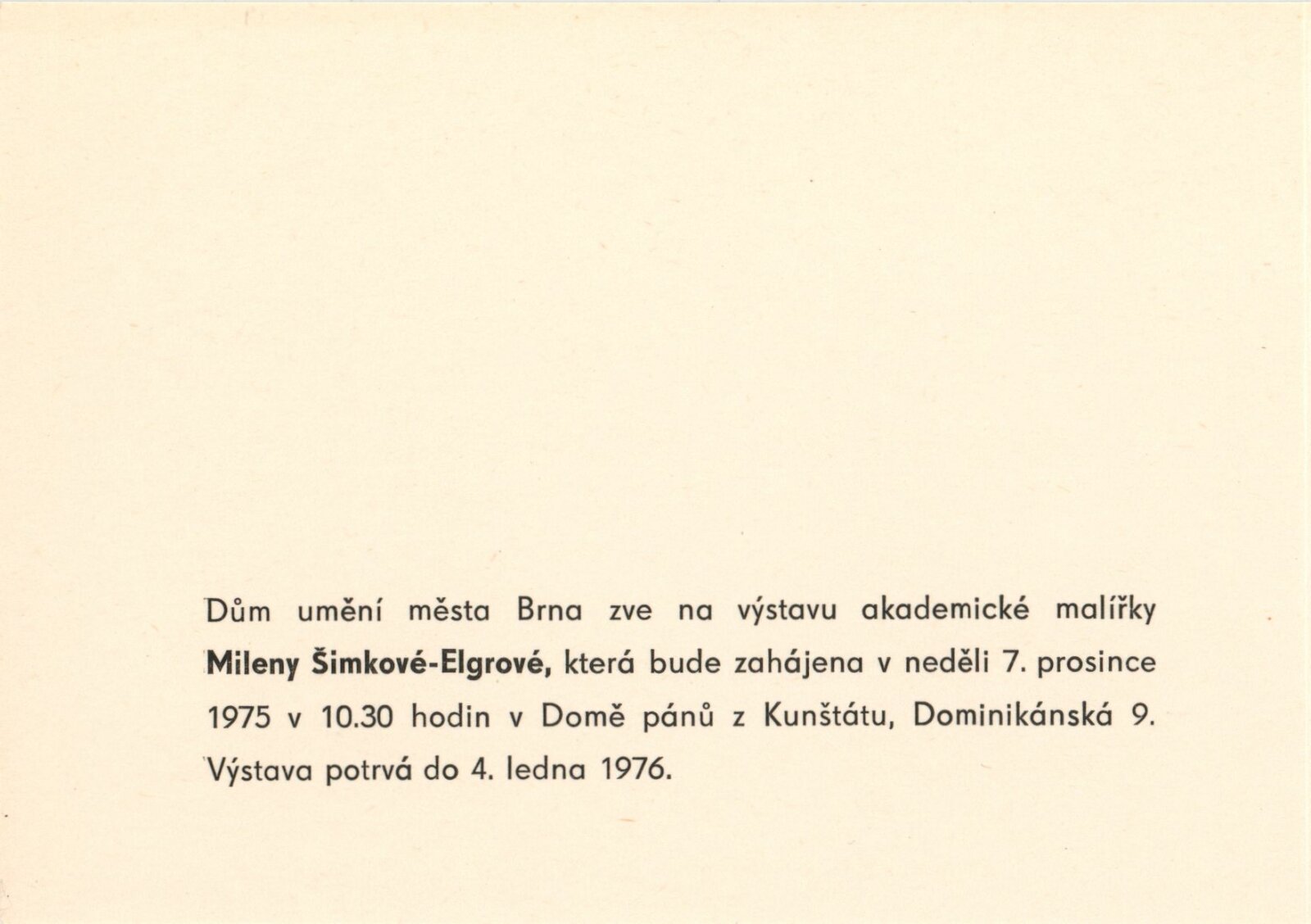 Milena Šimková-Elgrová: Dům umění / Dům pánů z Kunštátu, 7. 12. 1975 – 4. 1. 1976 / Text: Josef Křížek. – Brno: DUmB, 1975. – 16 s., obr., životní data DPK 615; MZK; MMB
