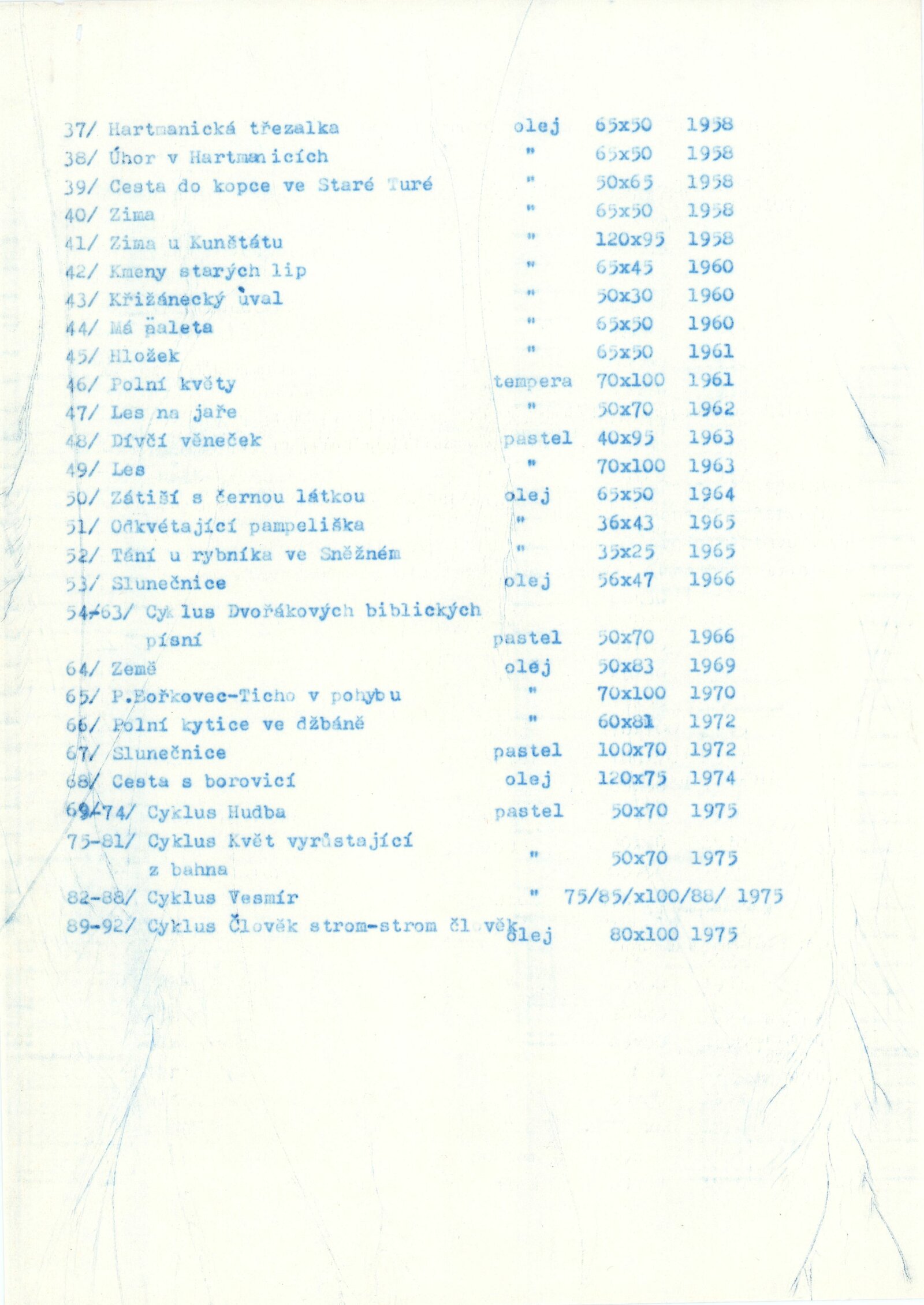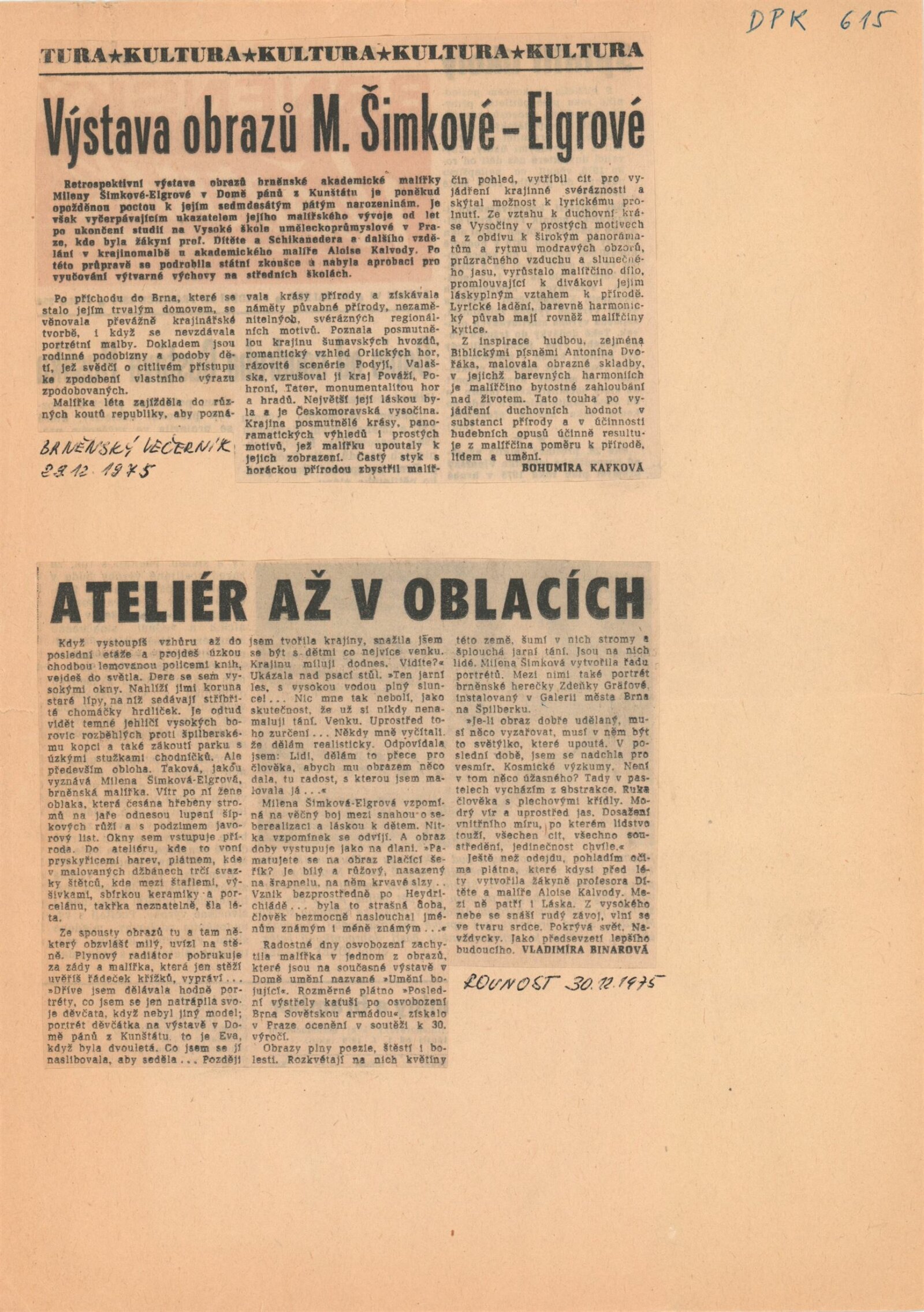 pozvánka, katalog, strojopis textu, text o výstavě od Jany Vránové, fotografie výstavy, text katalogu, seznam vystavených děl, zpráva o vernisáži, hospodářská smlouva s autorkou, korespondence (vyjádření výboru KO SČVU k plánu výstav a dopis autorce o tomto vyjádření), žádost o povolení výstavy, recenze v tisku, pozvánka na výstavu Mileny Šimkové-Elgrové v Malé galerii knihkupectví Čs. spisovatel v Brně (1975)