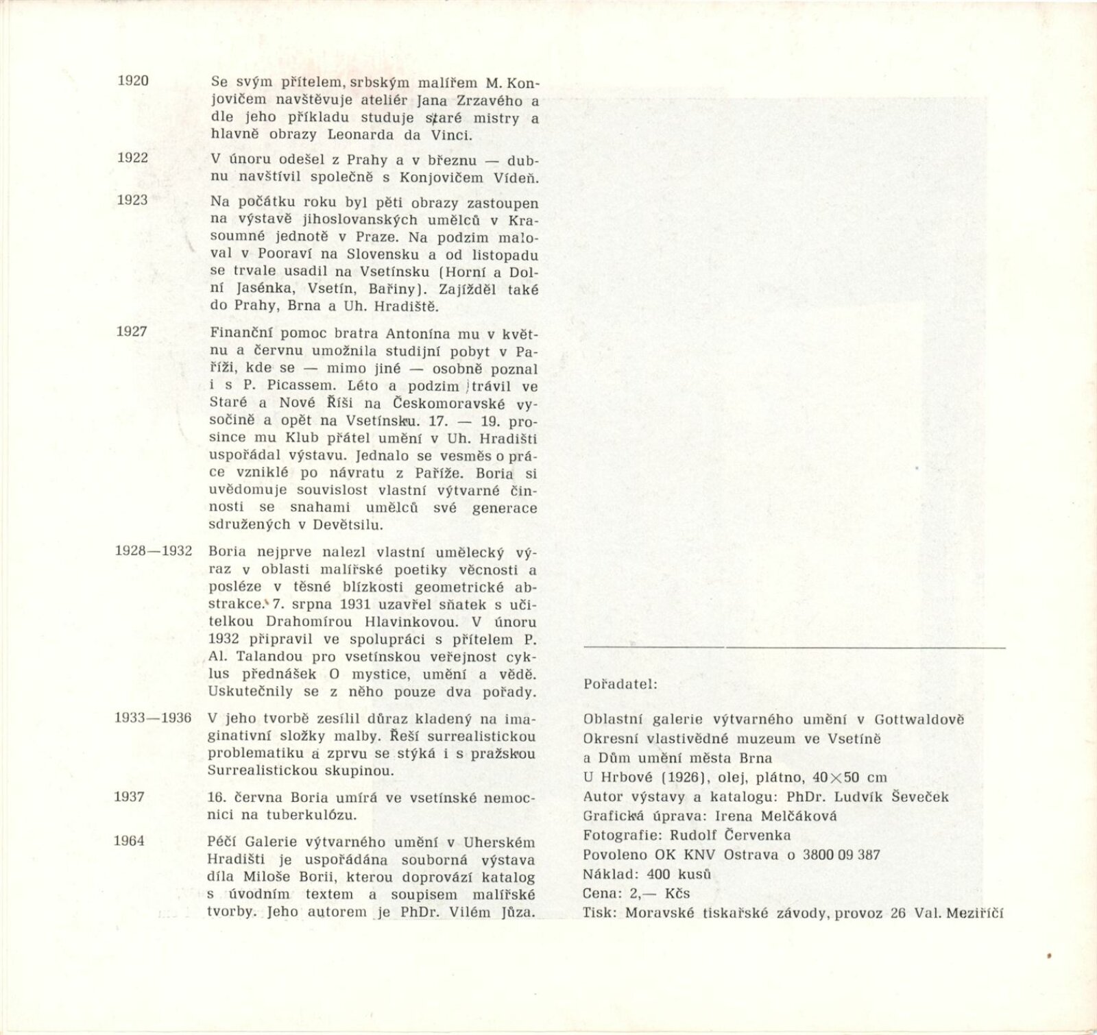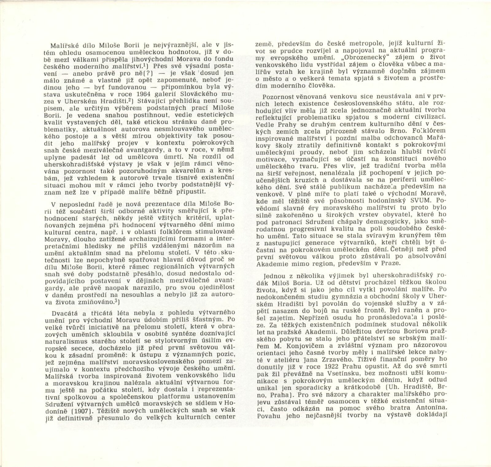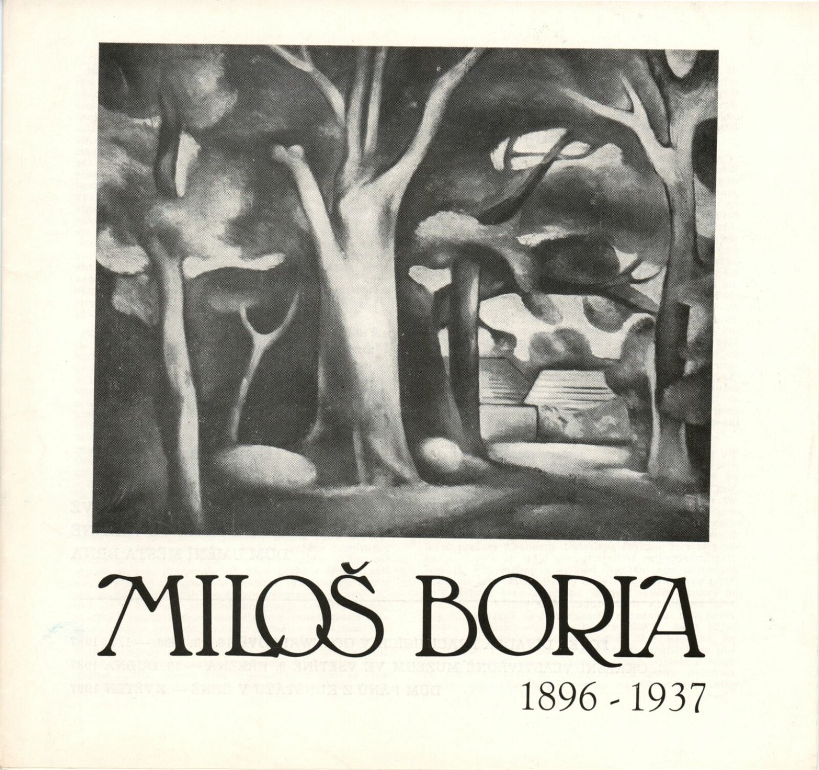 Miloš Boria 1896–1937: Dům pánů z Kunštátu v Brně [spr. Galerie Stará radnice], 19. 5. – 2. 8. 1987 / Text: Ludvik Ševeček. – Gottwaldov: Oblastní galerie výtvarného umění, 1987. – [8] s., obr., životní data, GSR 4. – MZK; MG; MMB