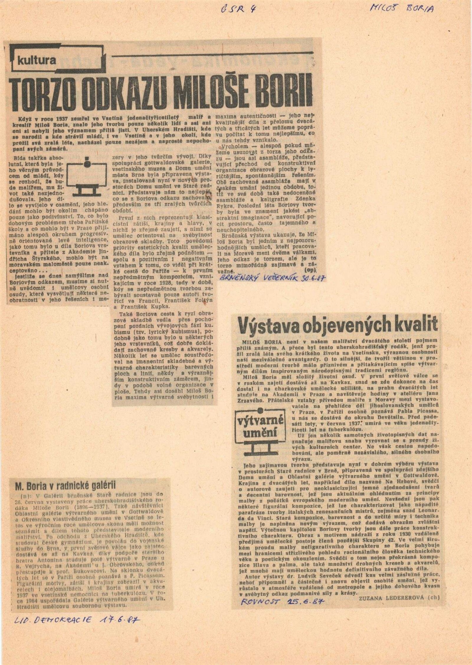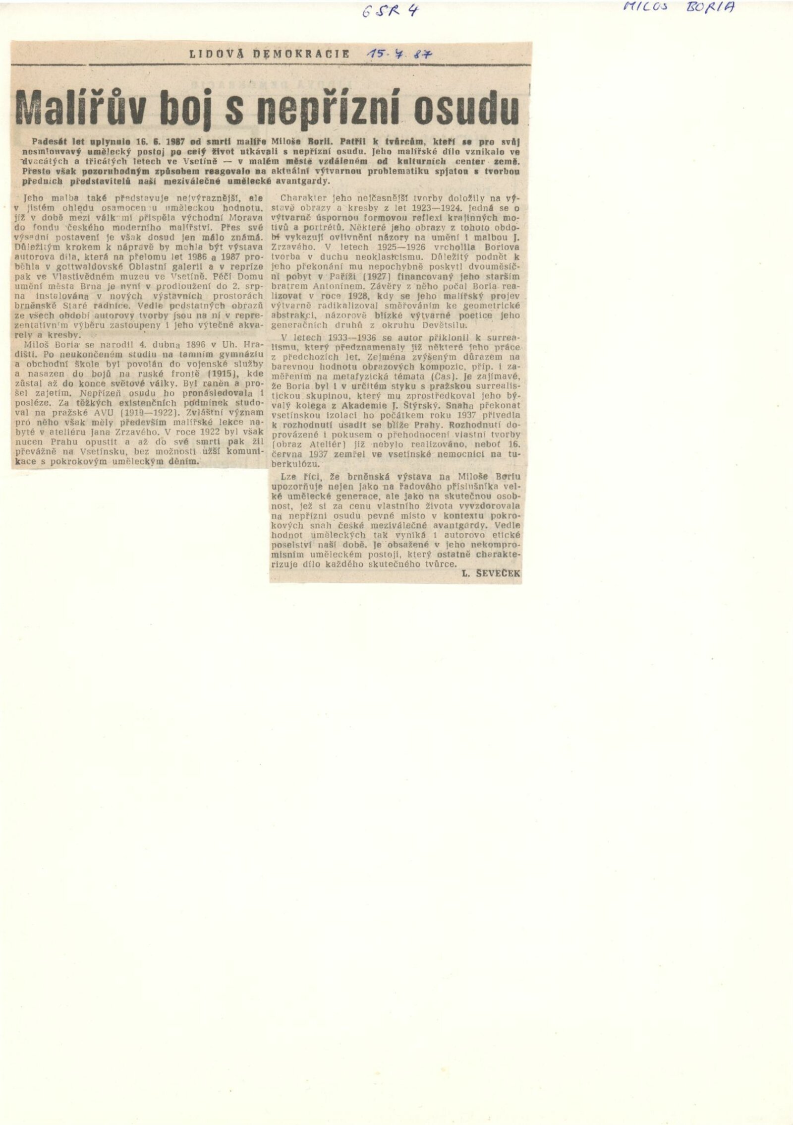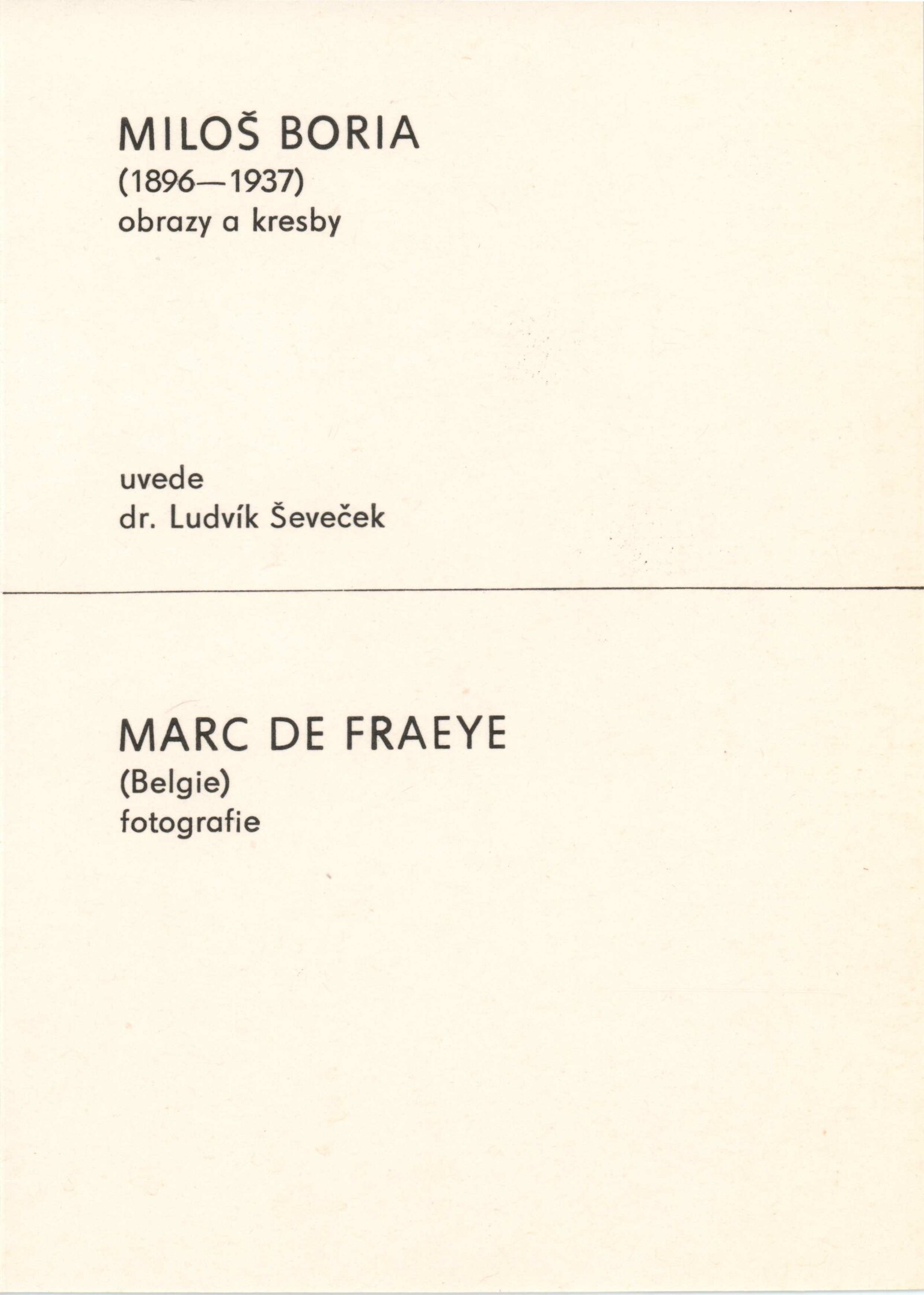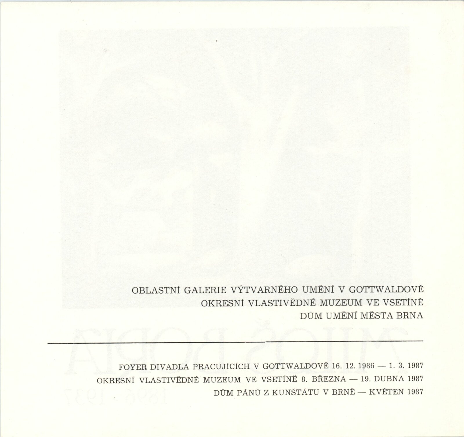 Miloš Boria 1896–1937: Dům pánů z Kunštátu v Brně [spr. Galerie Stará radnice], 19. 5. – 2. 8. 1987 / Text: Ludvik Ševeček. – Gottwaldov: Oblastní galerie výtvarného umění, 1987. – [8] s., obr., životní data, GSR 4. – MZK; MG; MMB